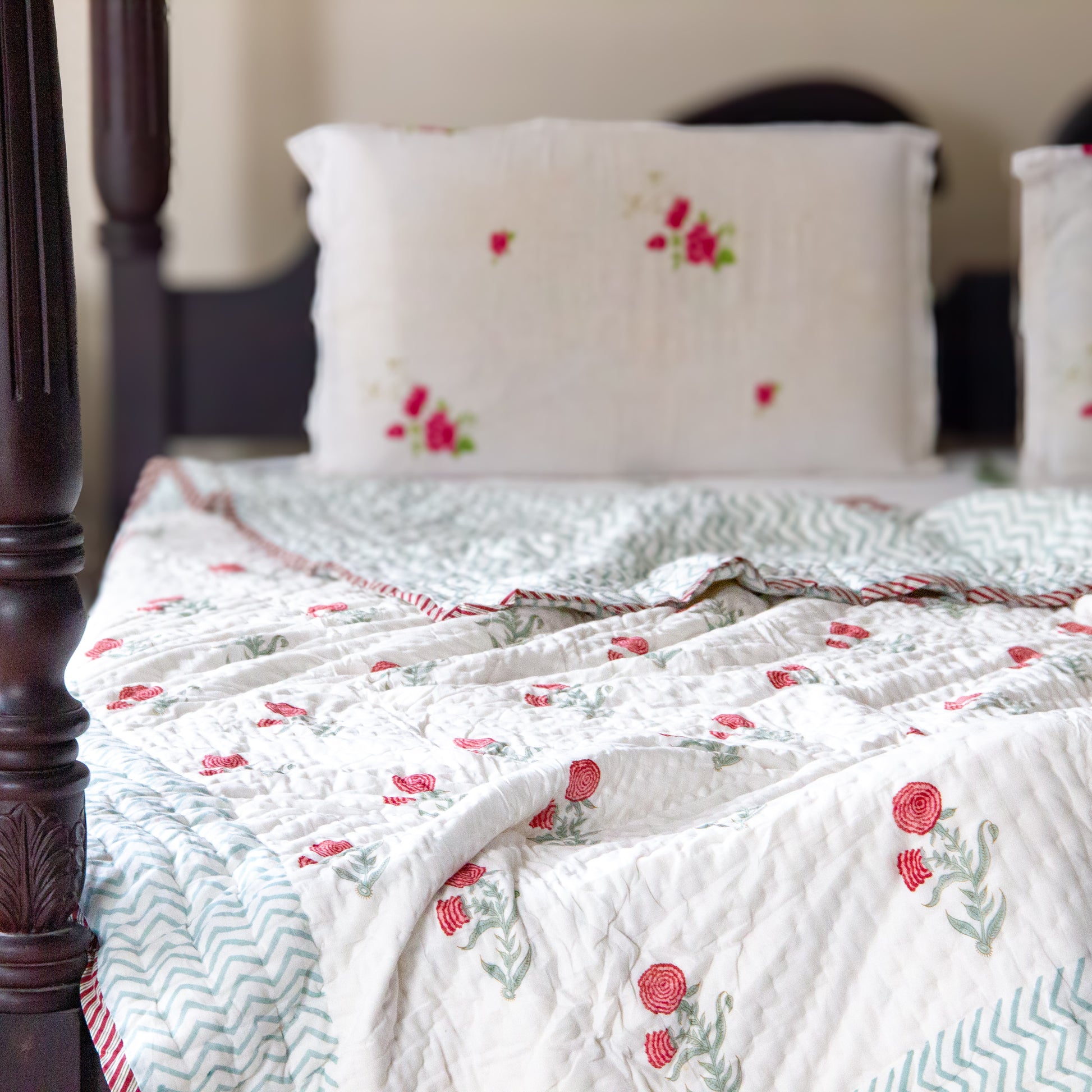 Hand block printed reversible quilts are a type of traditional Indian quilts made by skilled artisans using hand-carved wooden blocks to print intricate designs onto fabric. These quilts are reversible, meaning they have a different pattern on each side, allowing for versatility in home decor. They are made with high-quality cotton for warmth and comfort.