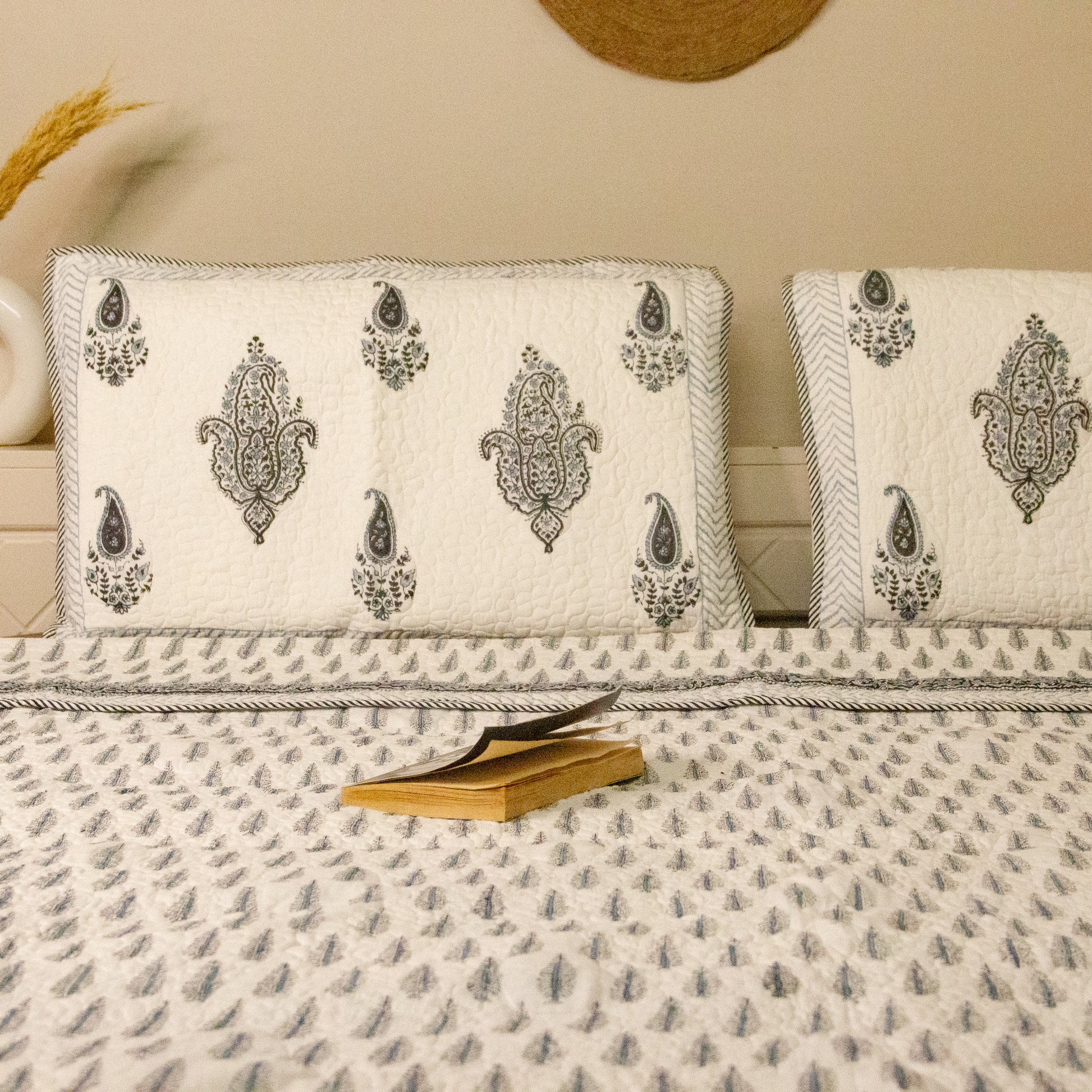 Reversible quilted bed covers are bedding accessories that are designed with a quilted construction, made by stitching together multiple layers of fabric to create a thick, warm cover that can be used to keep a bed cozy and comfortable. These bed covers have two different patterns or colours on each side, allowing you to switch up the look of your bedding depending on your mood or decor.