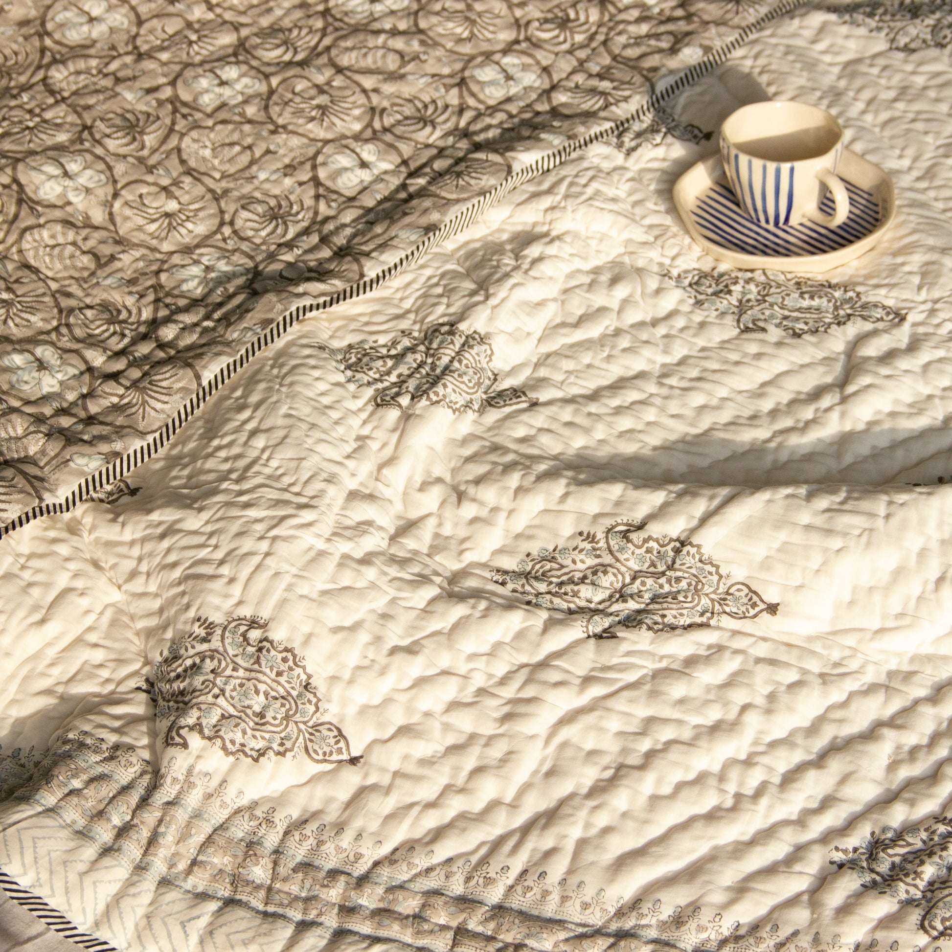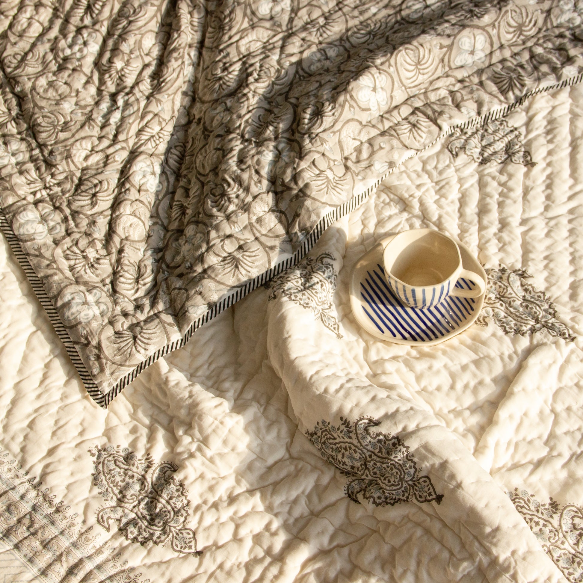 Hand block printed reversible quilts are a type of traditional Indian quilts made by skilled artisans using hand-carved wooden blocks to print intricate designs onto fabric. These quilts are reversible, meaning they have a different pattern on each side, allowing for versatility in home decor. They are made with high-quality cotton for warmth and comfort.