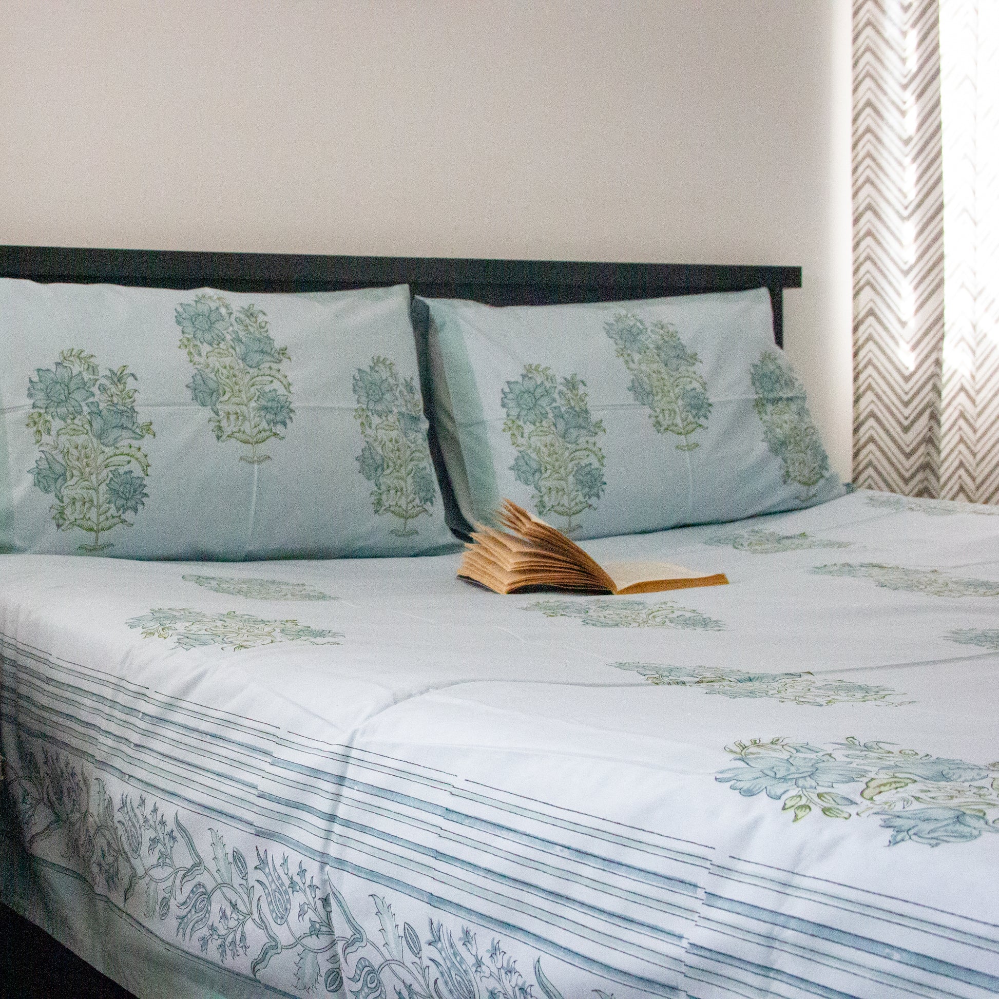Hand block printed bedsheets are bed linens that are adorned with intricate designs created using a traditional printing method known as block printing. This process involves stamping a block made of wood or other materials with a design carved into it onto a piece of fabric, creating a pattern or motif that is repeated across the fabric.