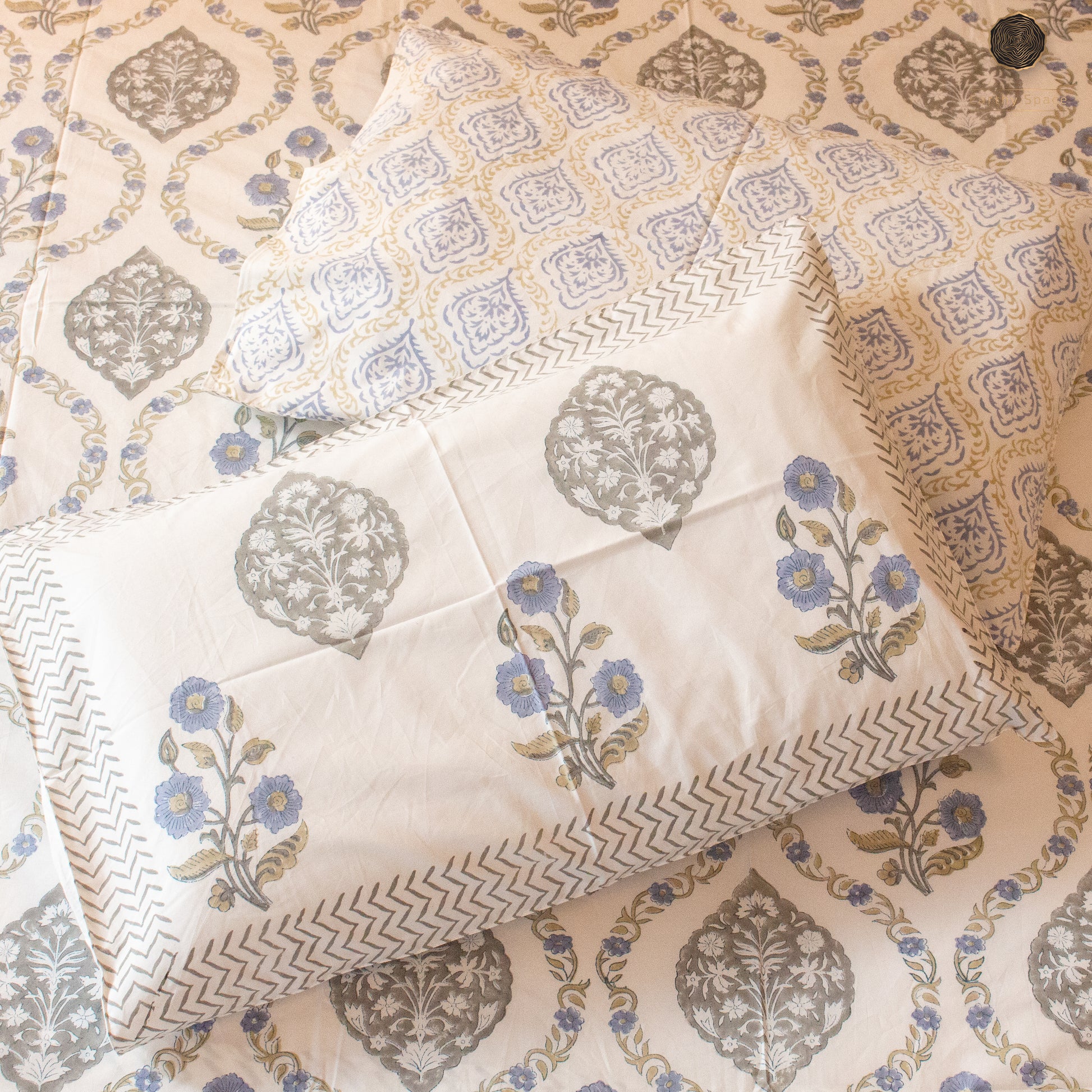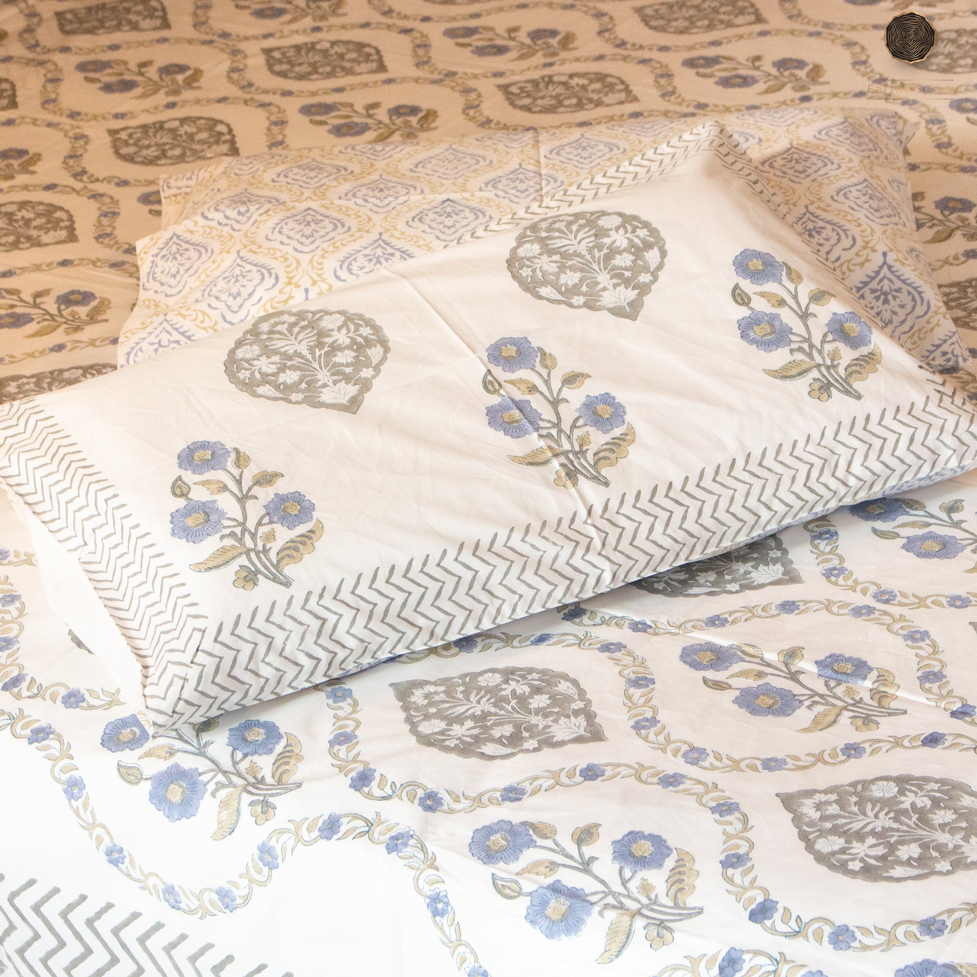 Hand block printed bedsheets are bed linens that are adorned with intricate designs created using a traditional printing method known as block printing. This process involves stamping a block made of wood or other materials with a design carved into it onto a piece of fabric, creating a pattern or motif that is repeated across the fabric.