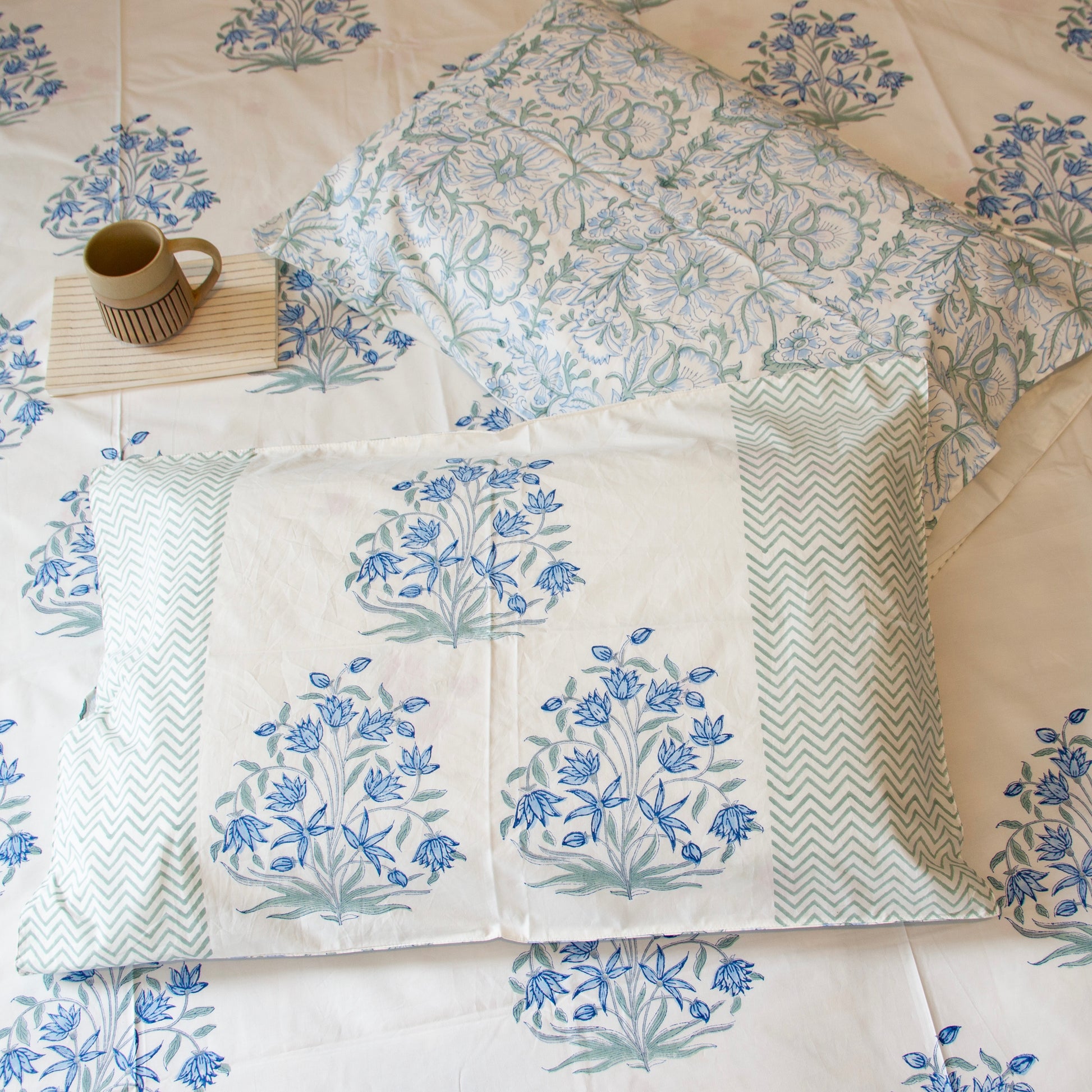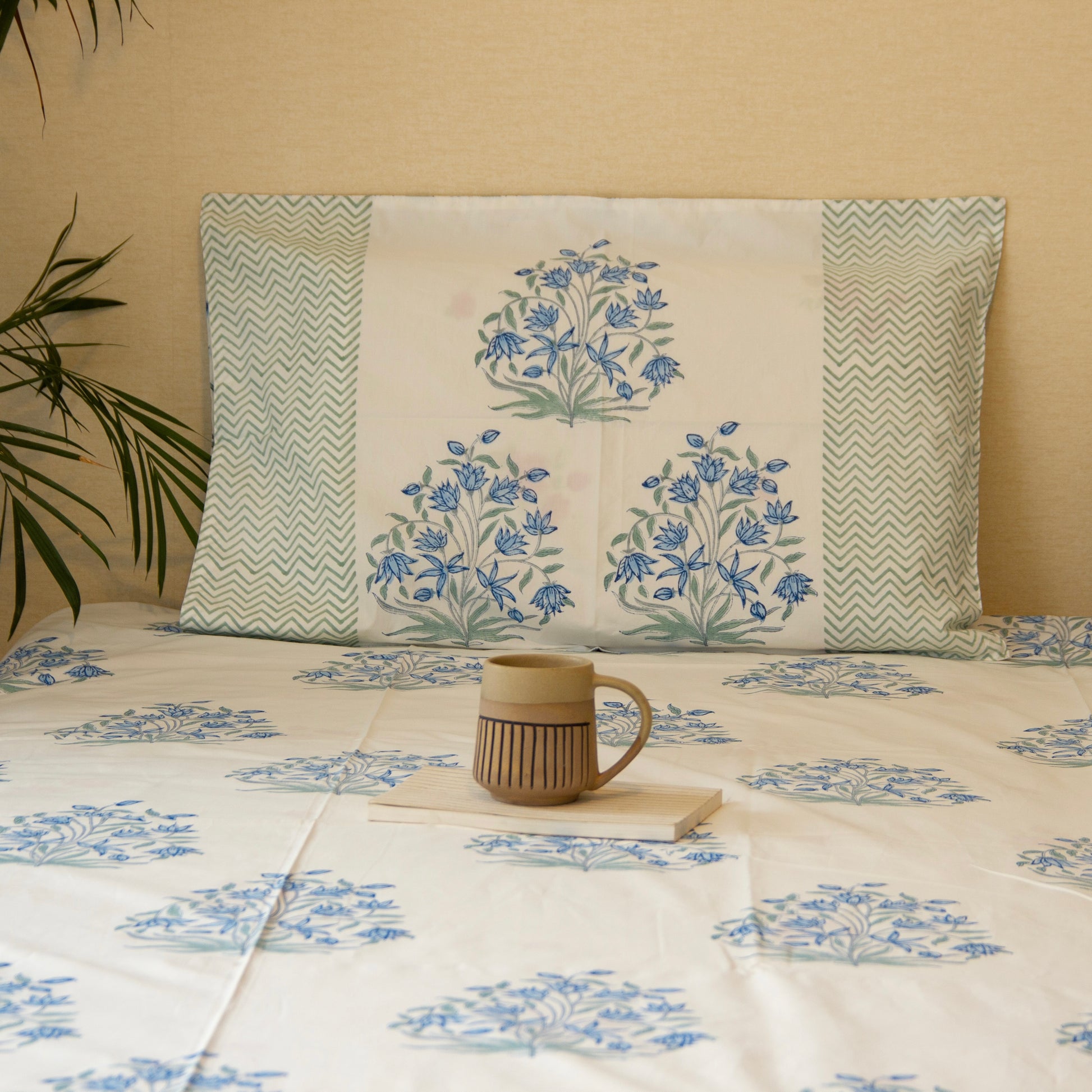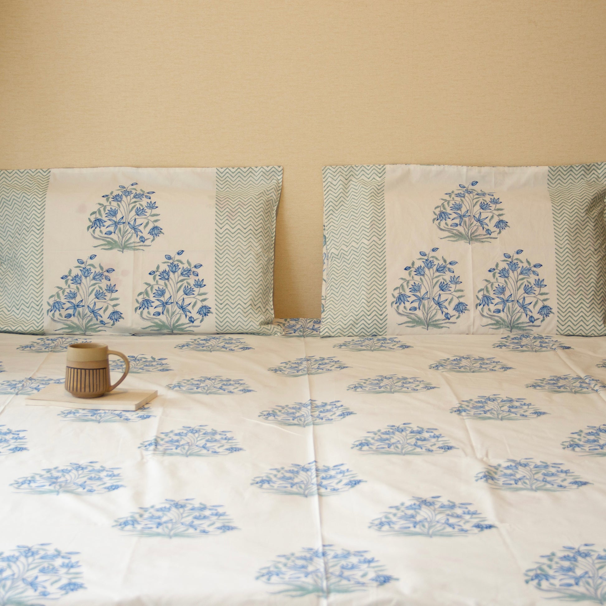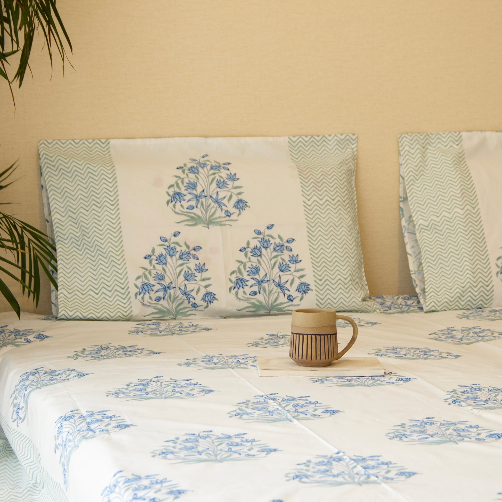 Hand block printed bedsheets are bed linens that are adorned with intricate designs created using a traditional printing method known as block printing. This process involves stamping a block made of wood or other materials with a design carved into it onto a piece of fabric, creating a pattern or motif that is repeated across the fabric.