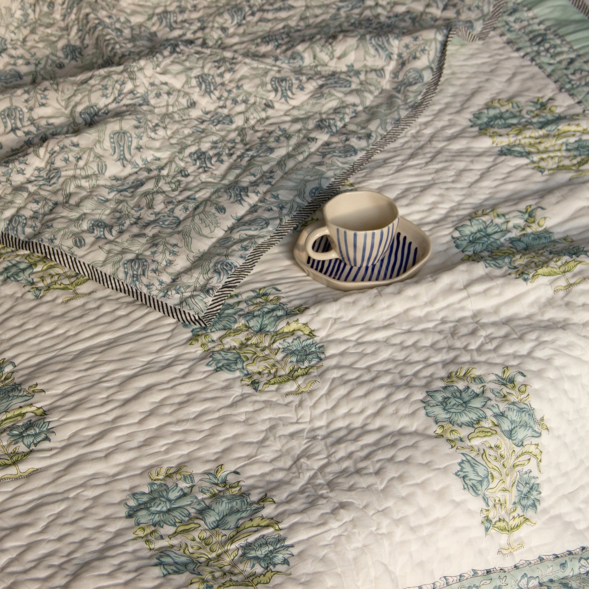 Hand block printed reversible quilts are a type of traditional Indian quilts made by skilled artisans using hand-carved wooden blocks to print intricate designs onto fabric. These quilts are reversible, meaning they have a different pattern on each side, allowing for versatility in home decor. They are made with high-quality cotton for warmth and comfort.