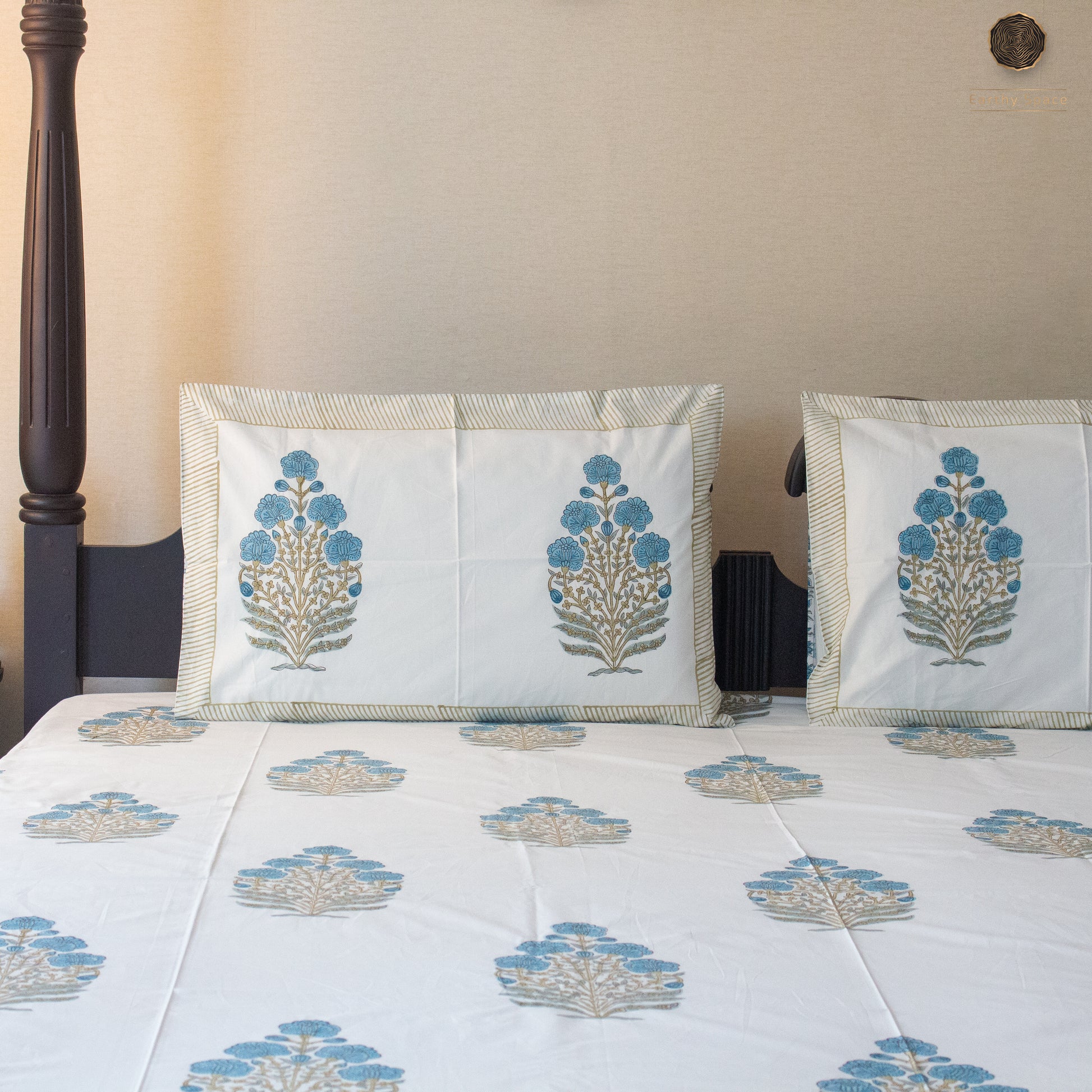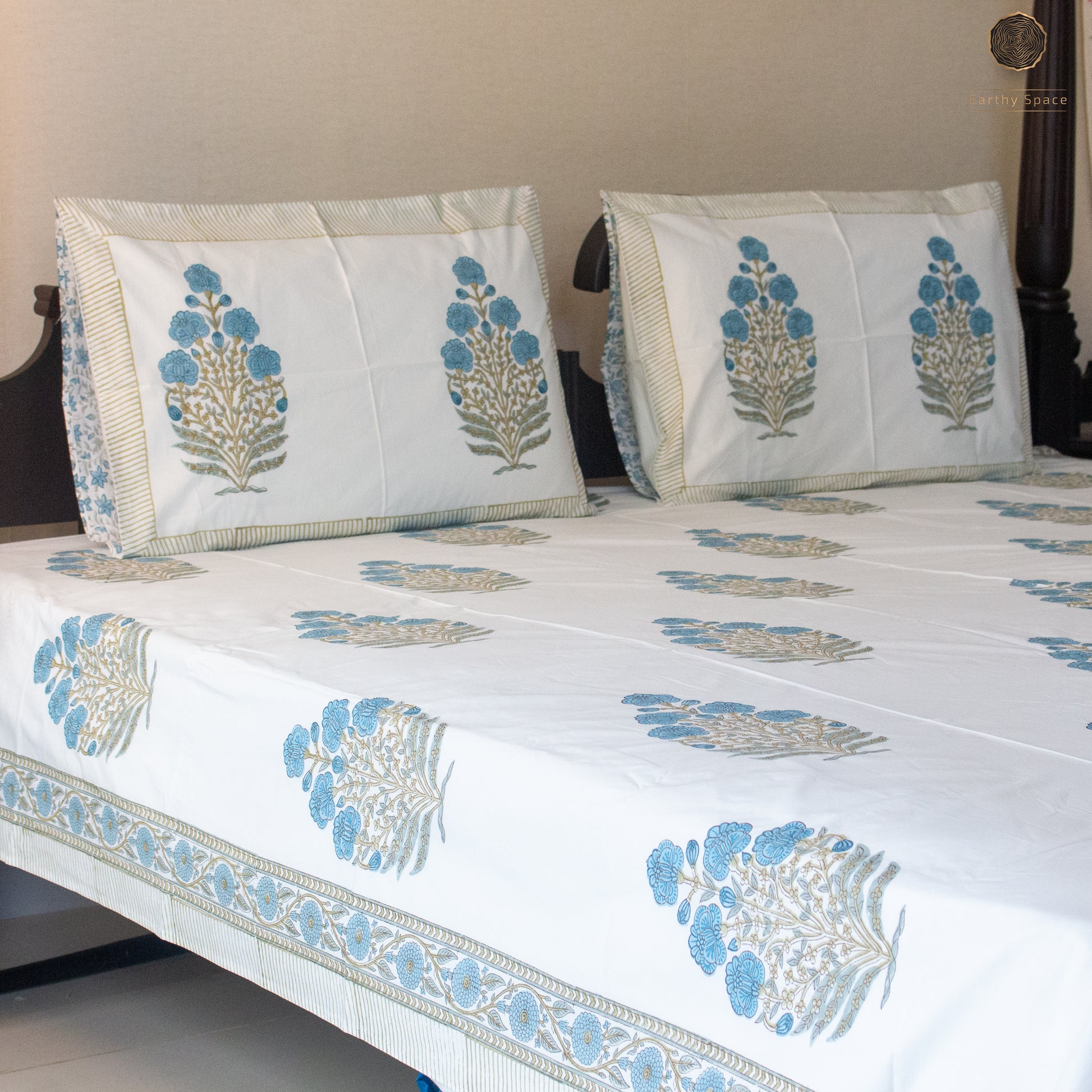 Hand block printed bedsheets are bed linens that are adorned with intricate designs created using a traditional printing method known as block printing. This process involves stamping a block made of wood or other materials with a design carved into it onto a piece of fabric, creating a pattern or motif that is repeated across the fabric.