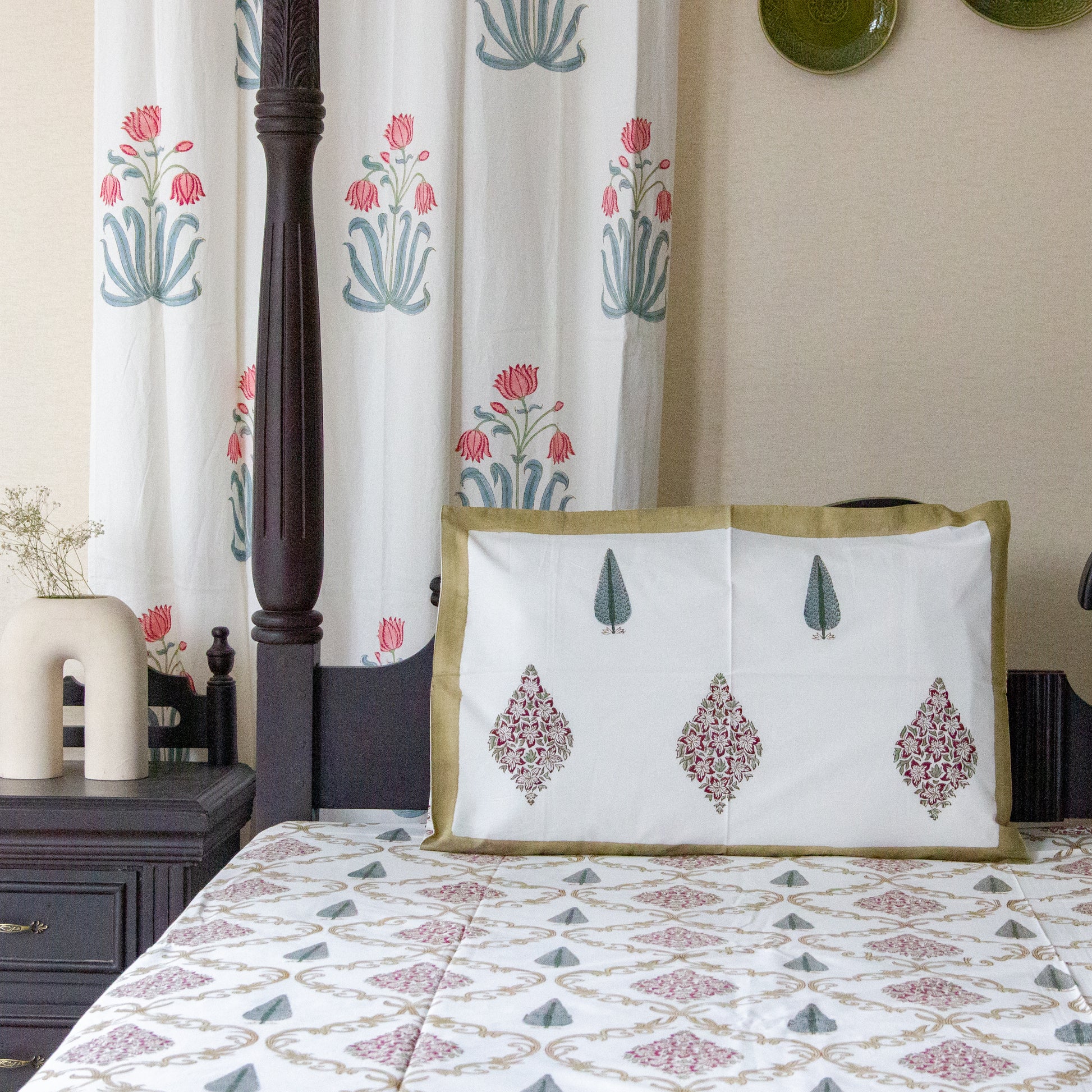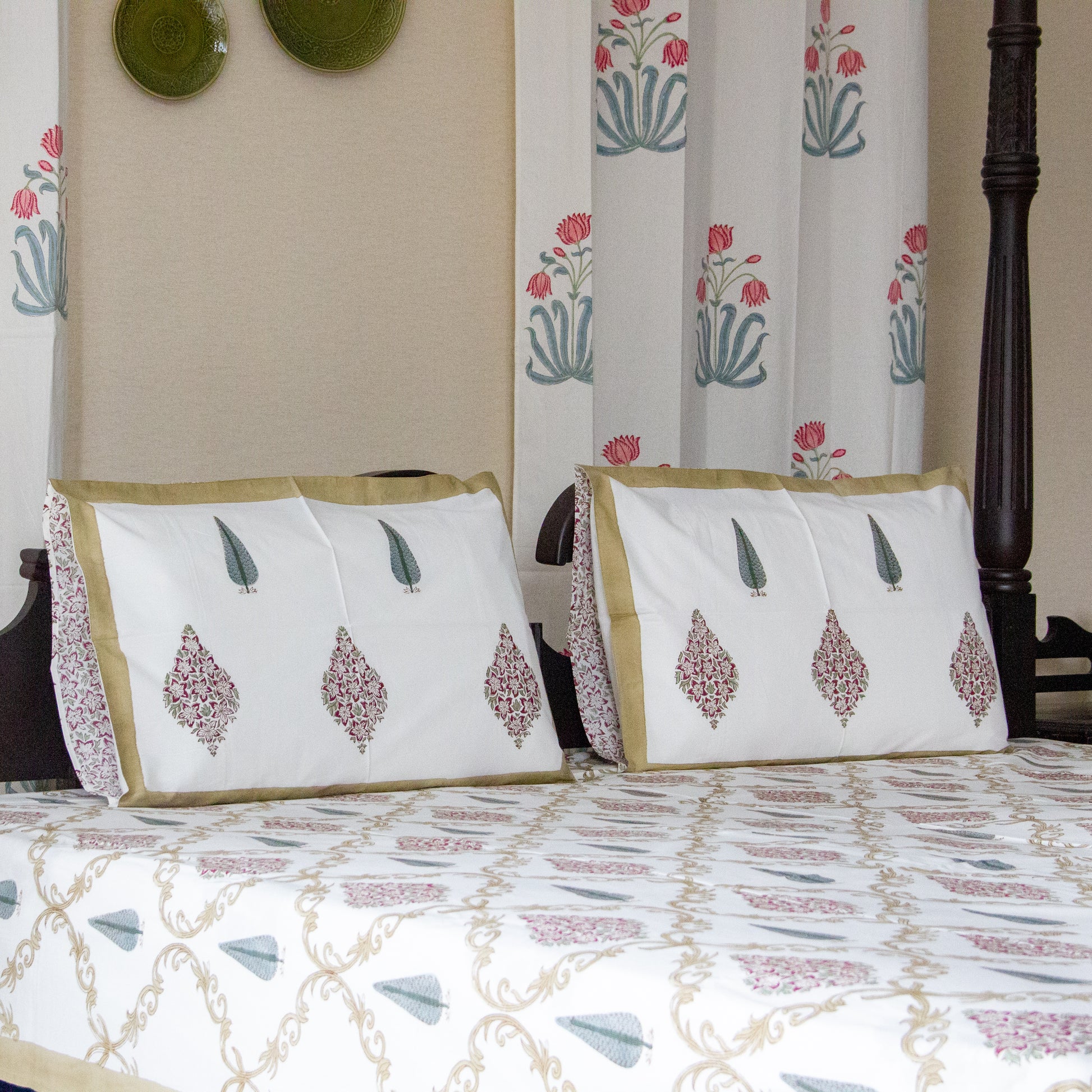 Hand block printed bedsheets are bed linens that are adorned with intricate designs created using a traditional printing method known as block printing. This process involves stamping a block made of wood or other materials with a design carved into it onto a piece of fabric, creating a pattern or motif that is repeated across the fabric.