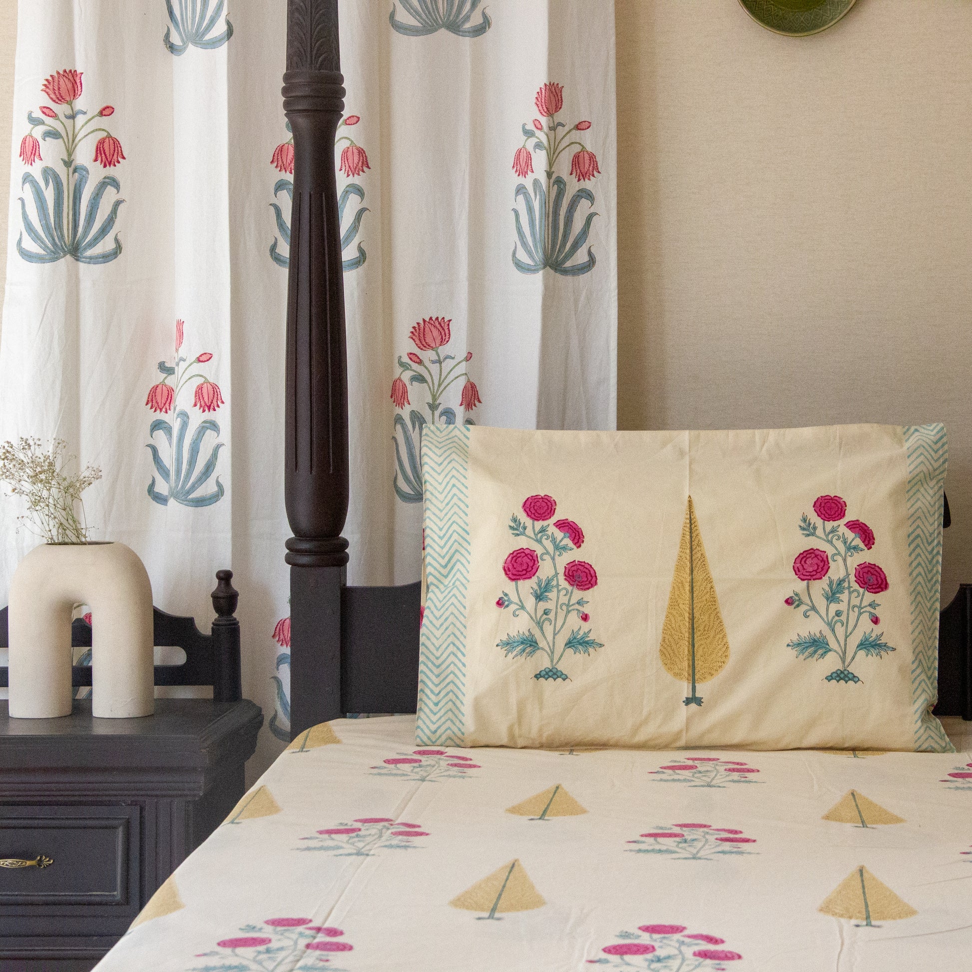 Hand block printed bedsheets are bed linens that are adorned with intricate designs created using a traditional printing method known as block printing. This process involves stamping a block made of wood or other materials with a design carved into it onto a piece of fabric, creating a pattern or motif that is repeated across the fabric.