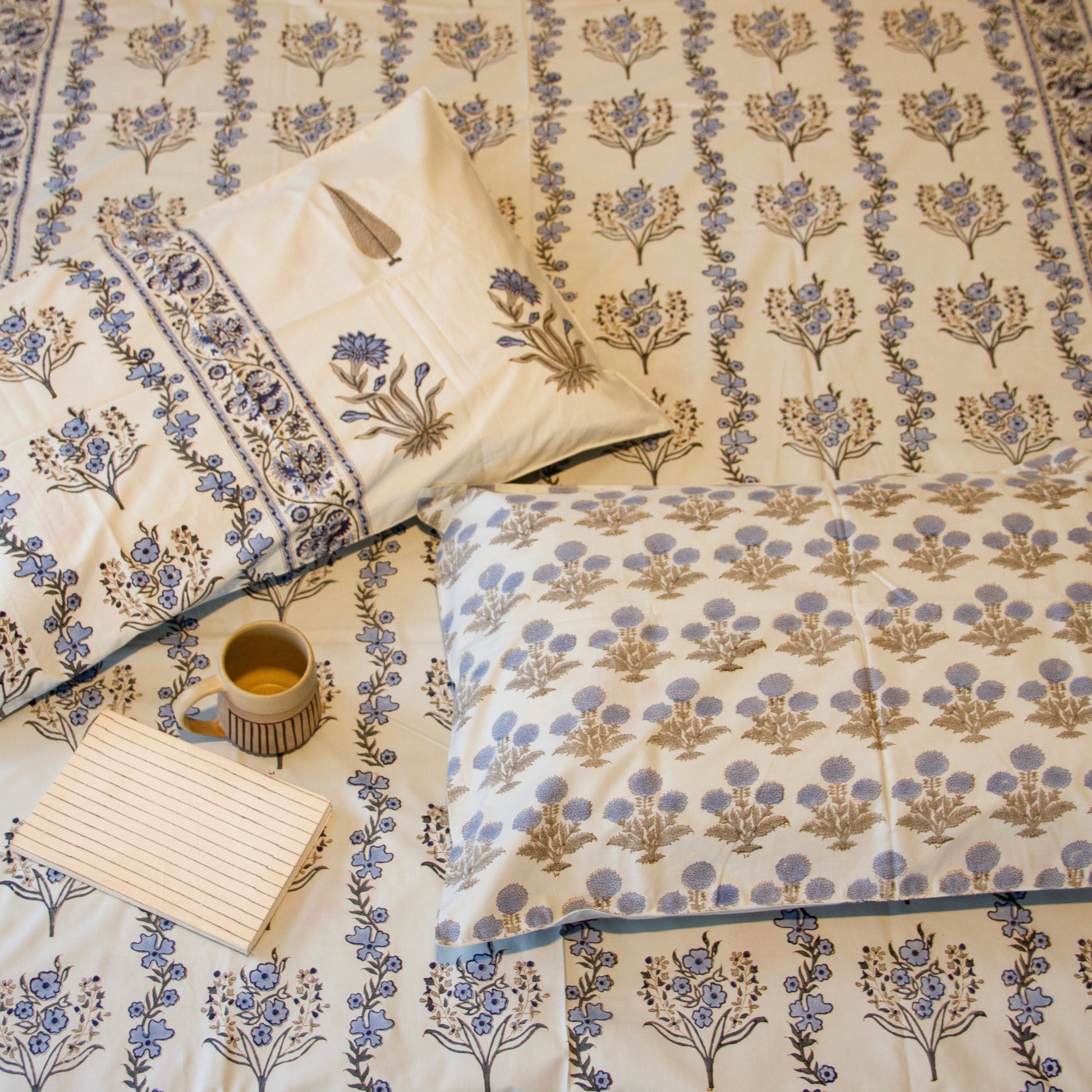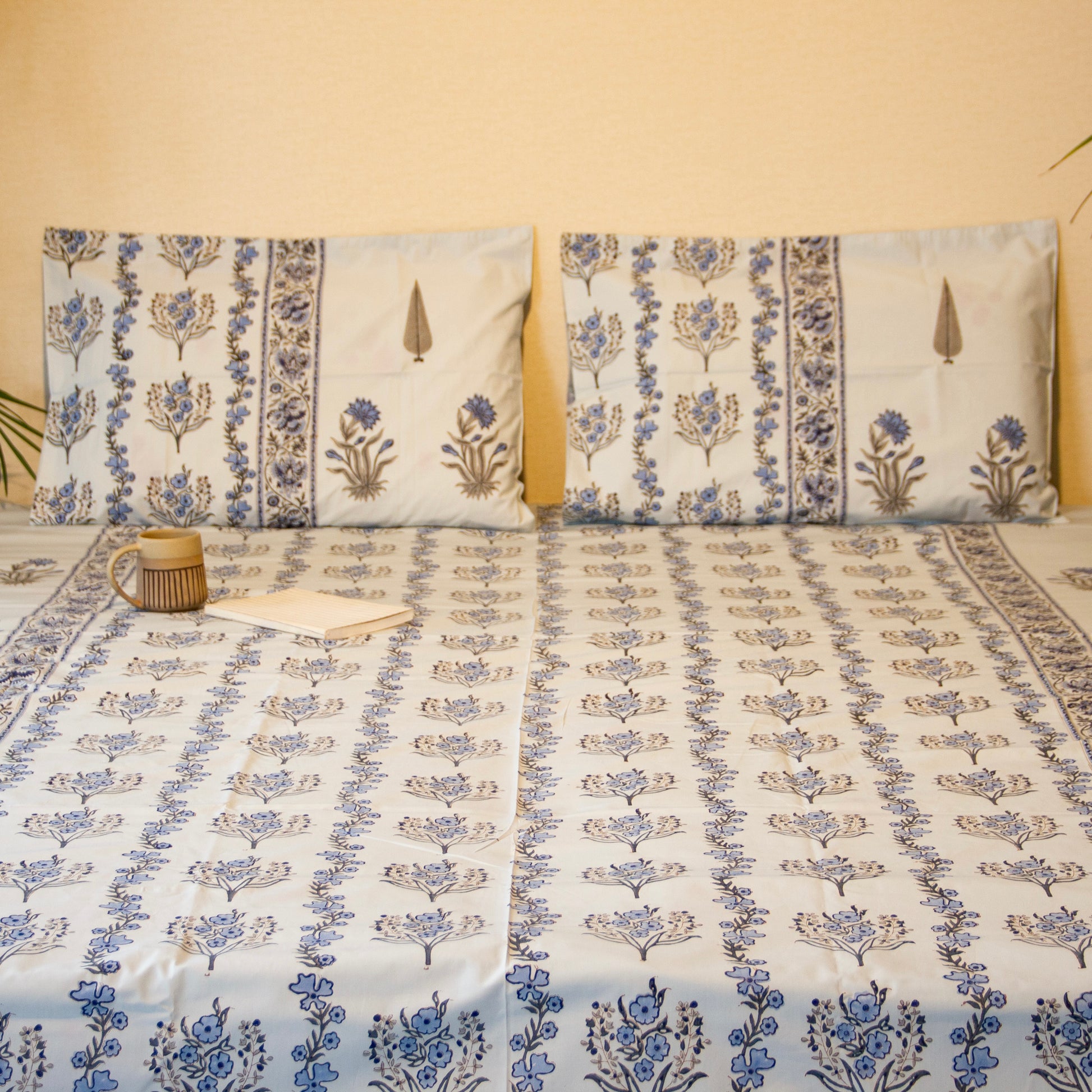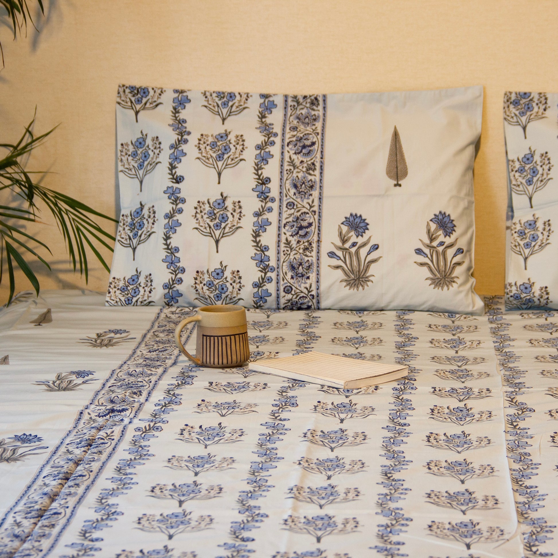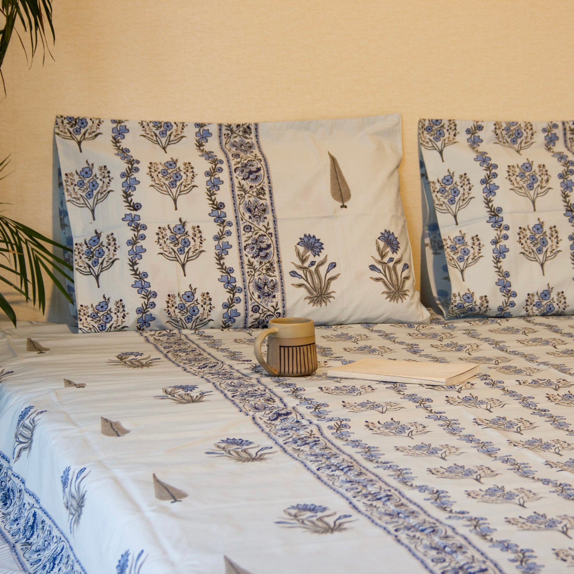 Hand block printed bedsheets are bed linens that are adorned with intricate designs created using a traditional printing method known as block printing. This process involves stamping a block made of wood or other materials with a design carved into it onto a piece of fabric, creating a pattern or motif that is repeated across the fabric.