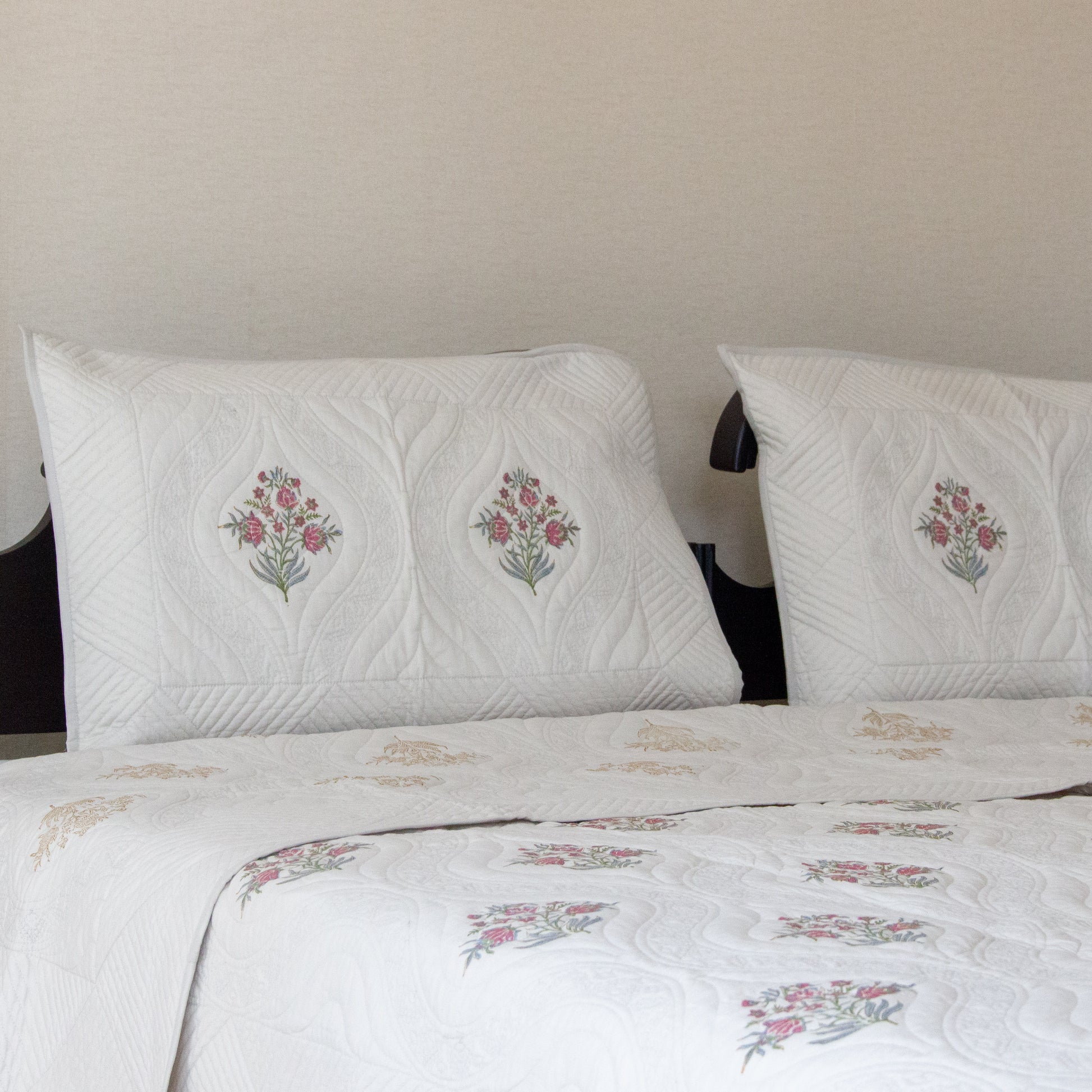 Reversible quilted bed covers are bedding accessories that are designed with a quilted construction, made by stitching together multiple layers of fabric to create a thick, warm cover that can be used to keep a bed cozy and comfortable. These bed covers have two different patterns or colours on each side, allowing you to switch up the look of your bedding depending on your mood or decor.