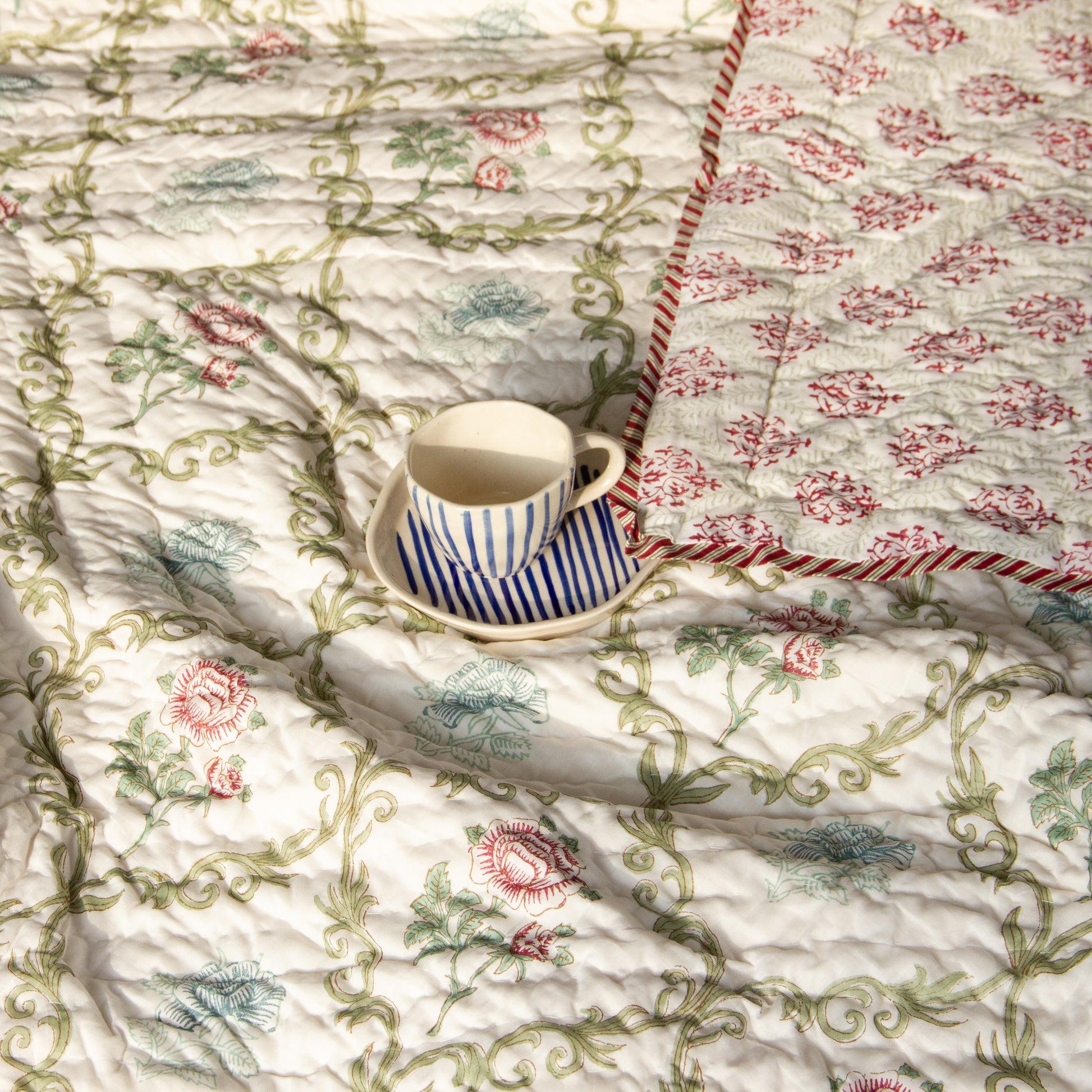 Hand block printed reversible quilts are a type of traditional Indian quilts made by skilled artisans using hand-carved wooden blocks to print intricate designs onto fabric. These quilts are reversible, meaning they have a different pattern on each side, allowing for versatility in home decor. They are made with high-quality cotton for warmth and comfort.