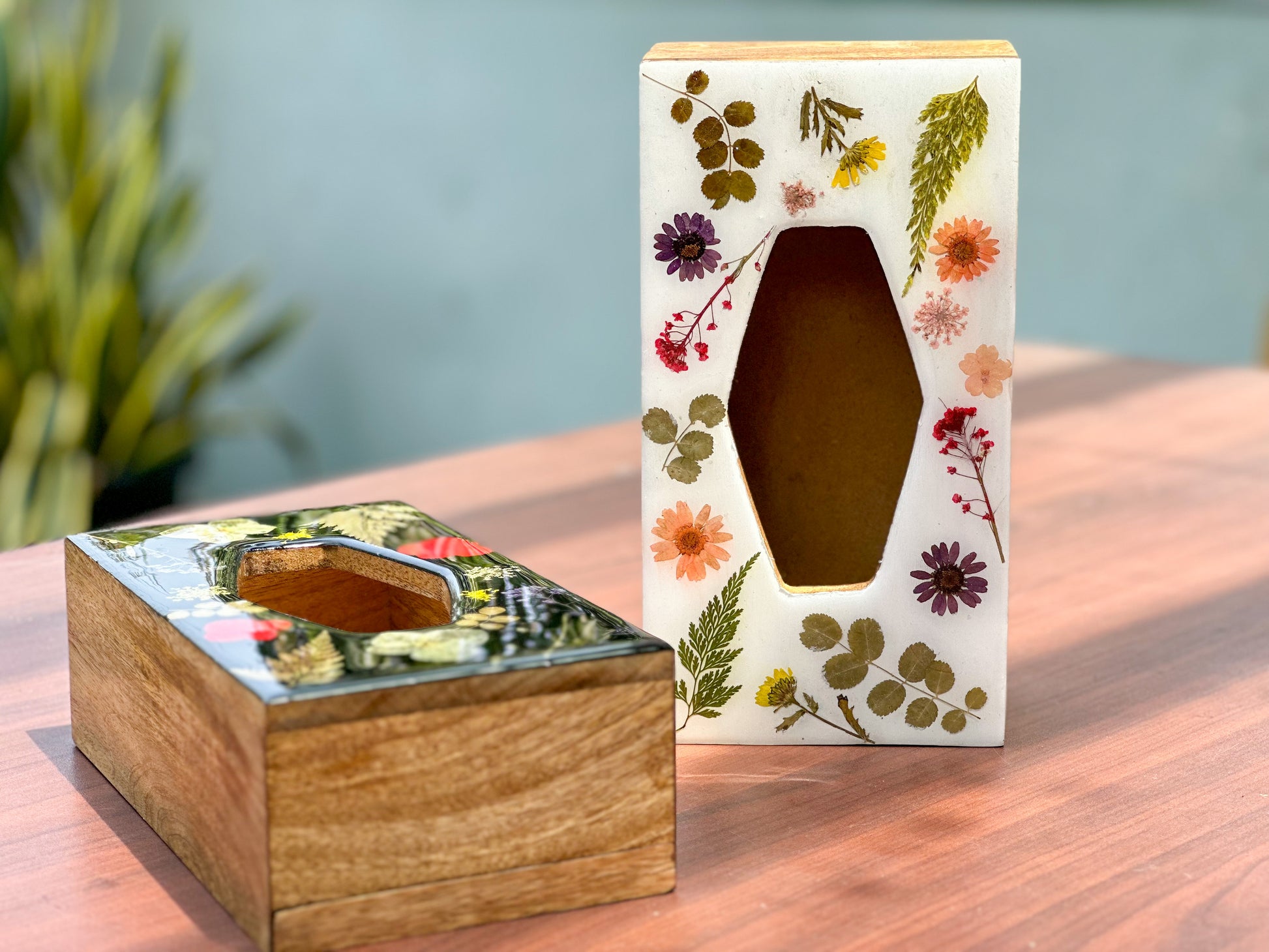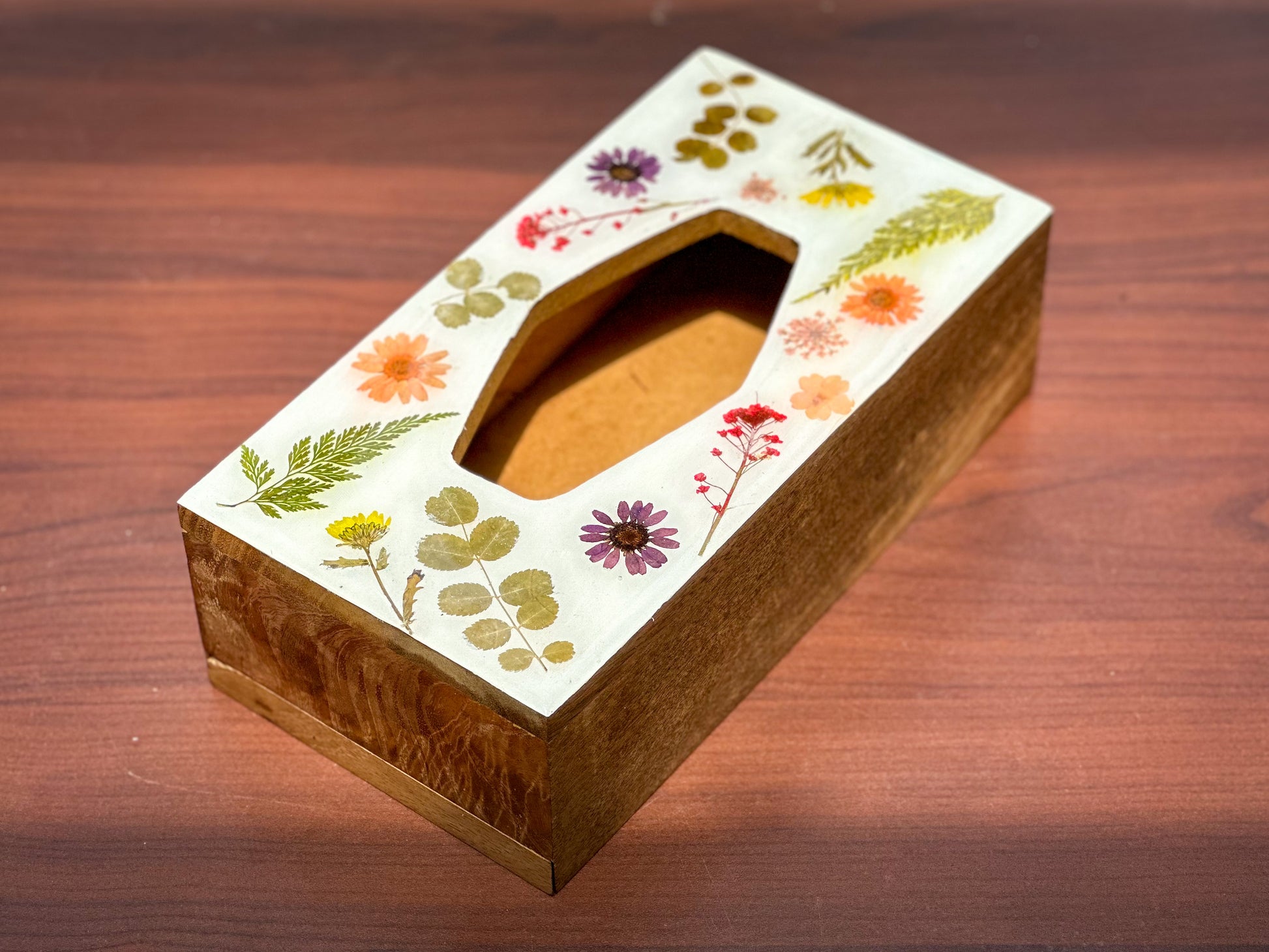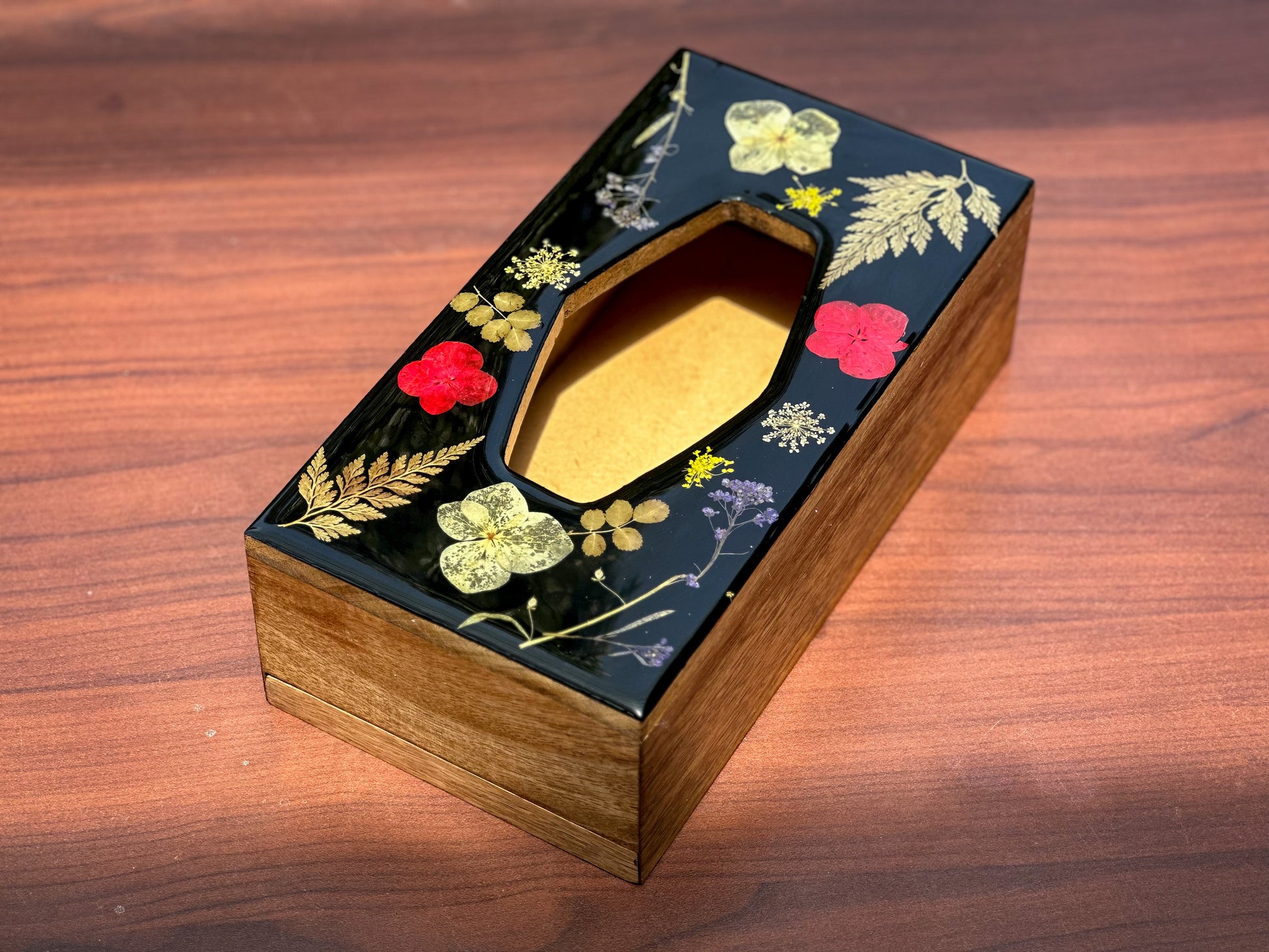 Elevate your home decor with this exquisite floral resin tissue box, expertly crafted from a high-quality resin material for unparalleled durability and longevity. The stunning floral design is a testament to the artistry and skill of its creator, with each petal and leaf expertly embedded into the resin to create a captivating and intricate pattern.
