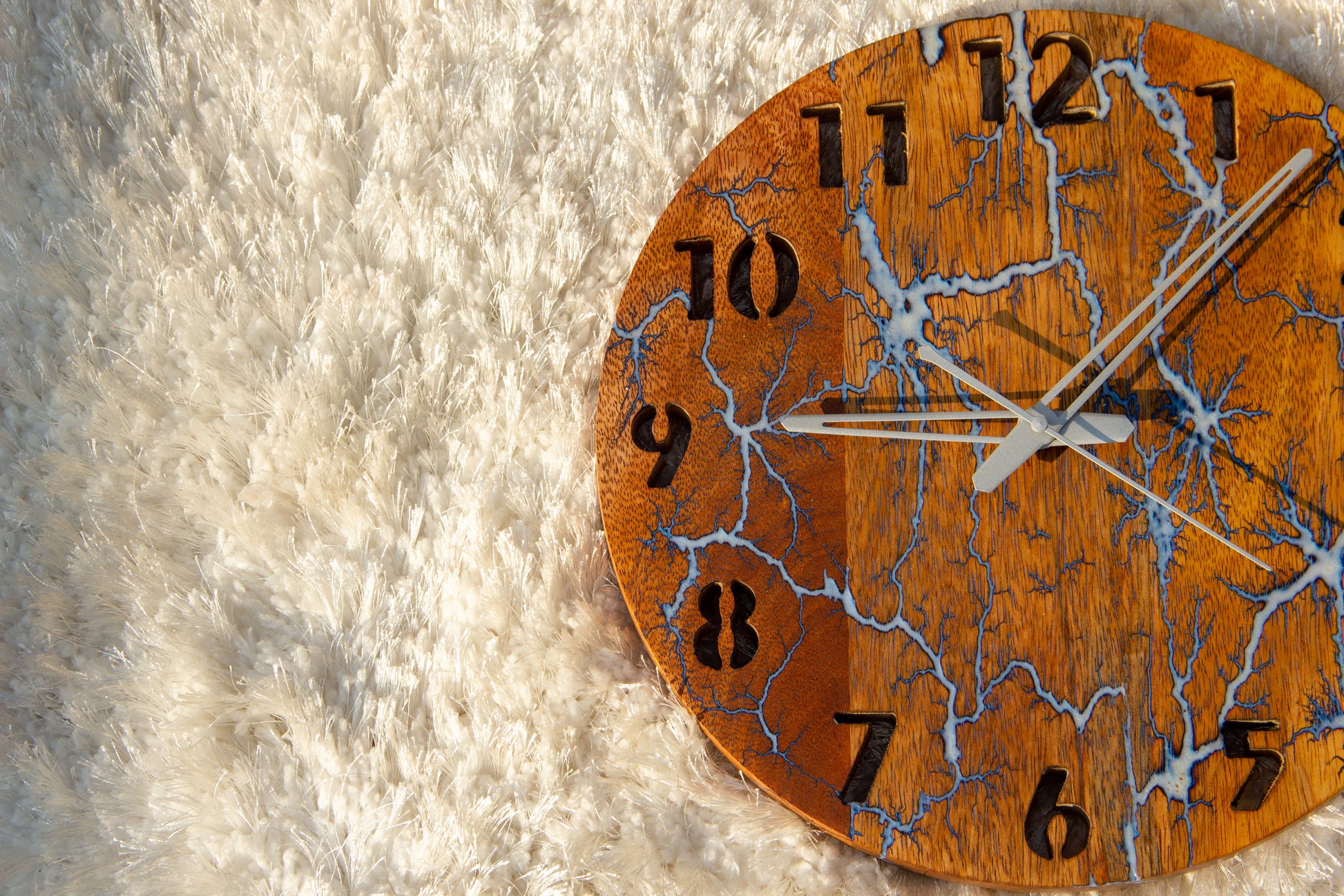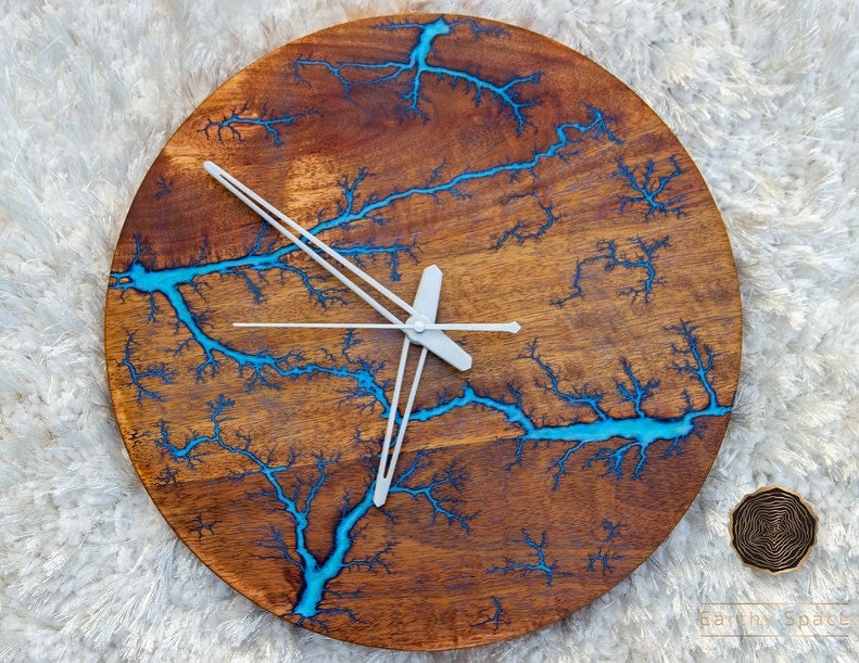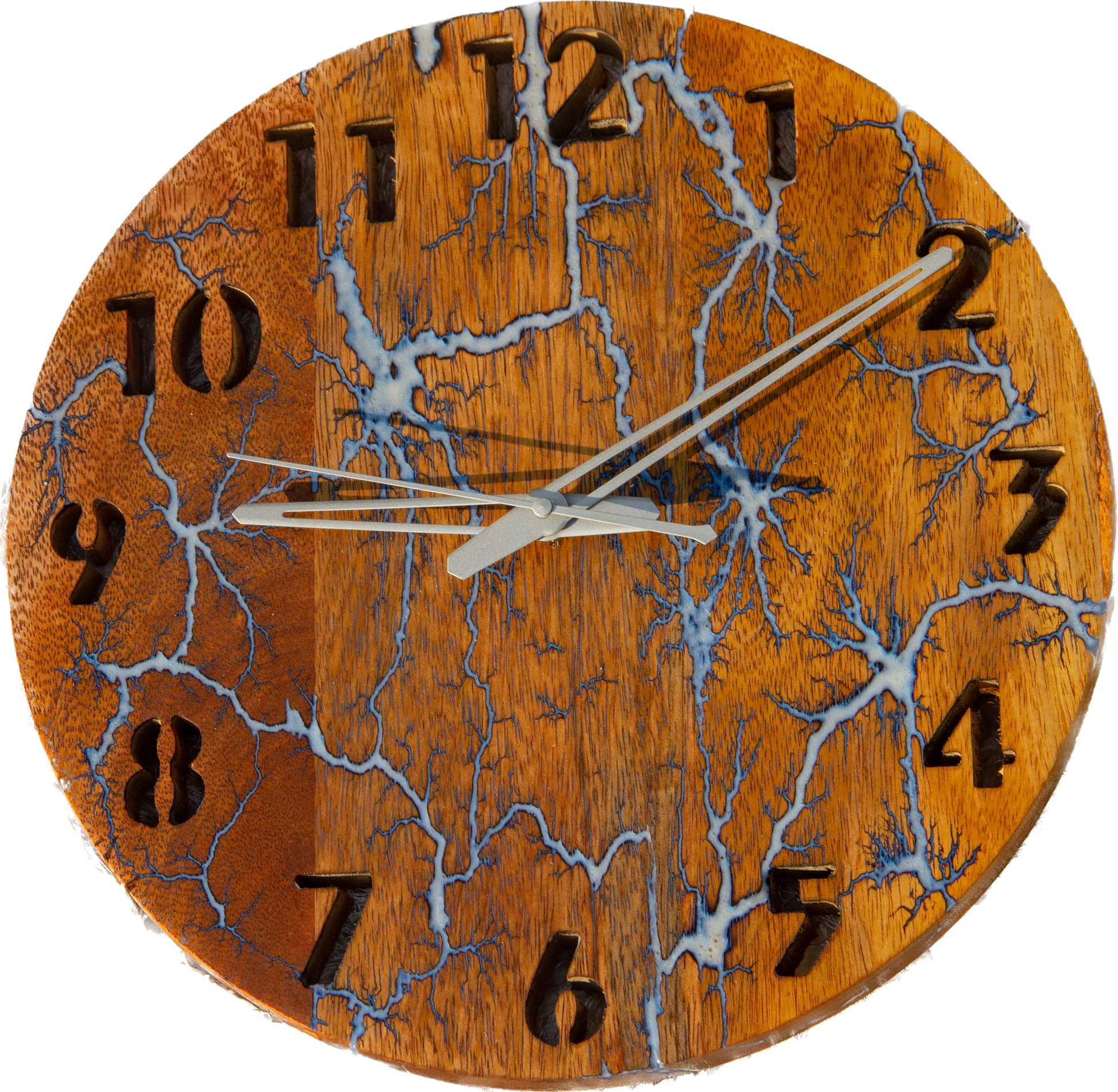 Wall Clocks using fractal burning are unique timepieces that feature intricate designs created through the process of fractal burning. This technique involves using a specialized tool to burn patterns into wood, creating an eye-catching, mesmerizing design that resembles a fractal (lightning pattern).