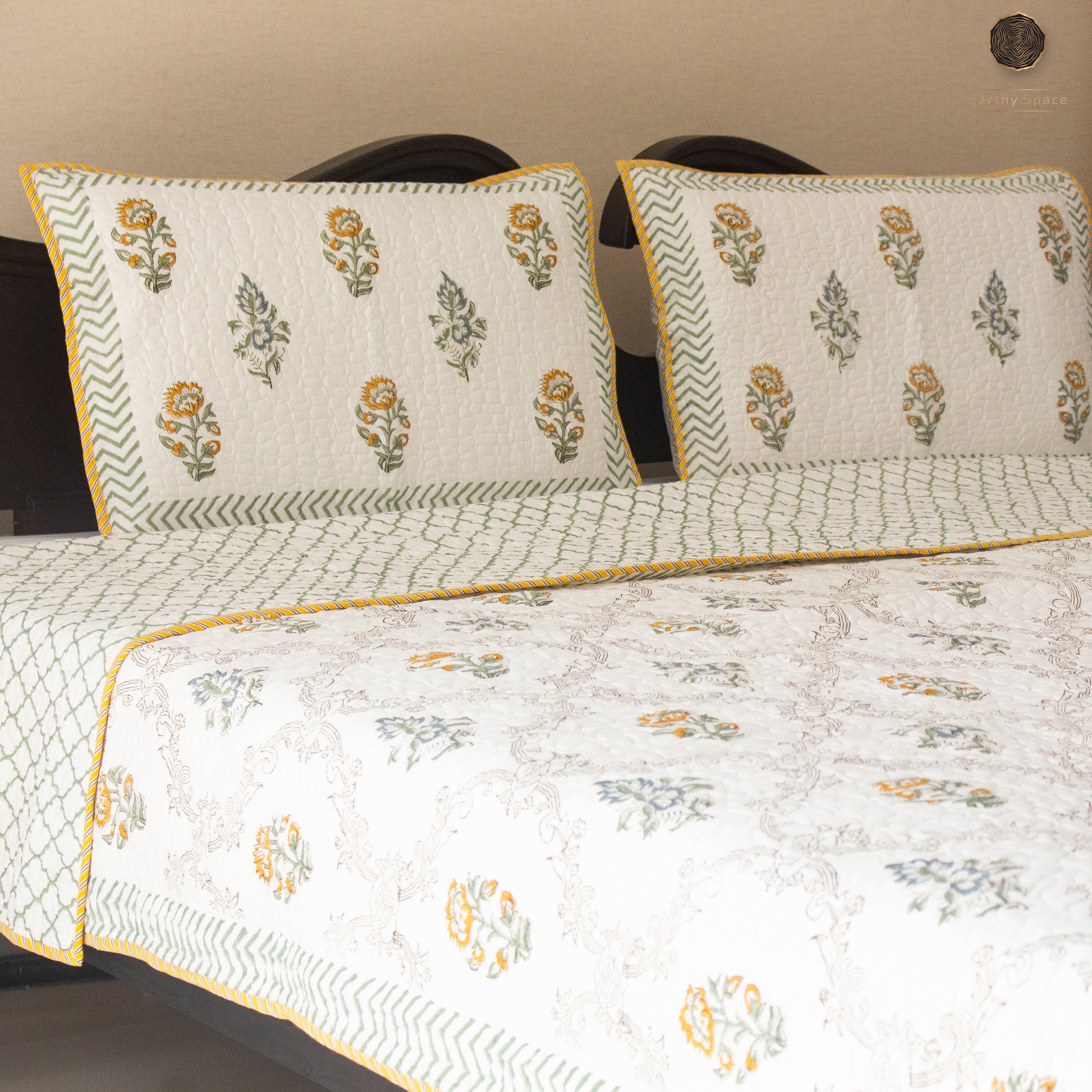 Reversible quilted bed covers are bedding accessories that are designed with a quilted construction, made by stitching together multiple layers of fabric to create a thick, warm cover that can be used to keep a bed cozy and comfortable. These bed covers have two different patterns or colours on each side, allowing you to switch up the look of your bedding depending on your mood or decor.