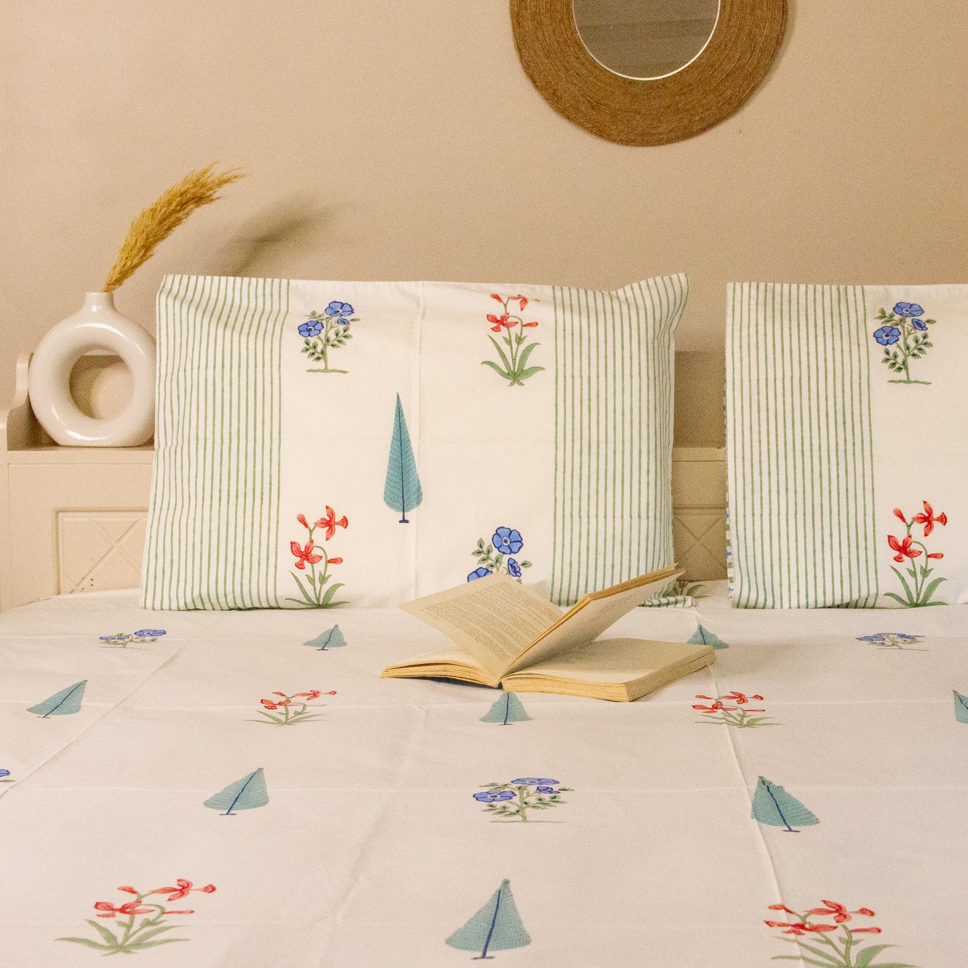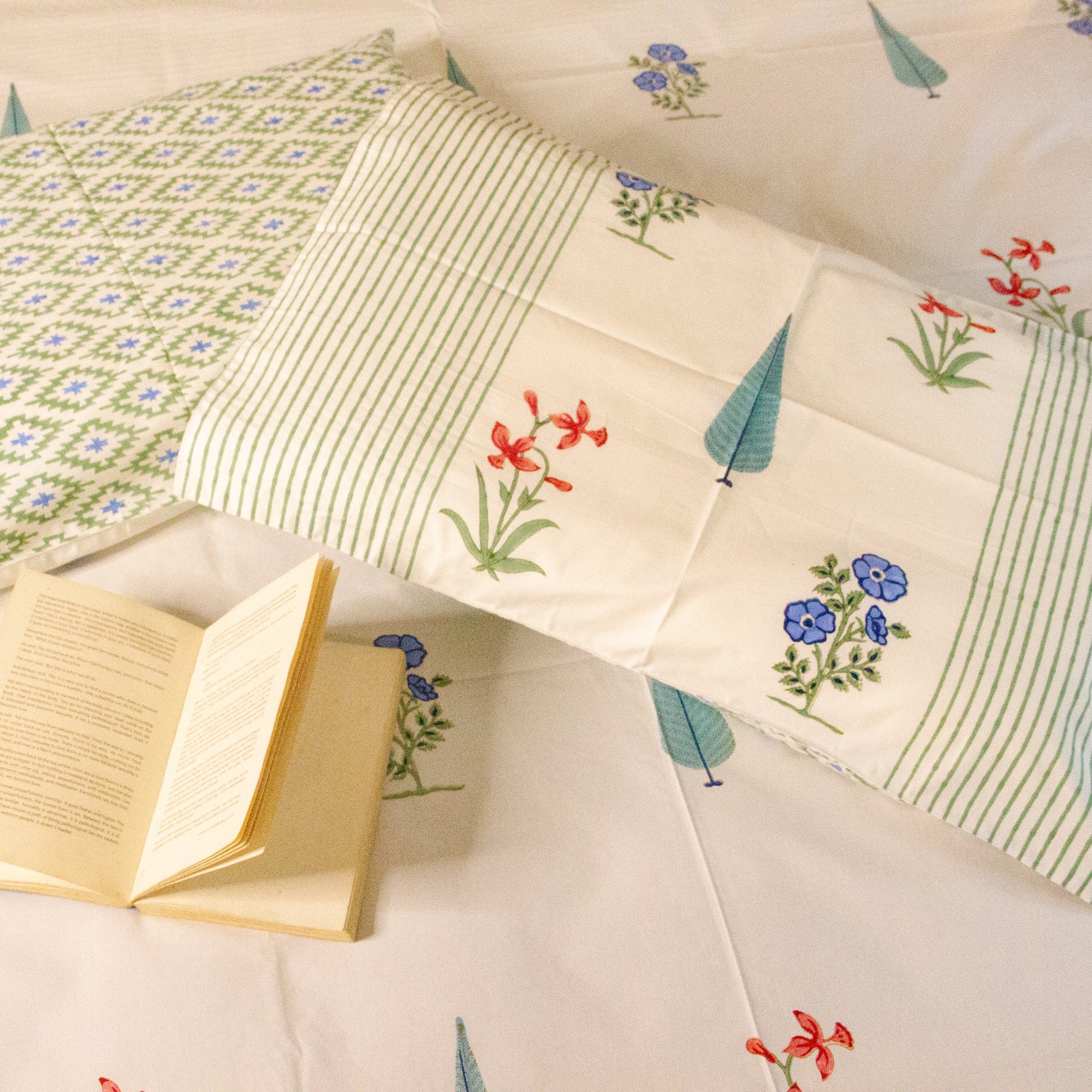 Hand block printed bedsheets are bed linens that are adorned with intricate designs created using a traditional printing method known as block printing. This process involves stamping a block made of wood or other materials with a design carved into it onto a piece of fabric, creating a pattern or motif that is repeated across the fabric.