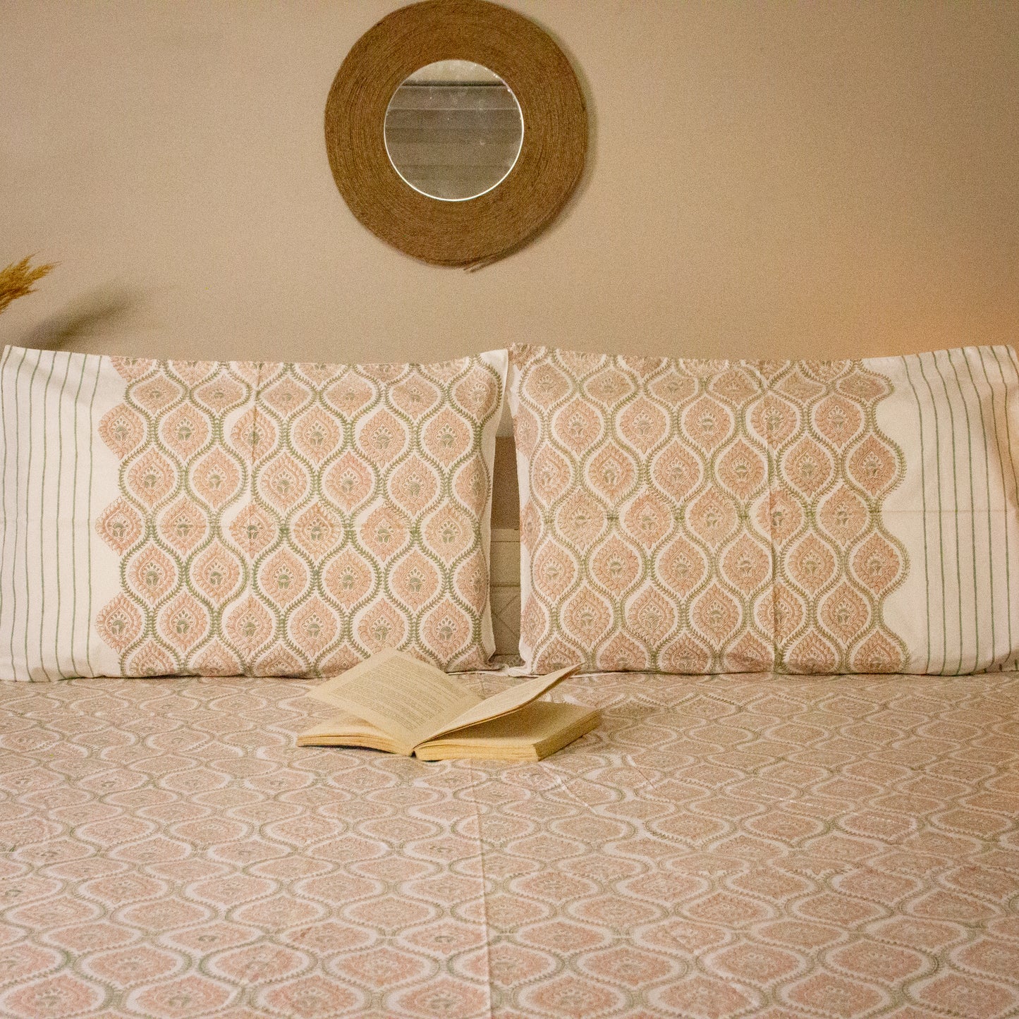 Hand block printed bedsheets are bed linens that are adorned with intricate designs created using a traditional printing method known as block printing. This process involves stamping a block made of wood or other materials with a design carved into it onto a piece of fabric, creating a pattern or motif that is repeated across the fabric.