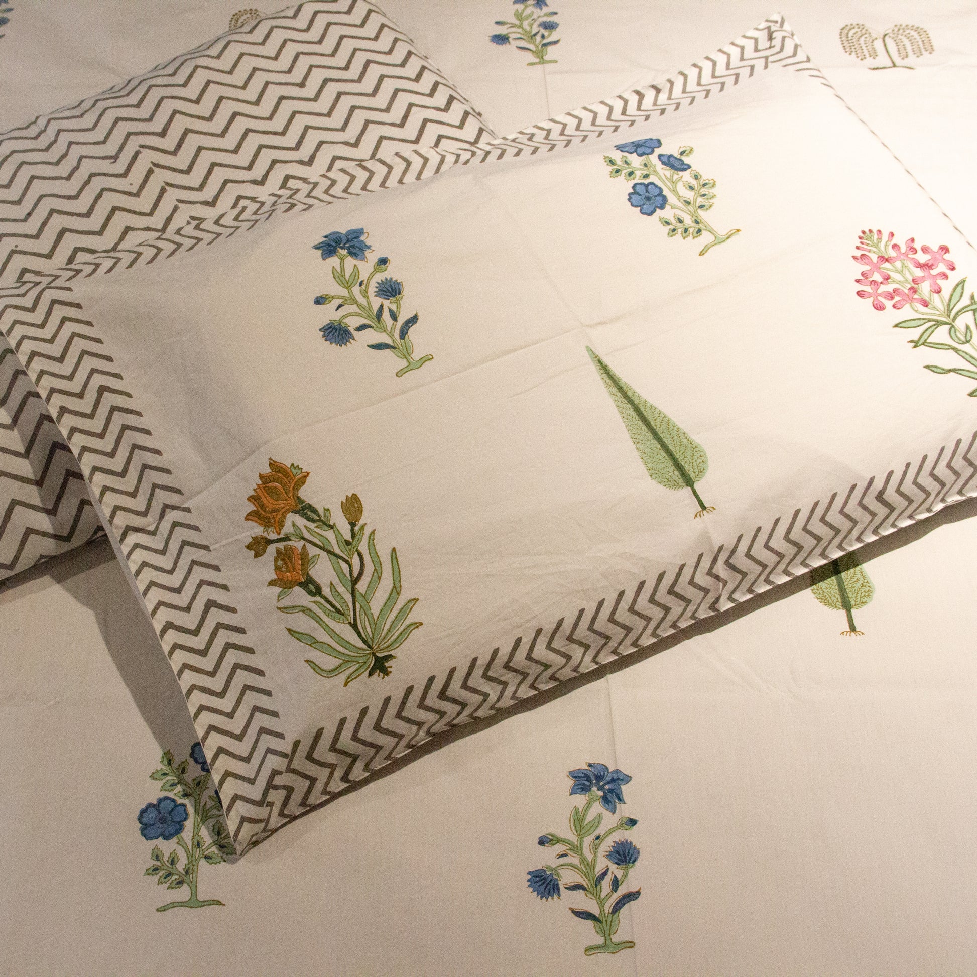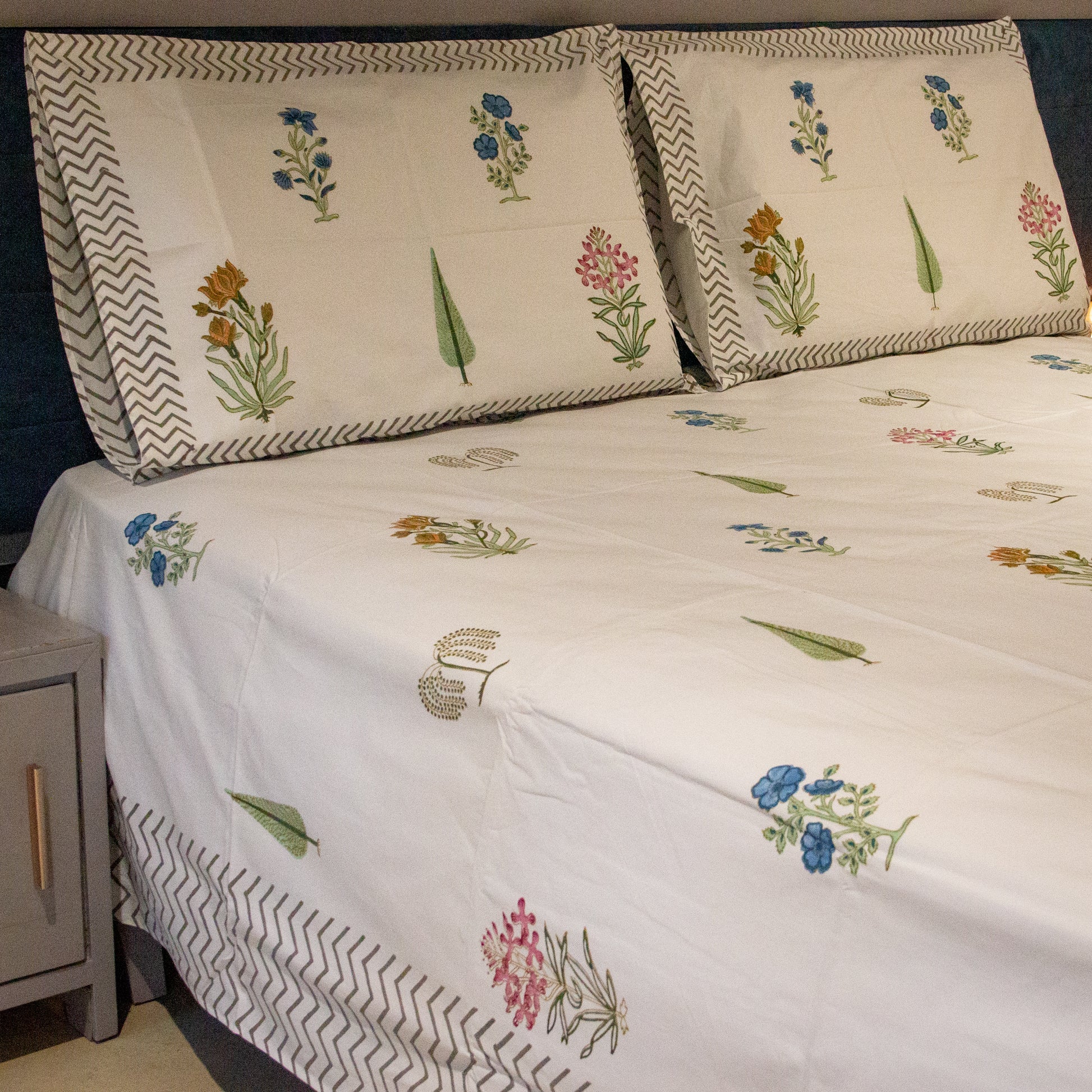 Hand block printed bedsheets are bed linens that are adorned with intricate designs created using a traditional printing method known as block printing. This process involves stamping a block made of wood or other materials with a design carved into it onto a piece of fabric, creating a pattern or motif that is repeated across the fabric.