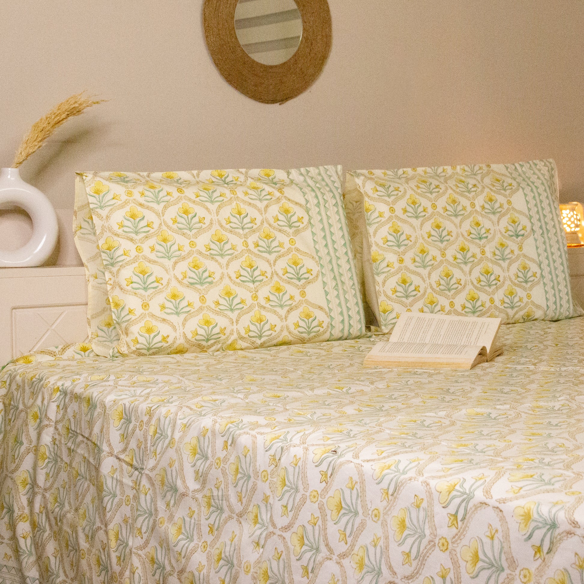Hand block printed bed sheets in beige colour exude elegance and sophistication. Each intricate pattern is meticulously handcrafted by skilled artisans using traditional block printing techniques. The beige colour palette brings a sense of warmth and tranquility to your bedroom, creating a serene ambiance.