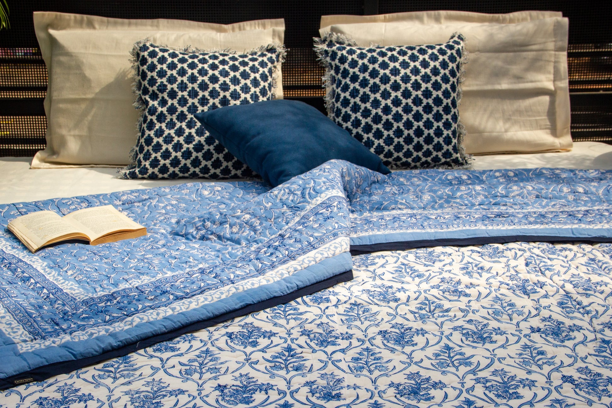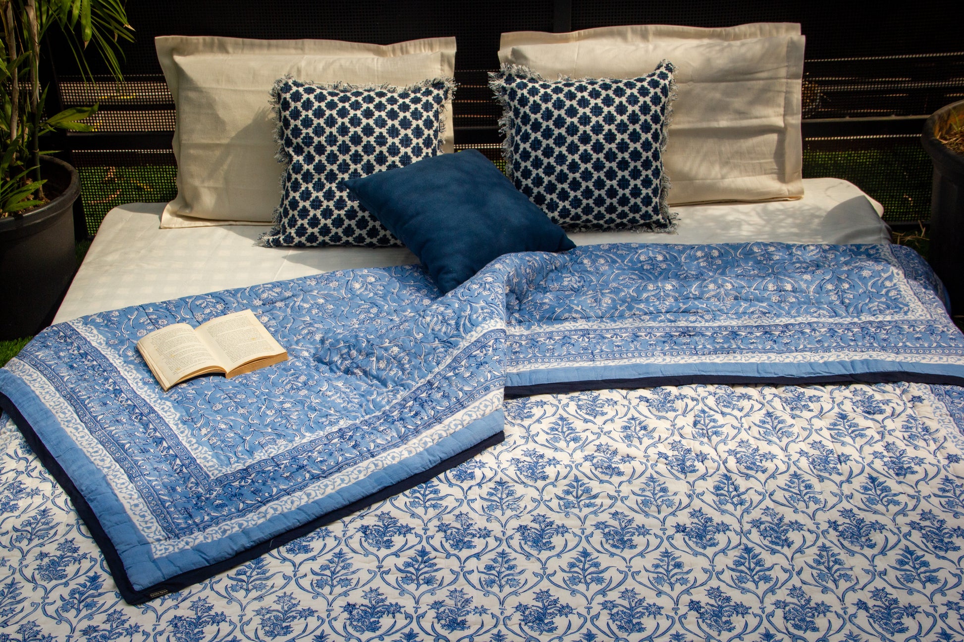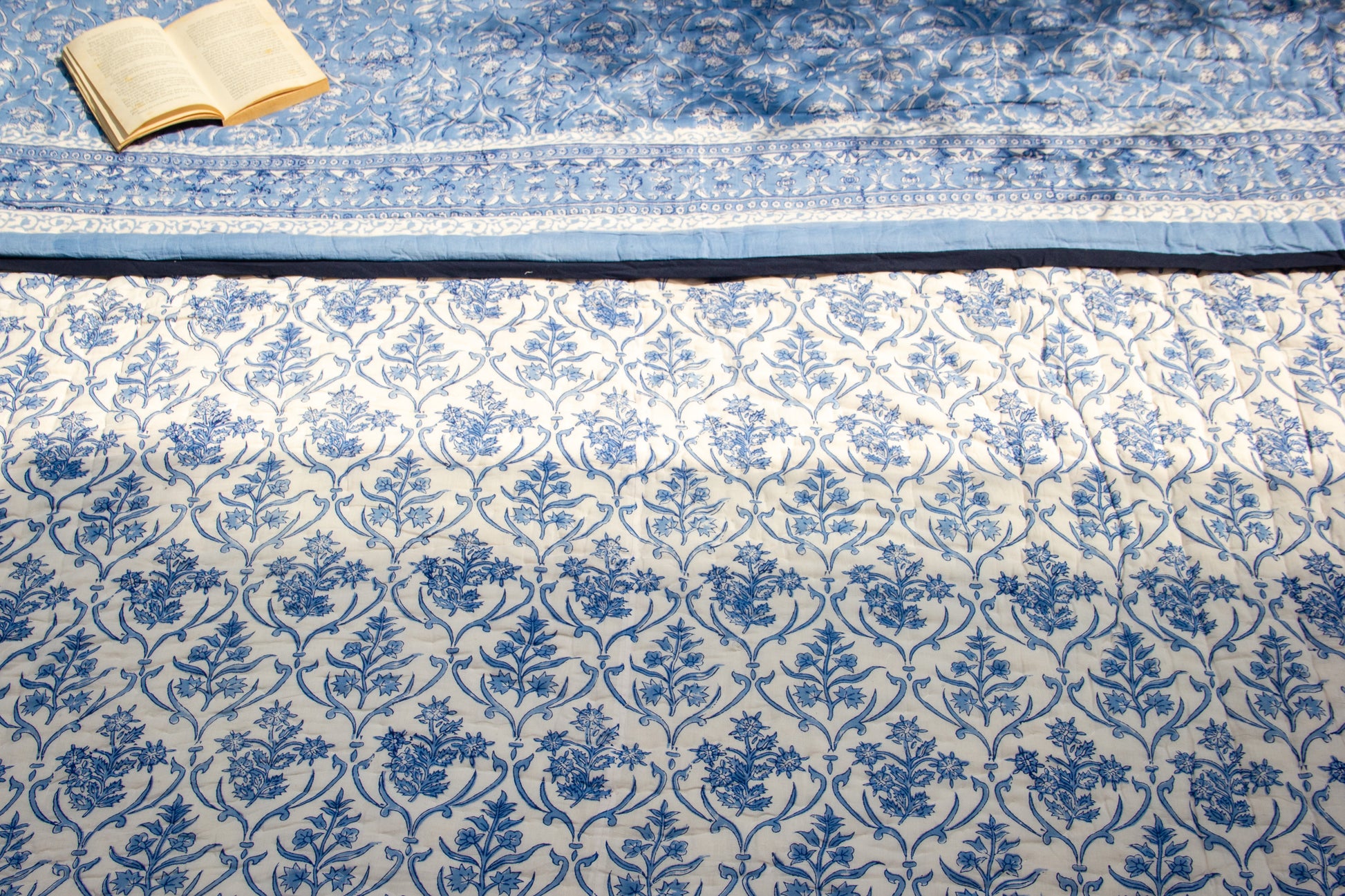 Hand block printed reversible quilts are a type of traditional Indian quilts made by skilled artisans using hand-carved wooden blocks to print intricate designs onto fabric. These quilts are reversible, meaning they have a different pattern on each side, allowing for versatility in home decor. They are made with high-quality cotton for warmth and comfort.
