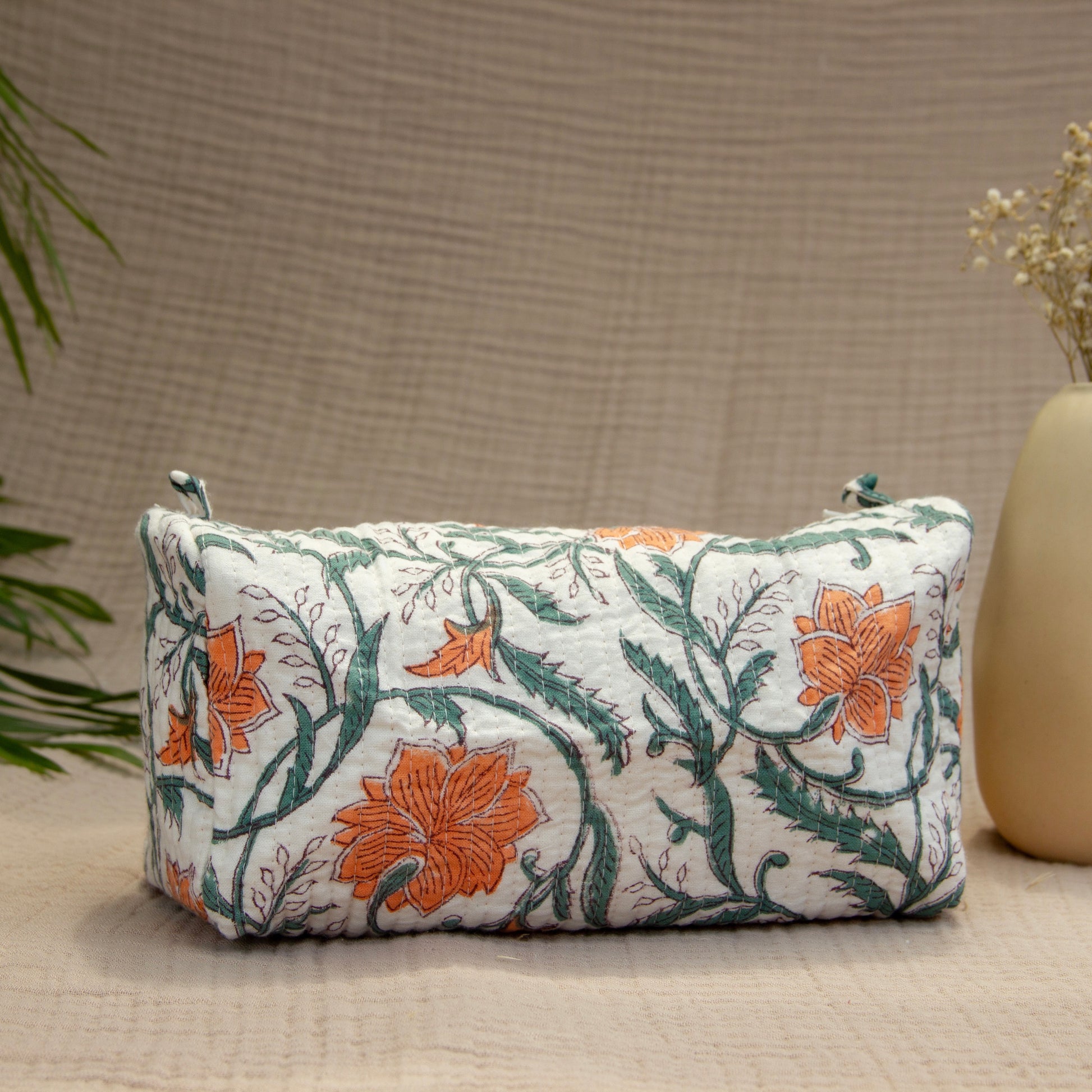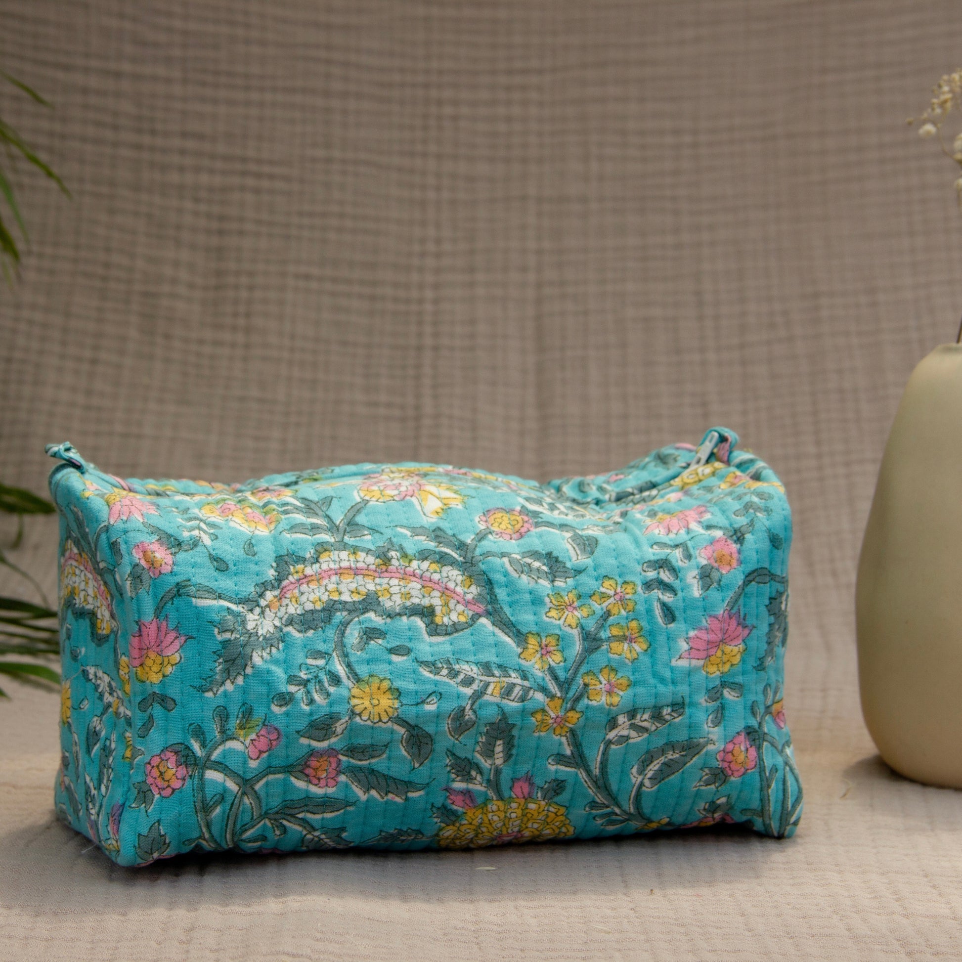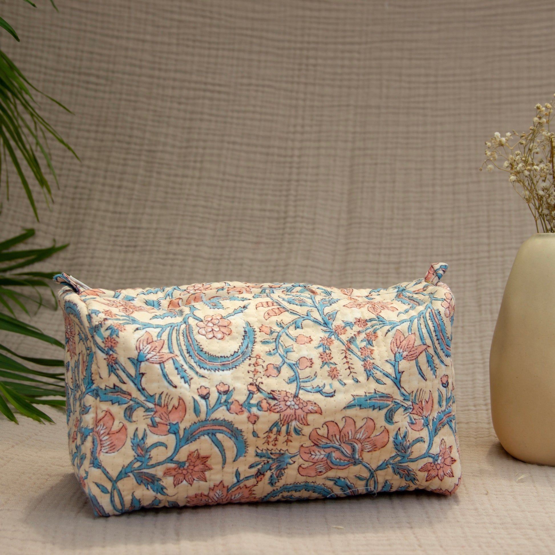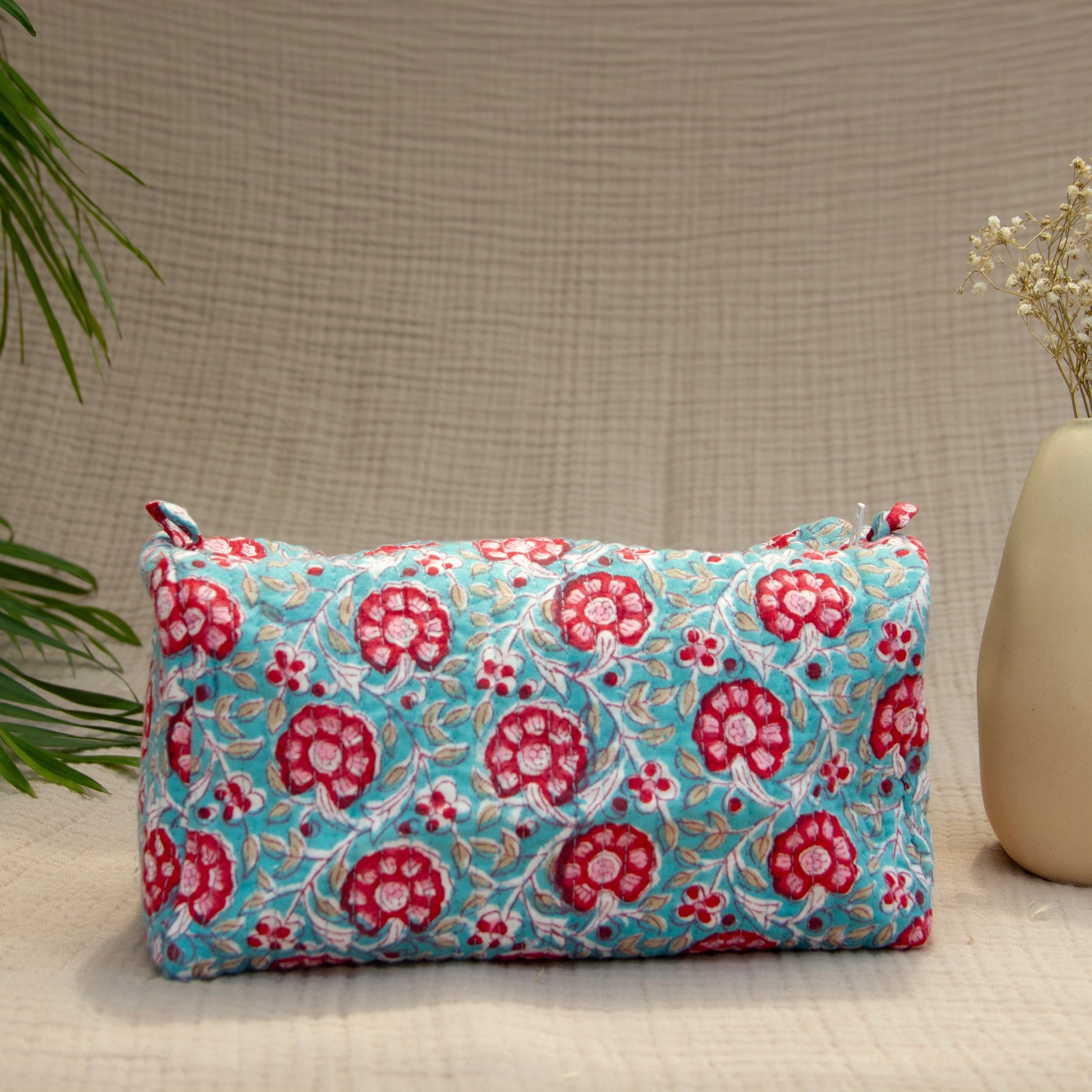 Hand-block printed toiletry pouches are cosmetic or travel bags that are decorated using a traditional block printing technique. These pouches have a waterproof lining, making them suitable for carrying toiletries, wet items, or other items that need to be protected from moisture. The combination of traditional block printing and modern materials make these pouches both stylish and practical, perfect for travel or everyday use.