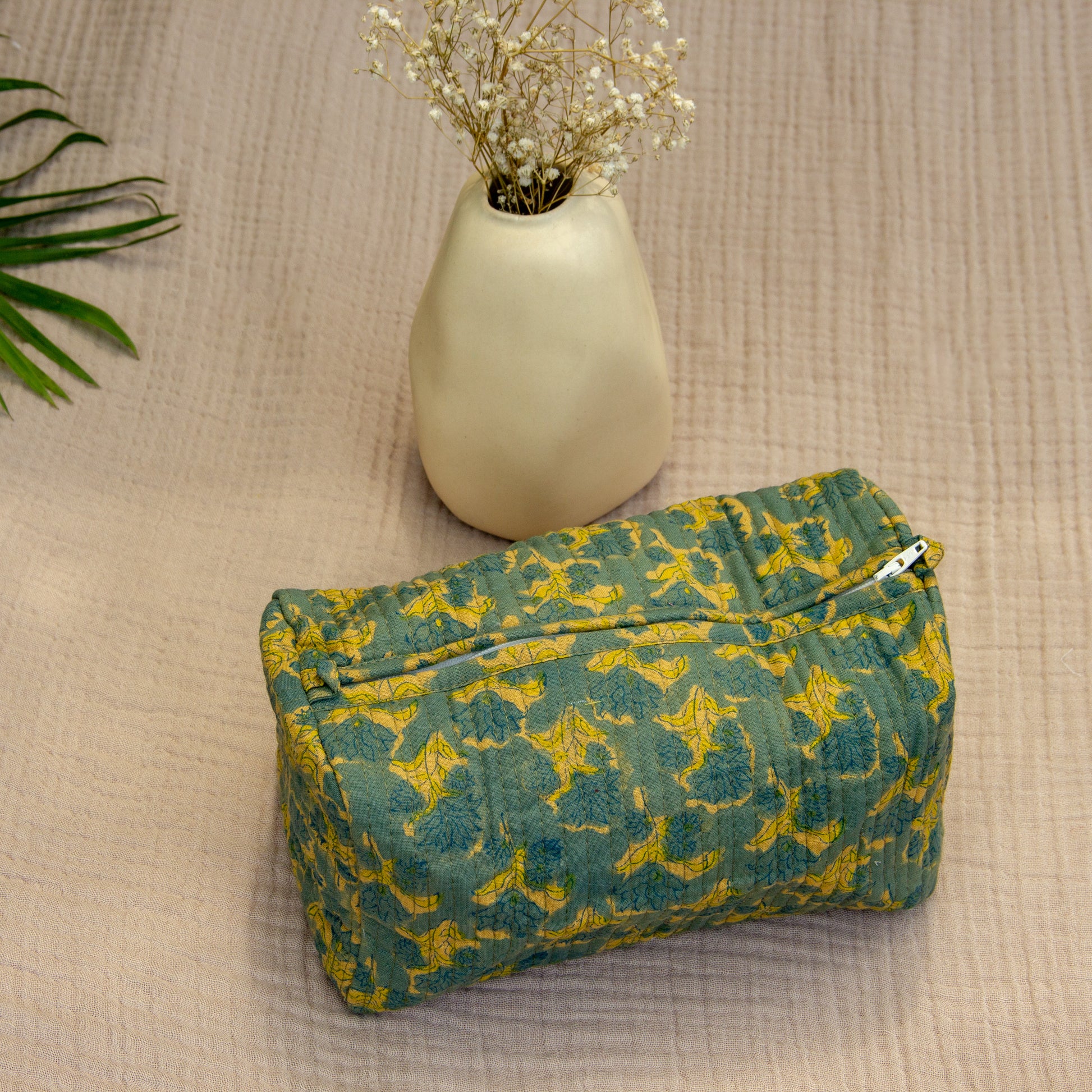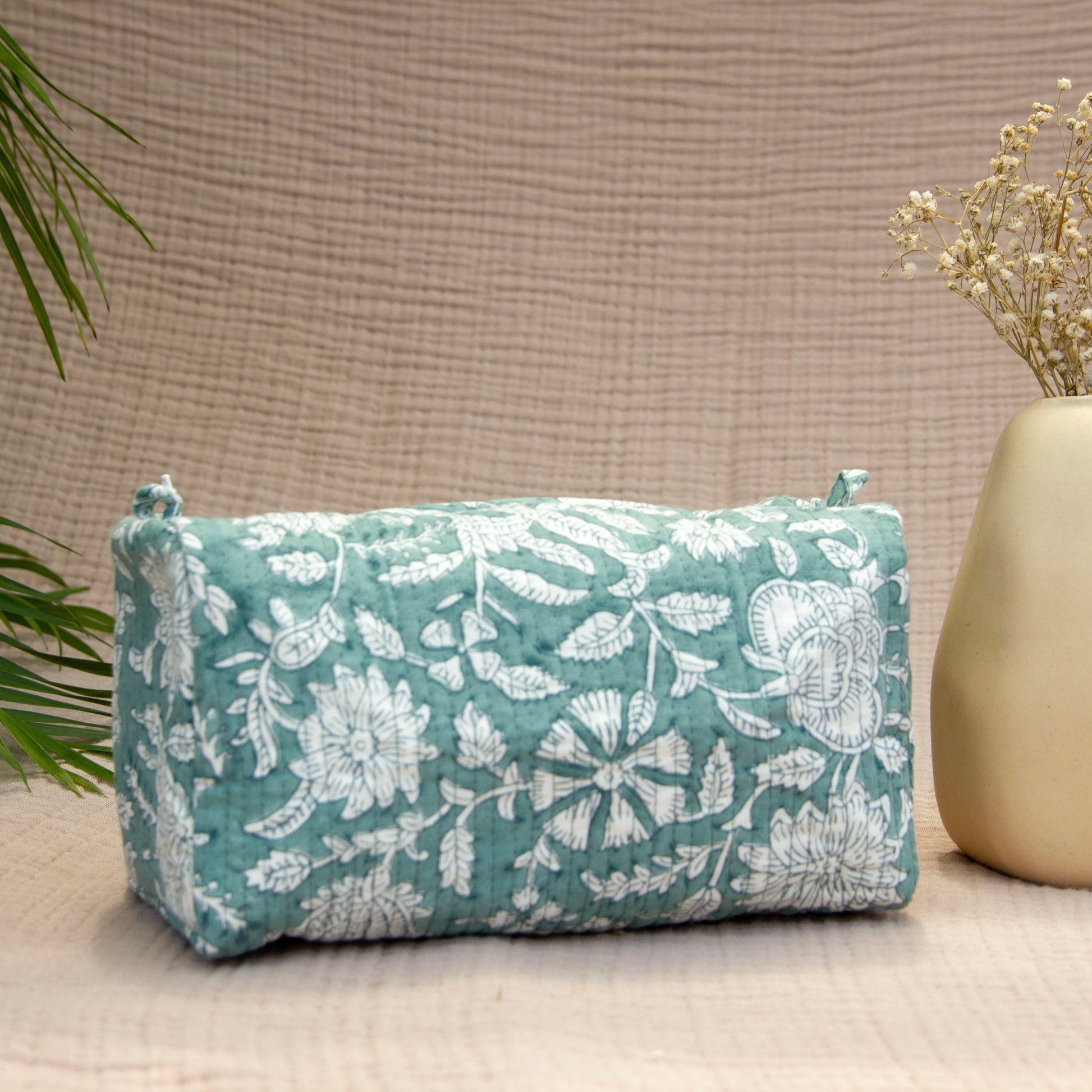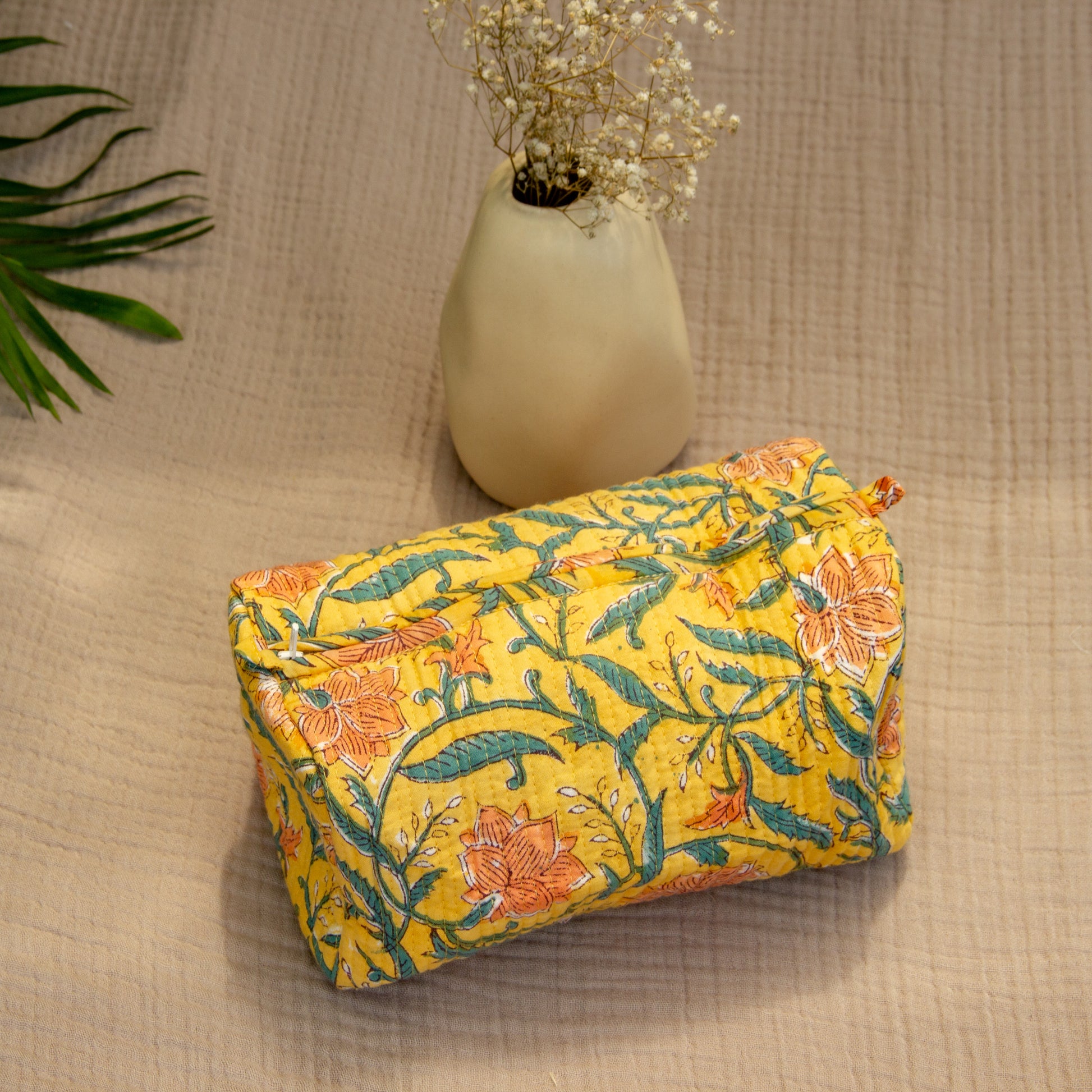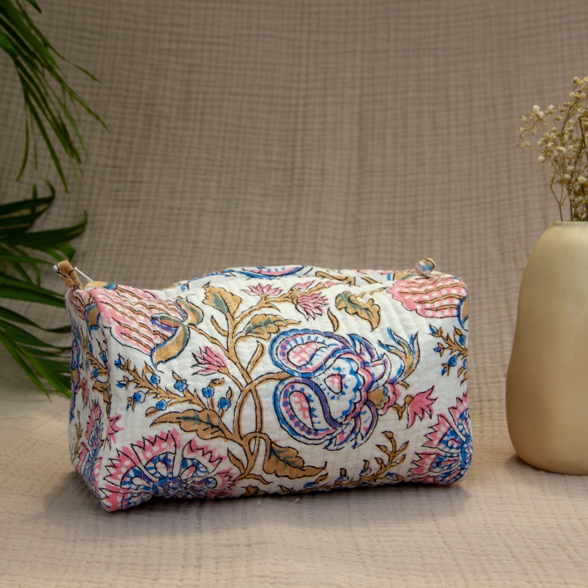 Hand-block printed toiletry pouches are cosmetic or travel bags that are decorated using a traditional block printing technique. These pouches have a waterproof lining, making them suitable for carrying toiletries, wet items, or other items that need to be protected from moisture. The combination of traditional block printing and modern materials make these pouches both stylish and practical, perfect for travel or everyday use.