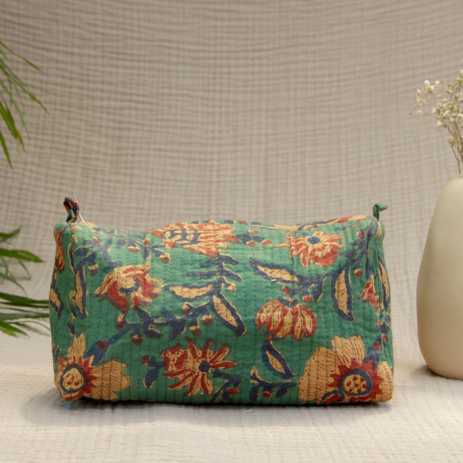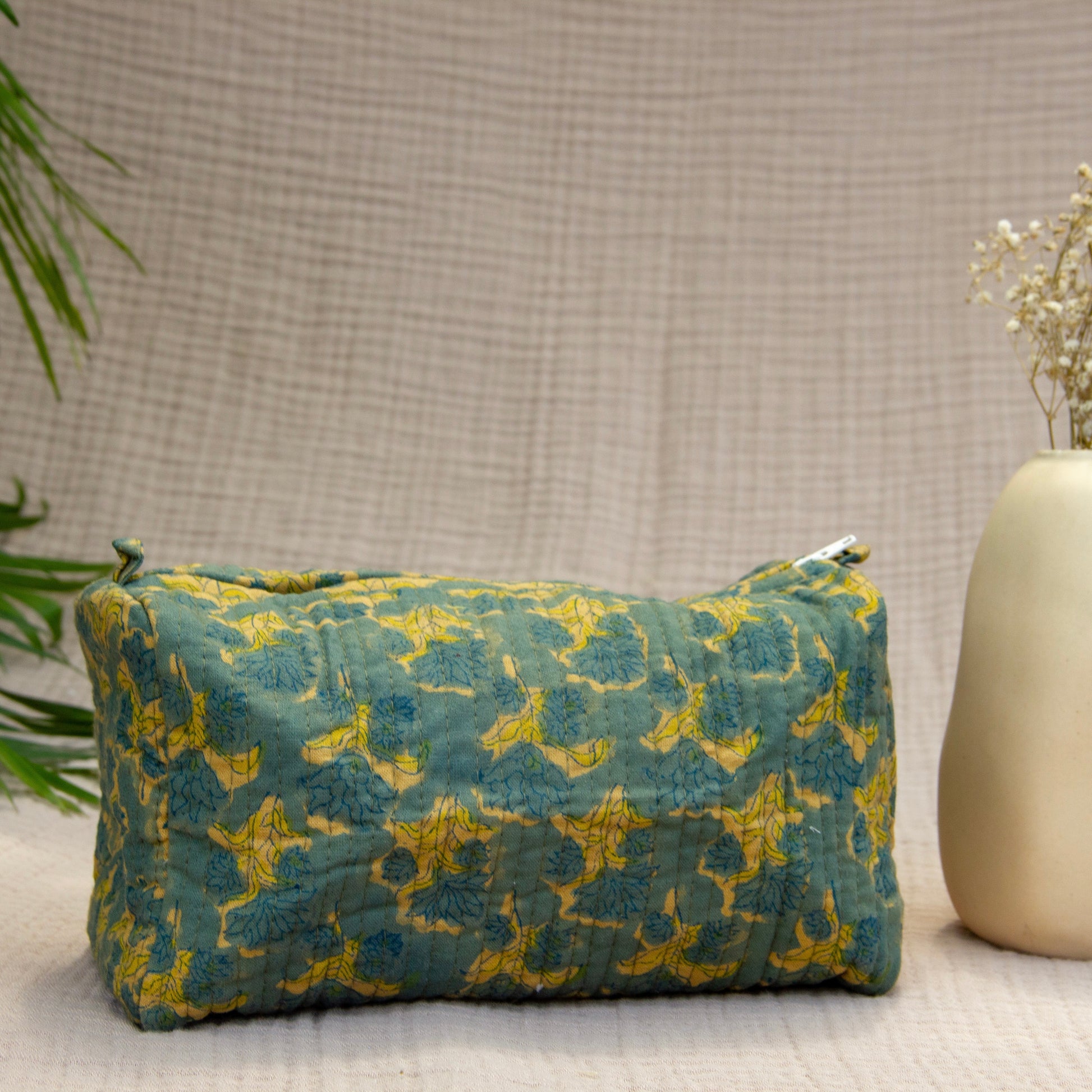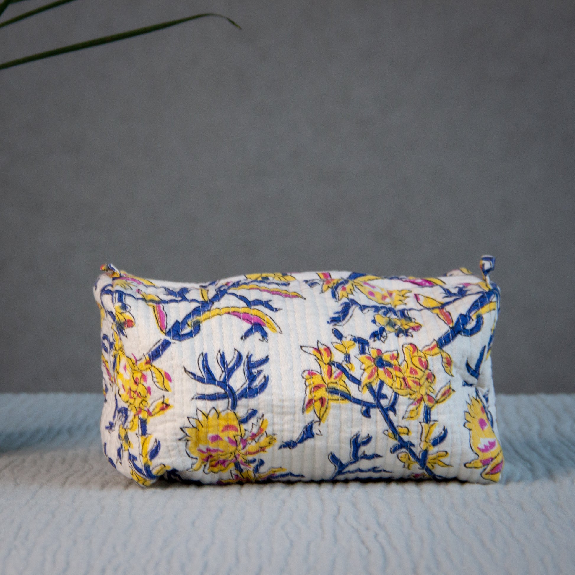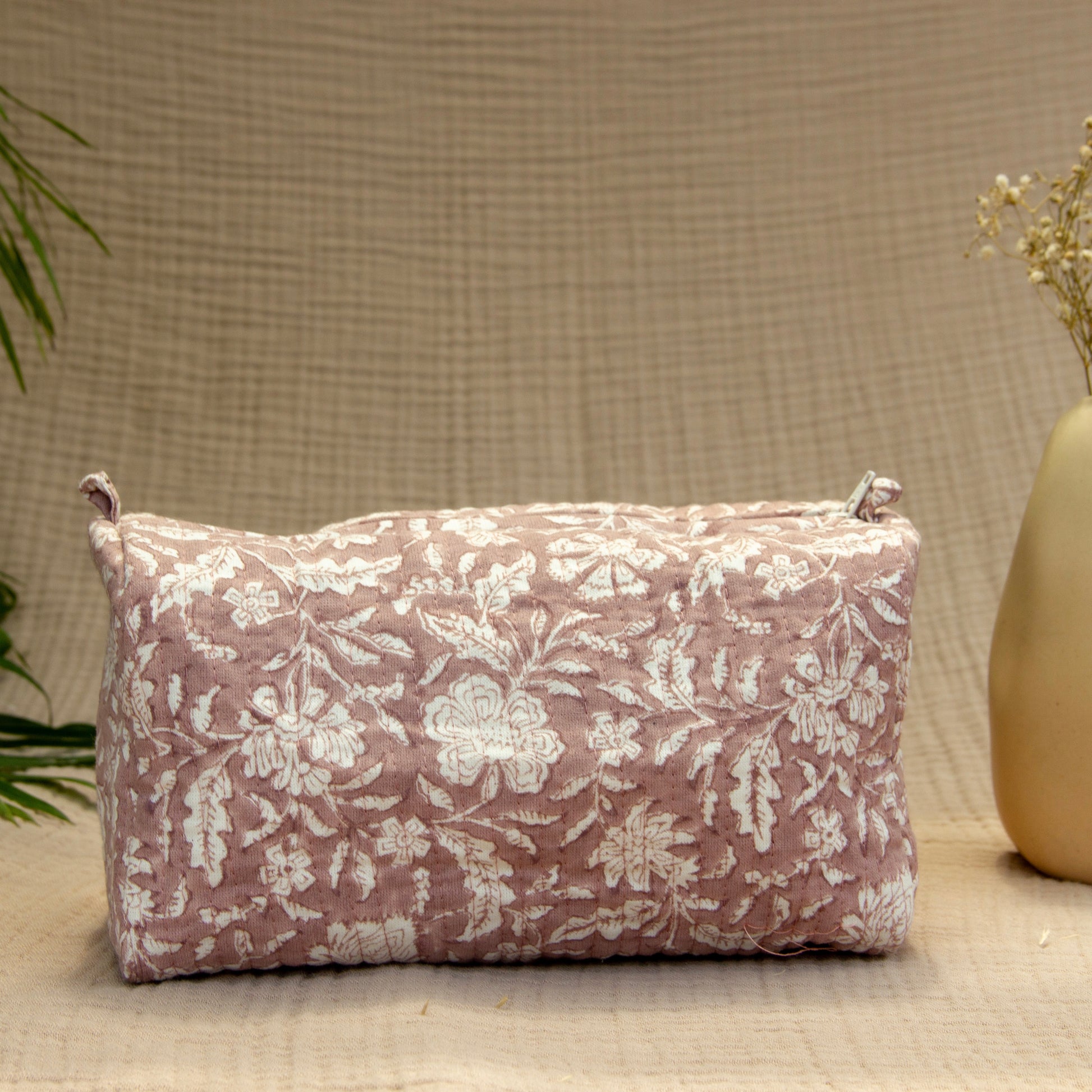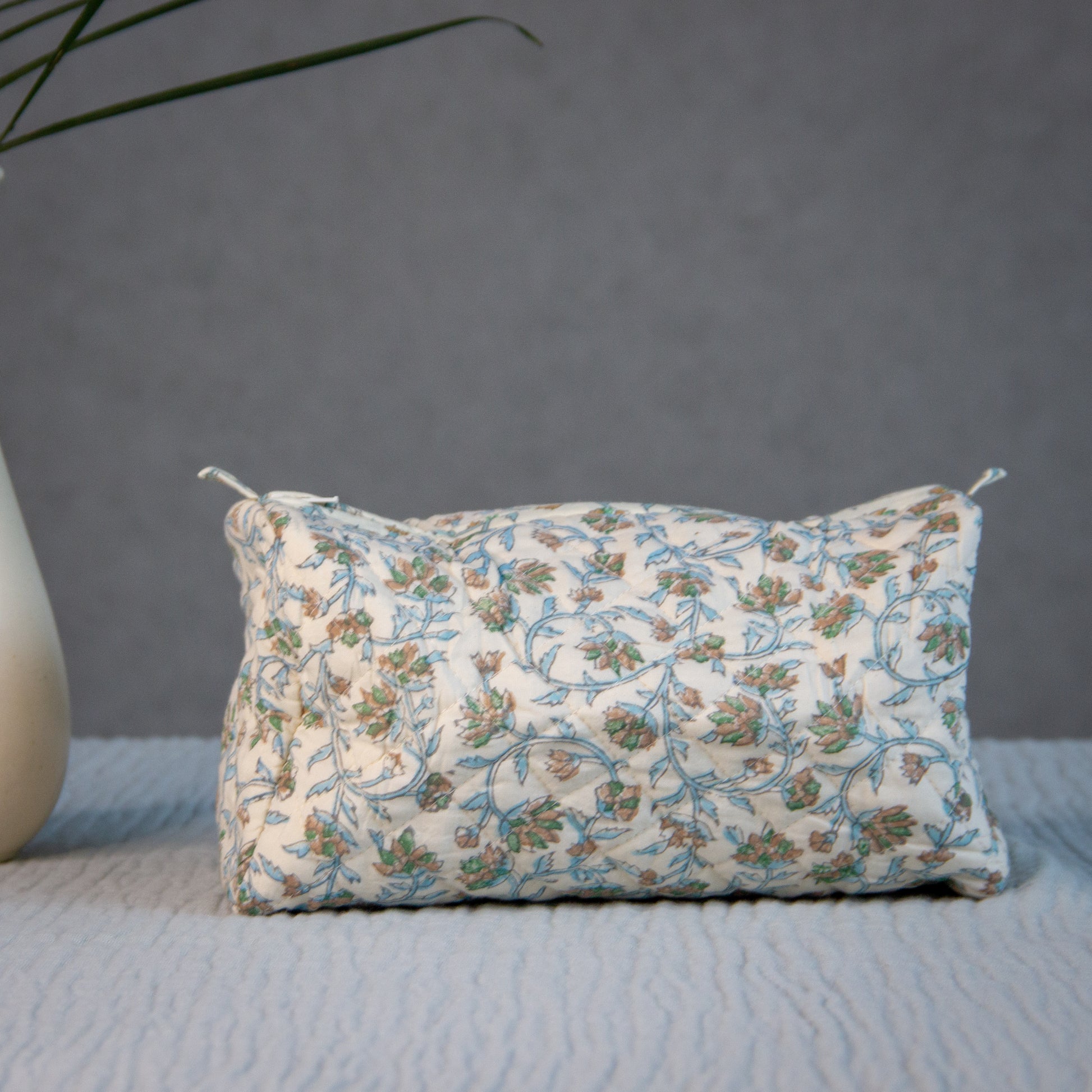 Hand-block printed toiletry pouches are cosmetic or travel bags that are decorated using a traditional block printing technique. These pouches have a waterproof lining, making them suitable for carrying toiletries, wet items, or other items that need to be protected from moisture. The combination of traditional block printing and modern materials make these pouches both stylish and practical, perfect for travel or everyday use.