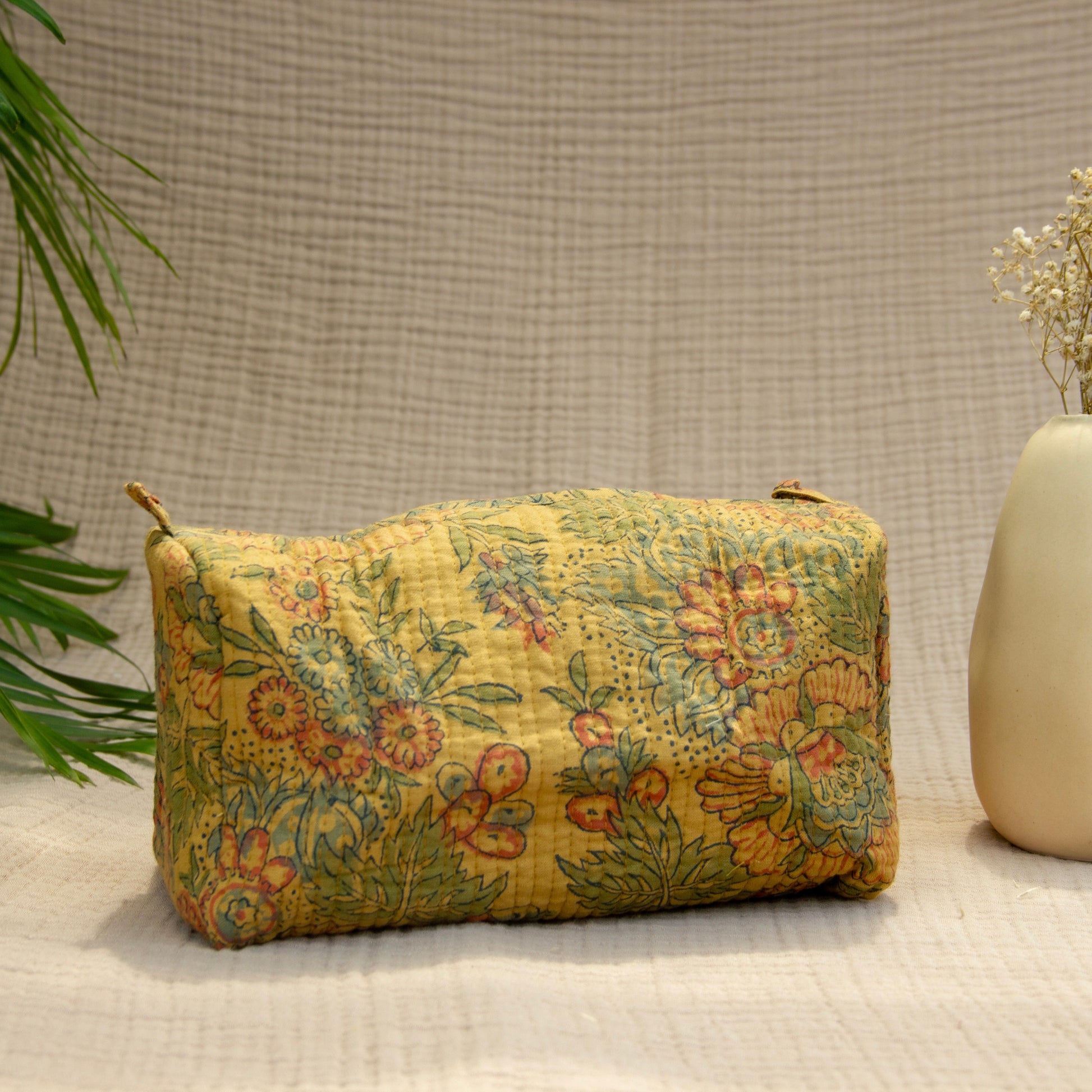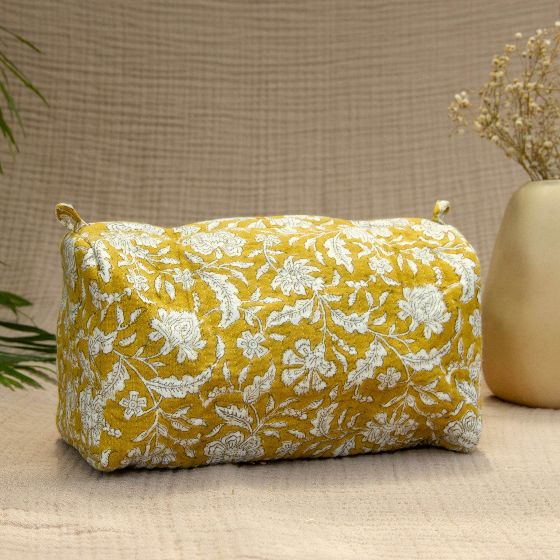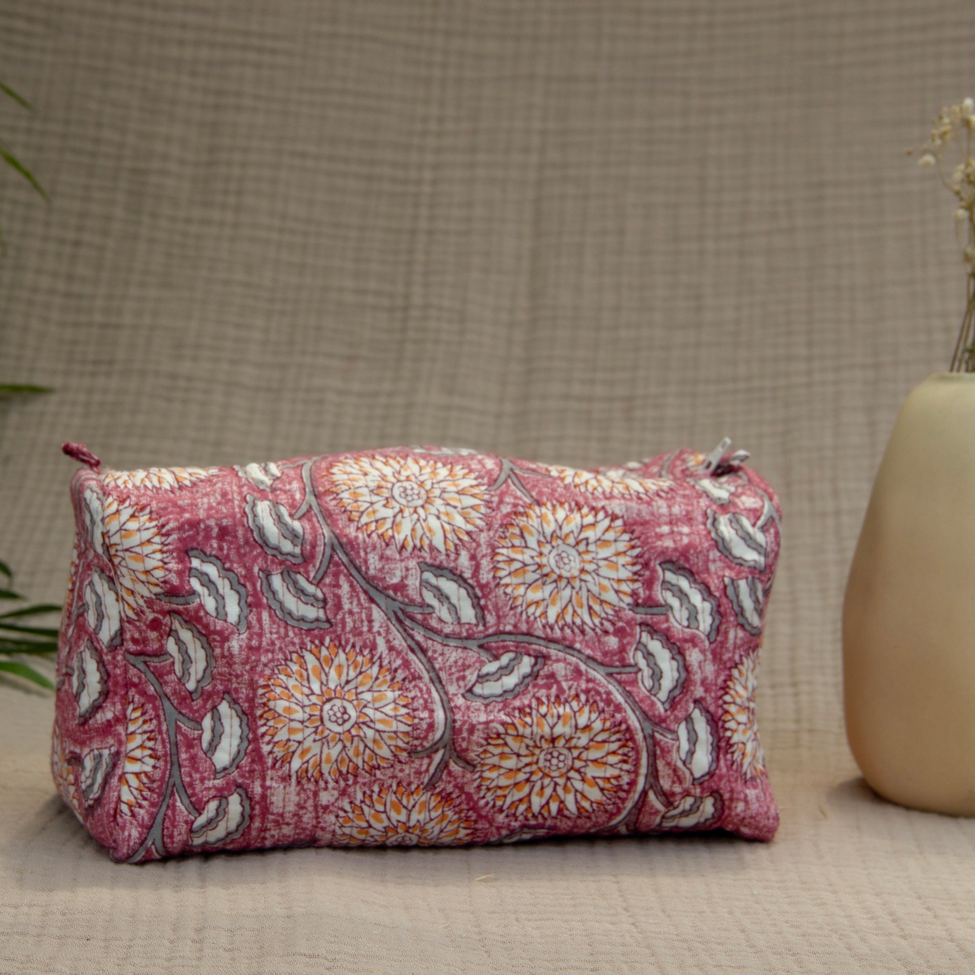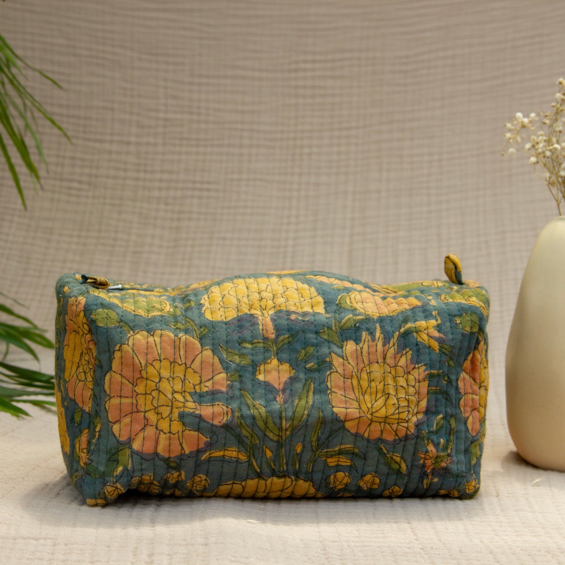 Hand-block printed toiletry pouches are cosmetic or travel bags that are decorated using a traditional block printing technique. These pouches have a waterproof lining, making them suitable for carrying toiletries, wet items, or other items that need to be protected from moisture. The combination of traditional block printing and modern materials make these pouches both stylish and practical, perfect for travel or everyday use.