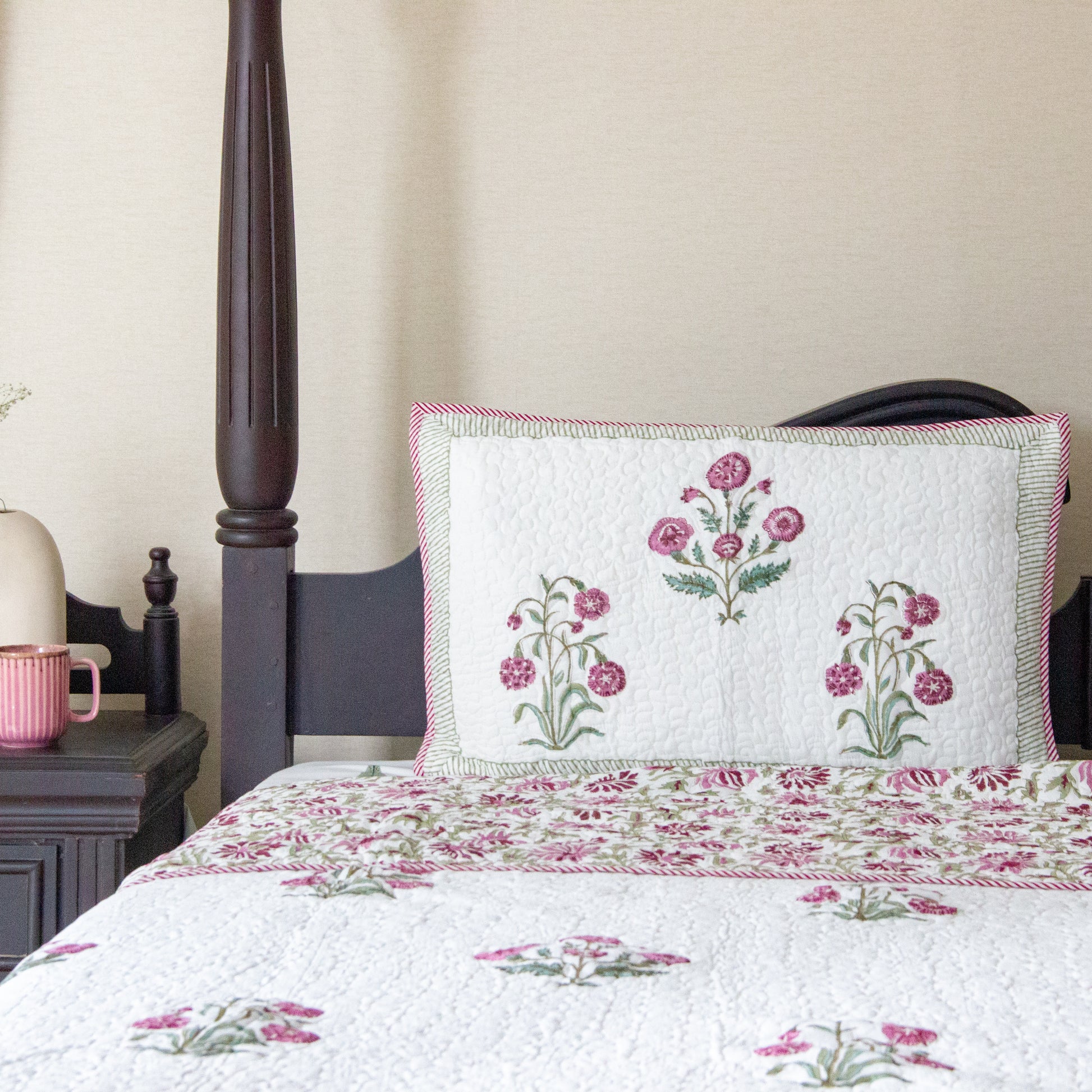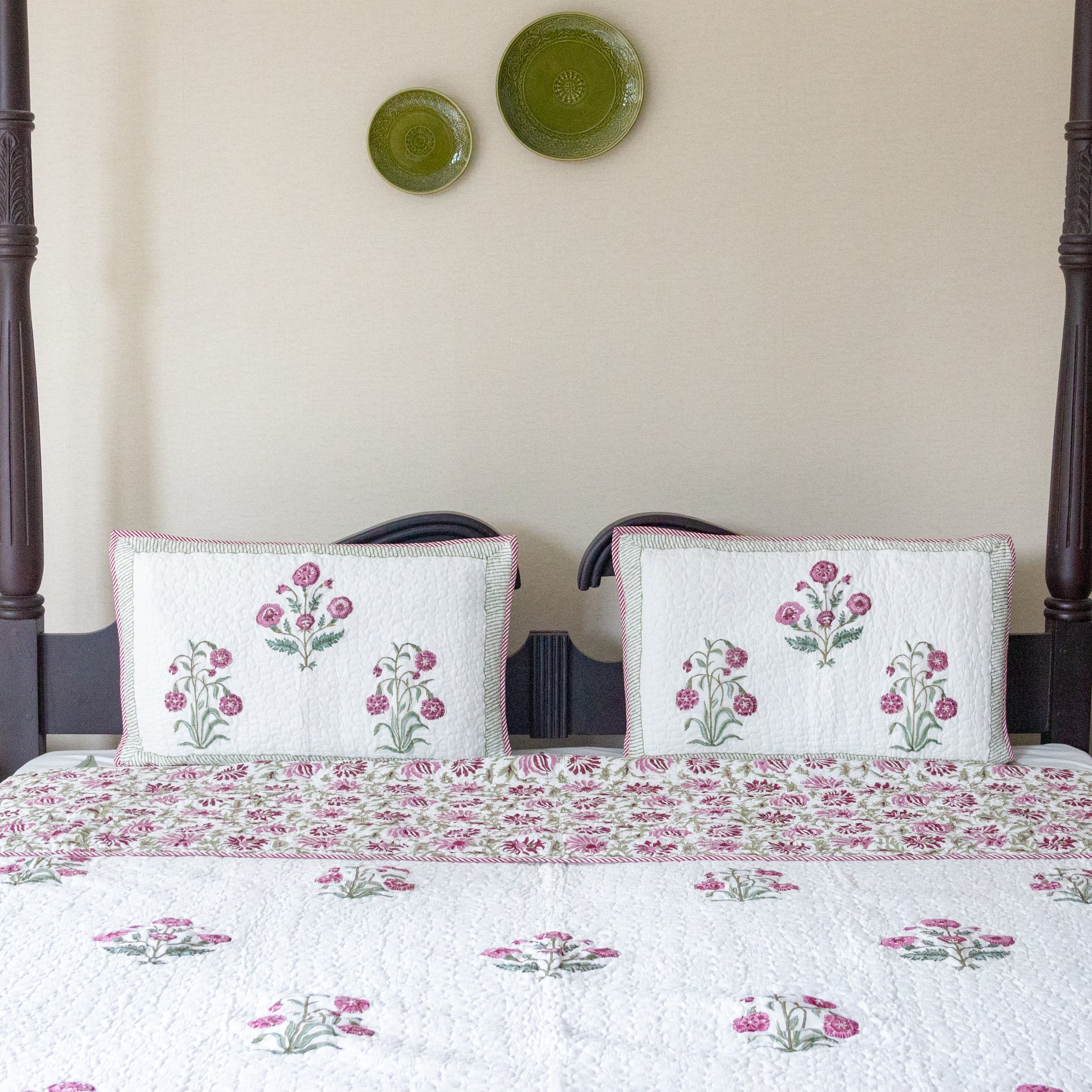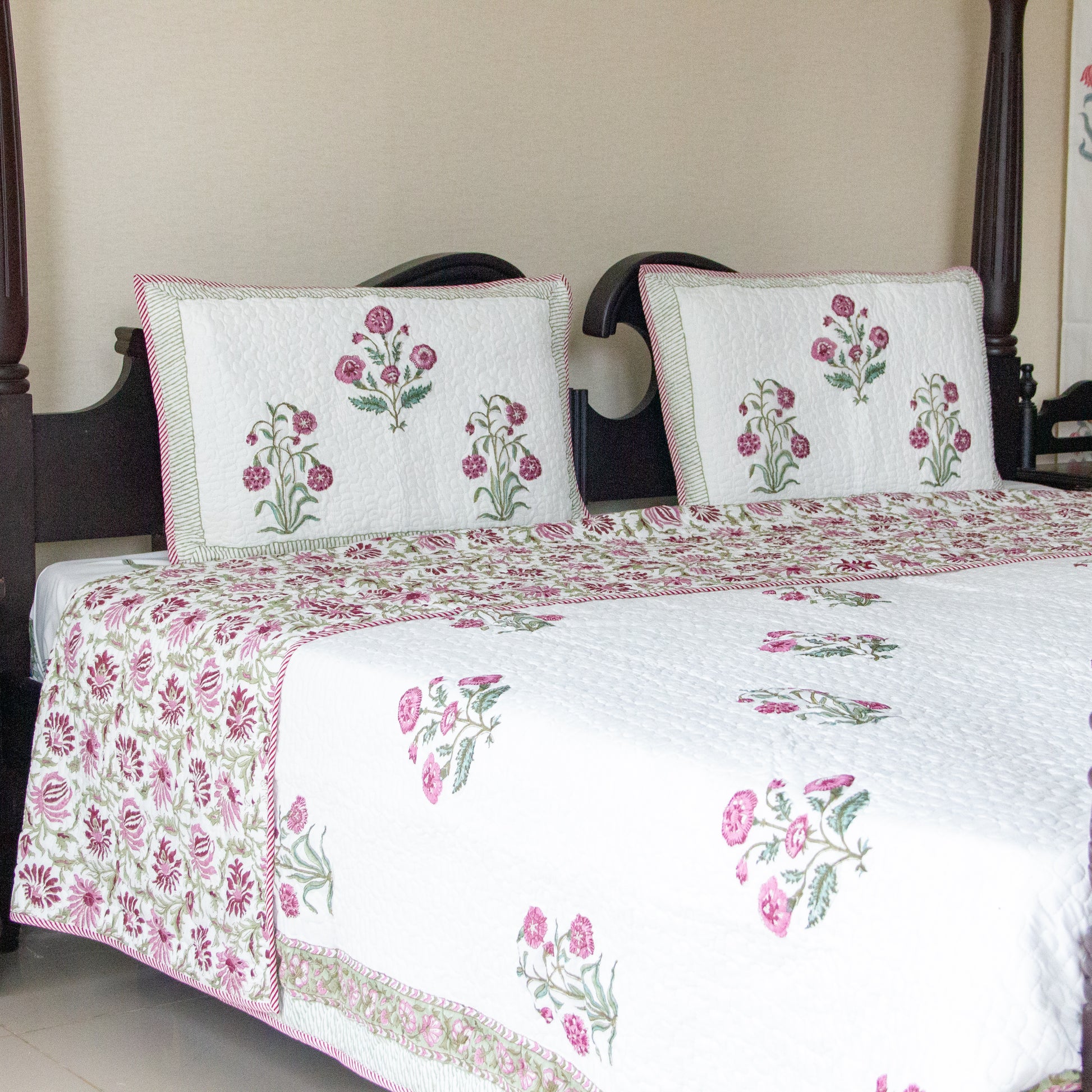 Reversible quilted bed covers are bedding accessories that are designed with a quilted construction, made by stitching together multiple layers of fabric to create a thick, warm cover that can be used to keep a bed cozy and comfortable. These bed covers have two different patterns or colours on each side, allowing you to switch up the look of your bedding depending on your mood or decor.