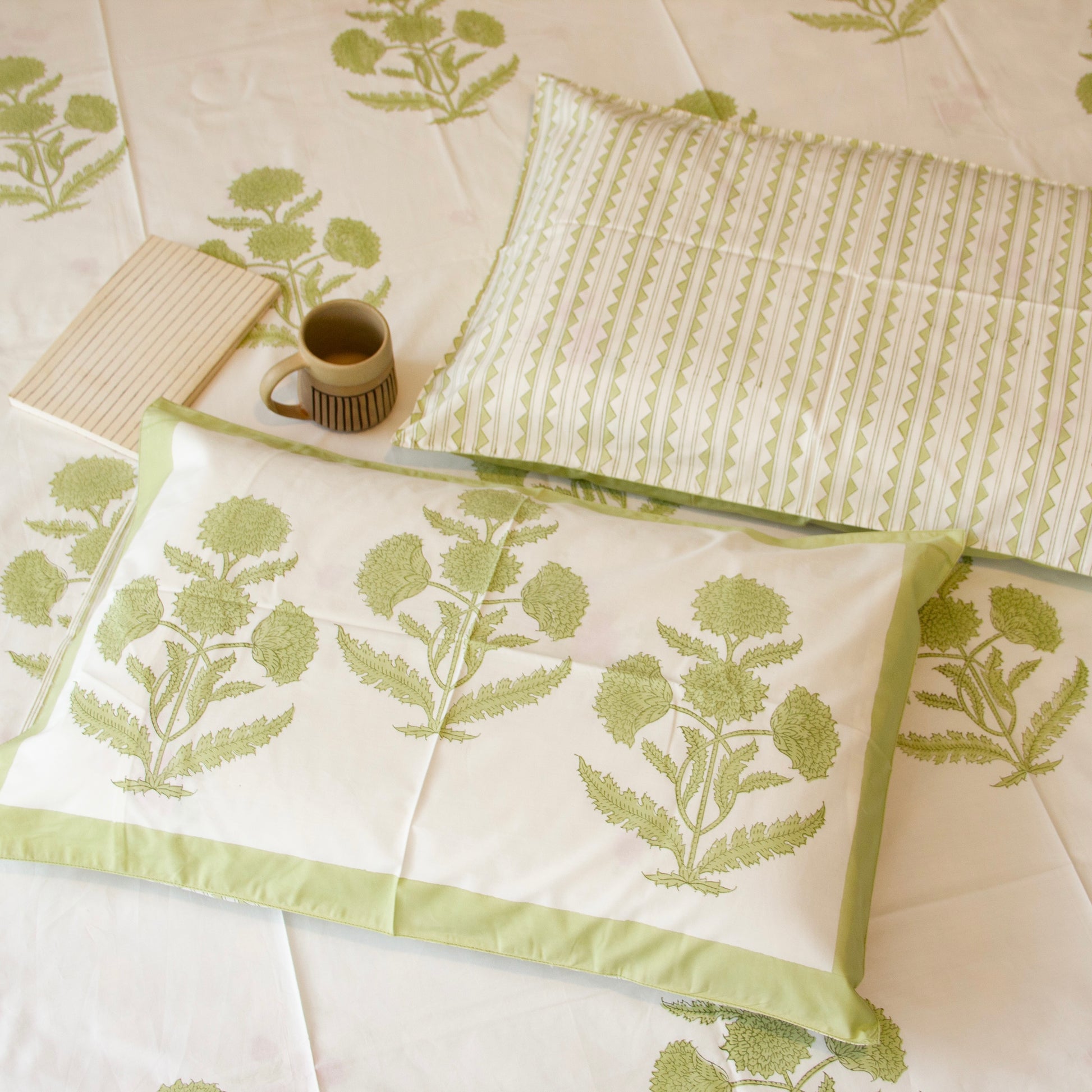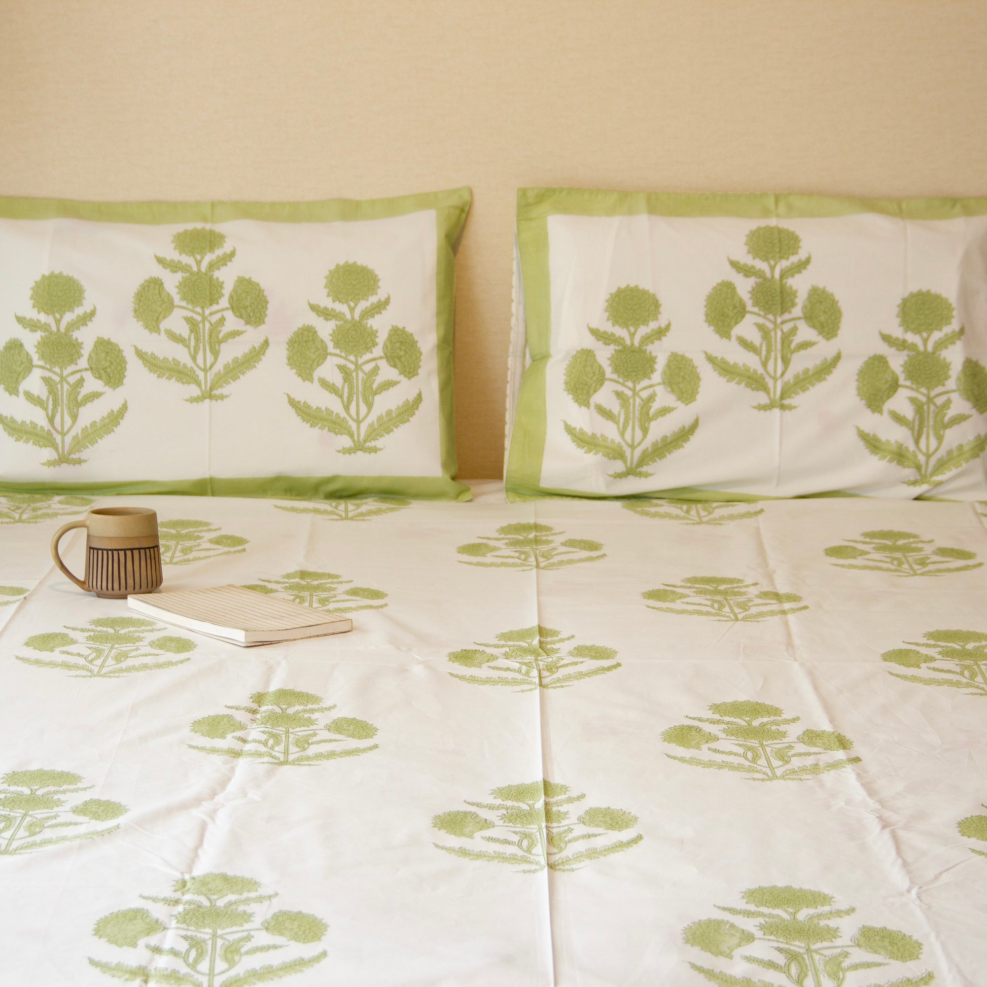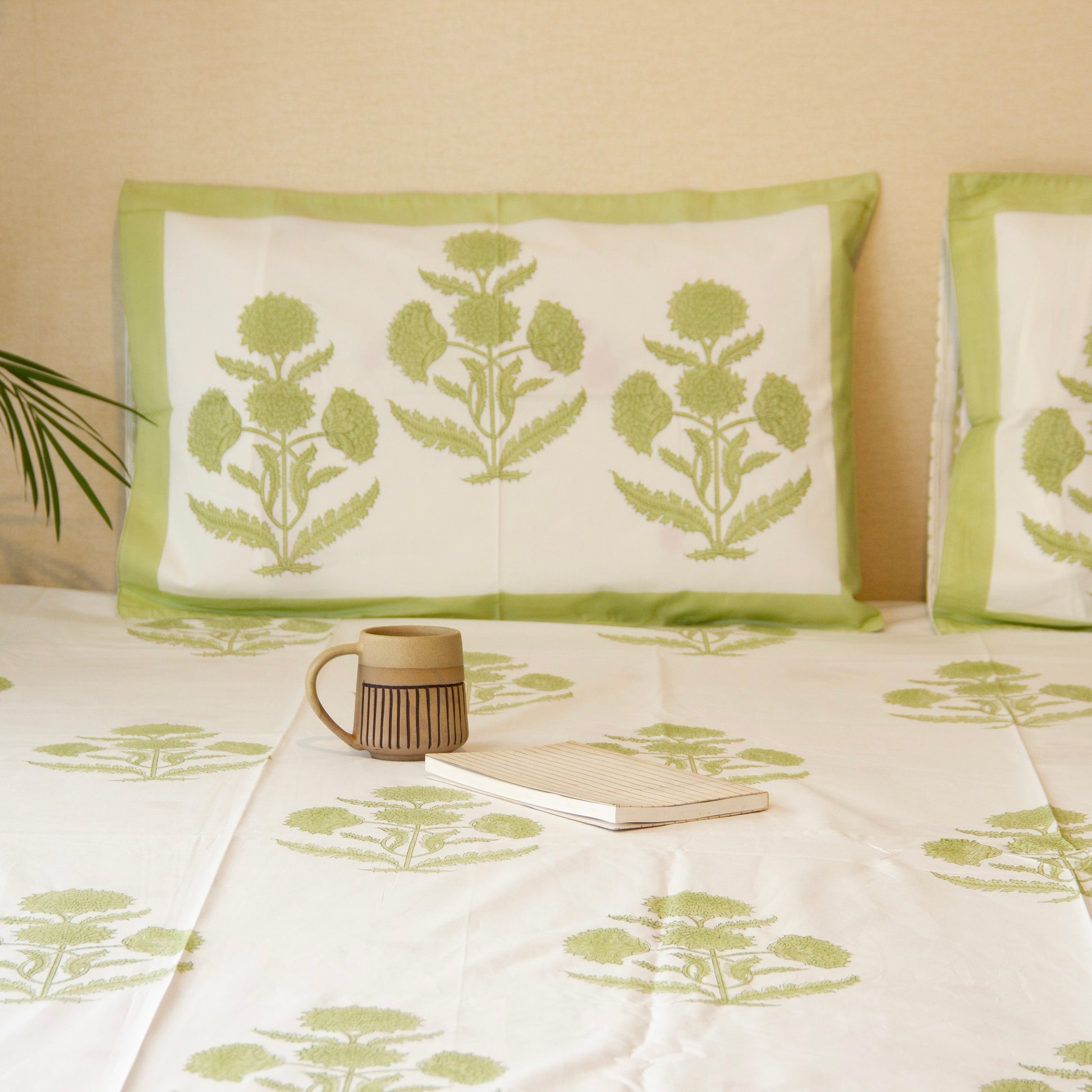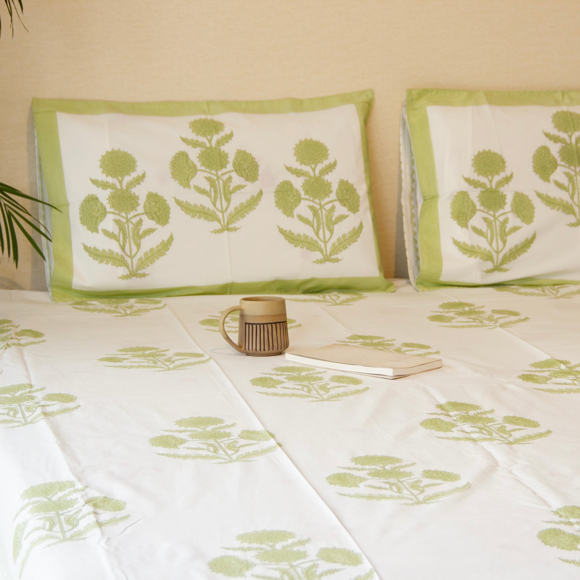 Hand block printed bedsheets are bed linens that are adorned with intricate designs created using a traditional printing method known as block printing. This process involves stamping a block made of wood or other materials with a design carved into it onto a piece of fabric, creating a pattern or motif that is repeated across the fabric.