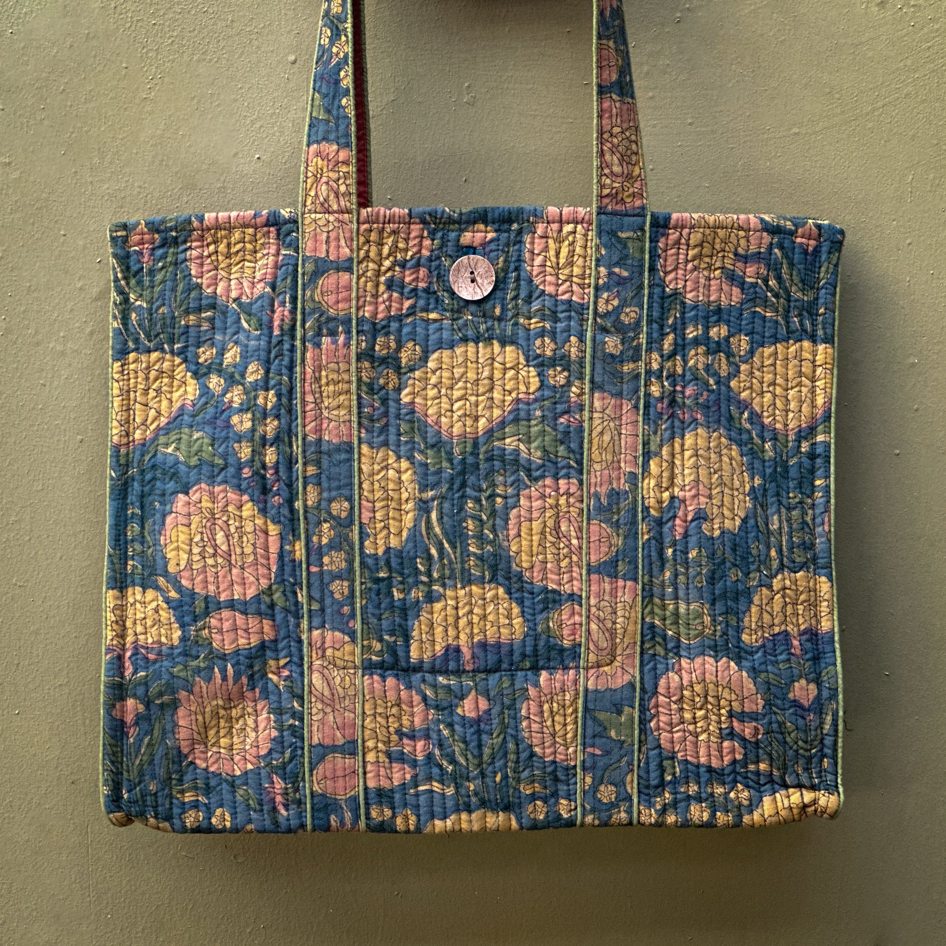 Tote bag features a unique combination of hand block printing and quilted design. It has an open style, making it easy to access your belongings. There are two pockets inside of added organization and storage. This tote is both stylish and functional, making it a great accessory for everyday use.