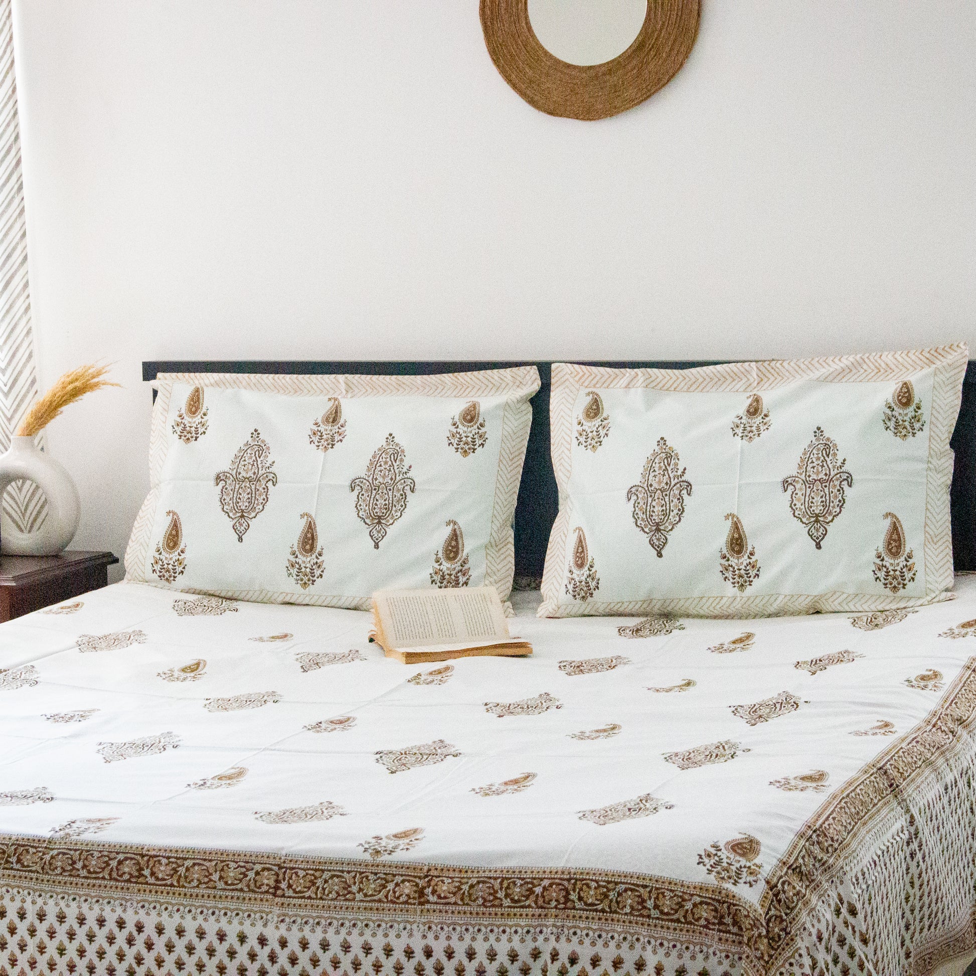 Hand block printed bedsheets are bed linens that are adorned with intricate designs created using a traditional printing method known as block printing. This process involves stamping a block made of wood or other materials with a design carved into it onto a piece of fabric, creating a pattern or motif that is repeated across the fabric.