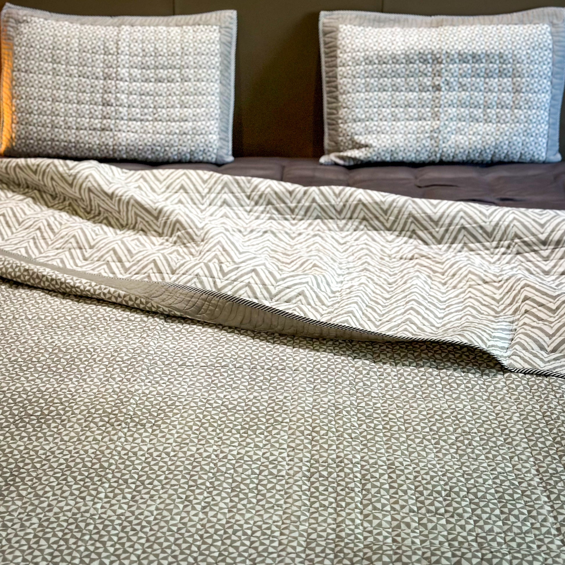 Reversible quilted bed covers are bedding accessories that are designed with a quilted construction, made by stitching together multiple layers of fabric to create a thick, warm cover that can be used to keep a bed cozy and comfortable. These bed covers have two different patterns or colours on each side, allowing you to switch up the look of your bedding depending on your mood or decor.