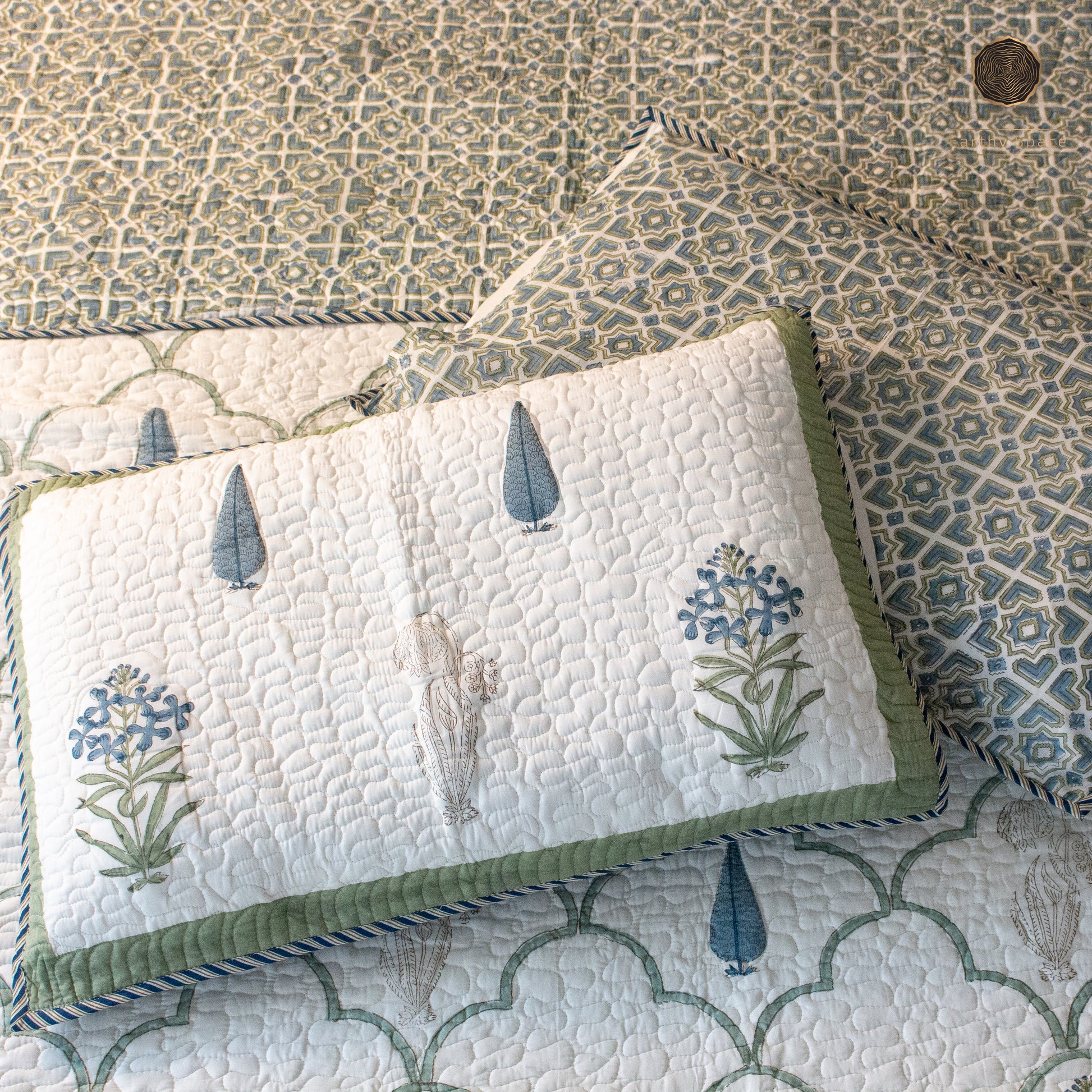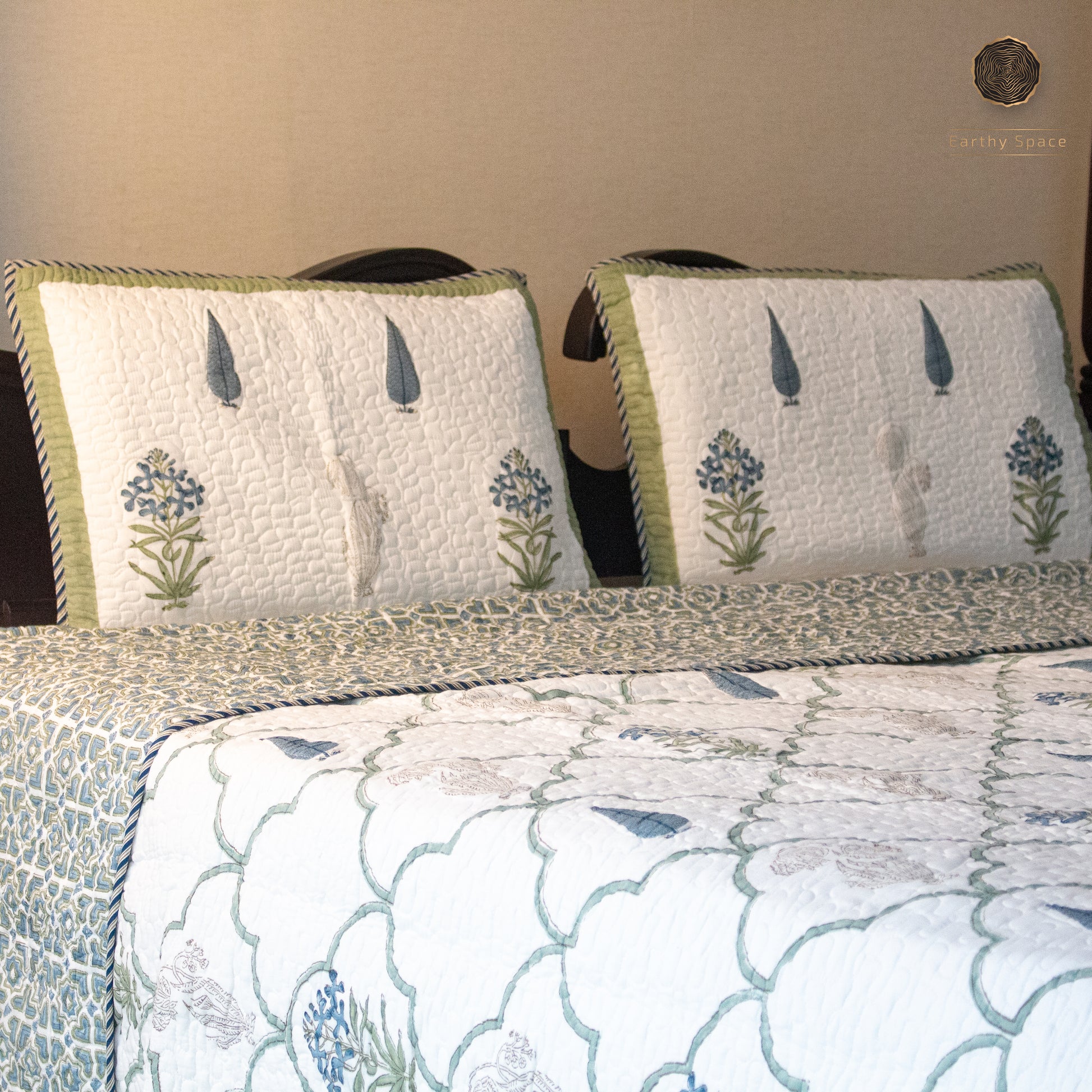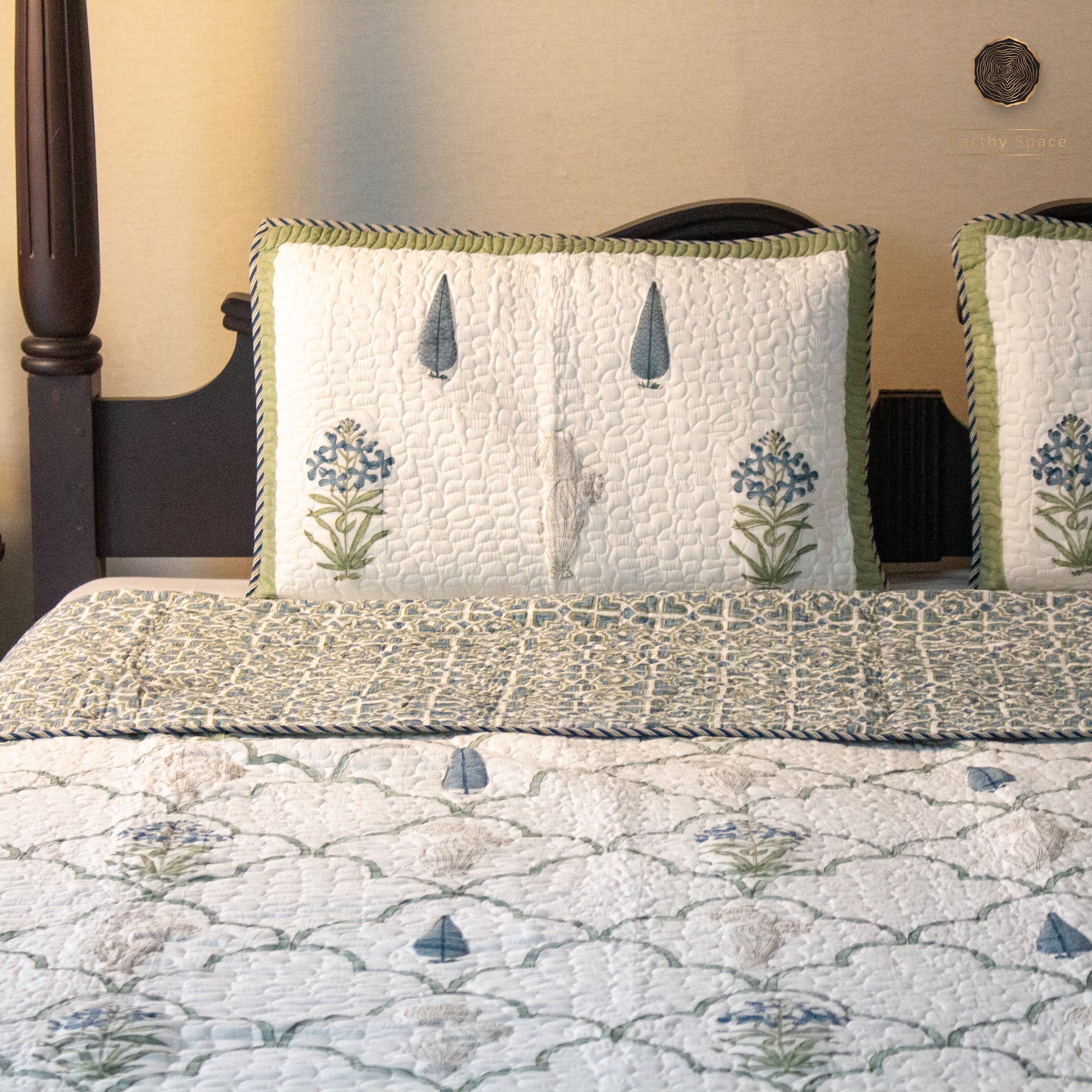 Sage Bloom - Hand Block Printed Quilted Bedspread