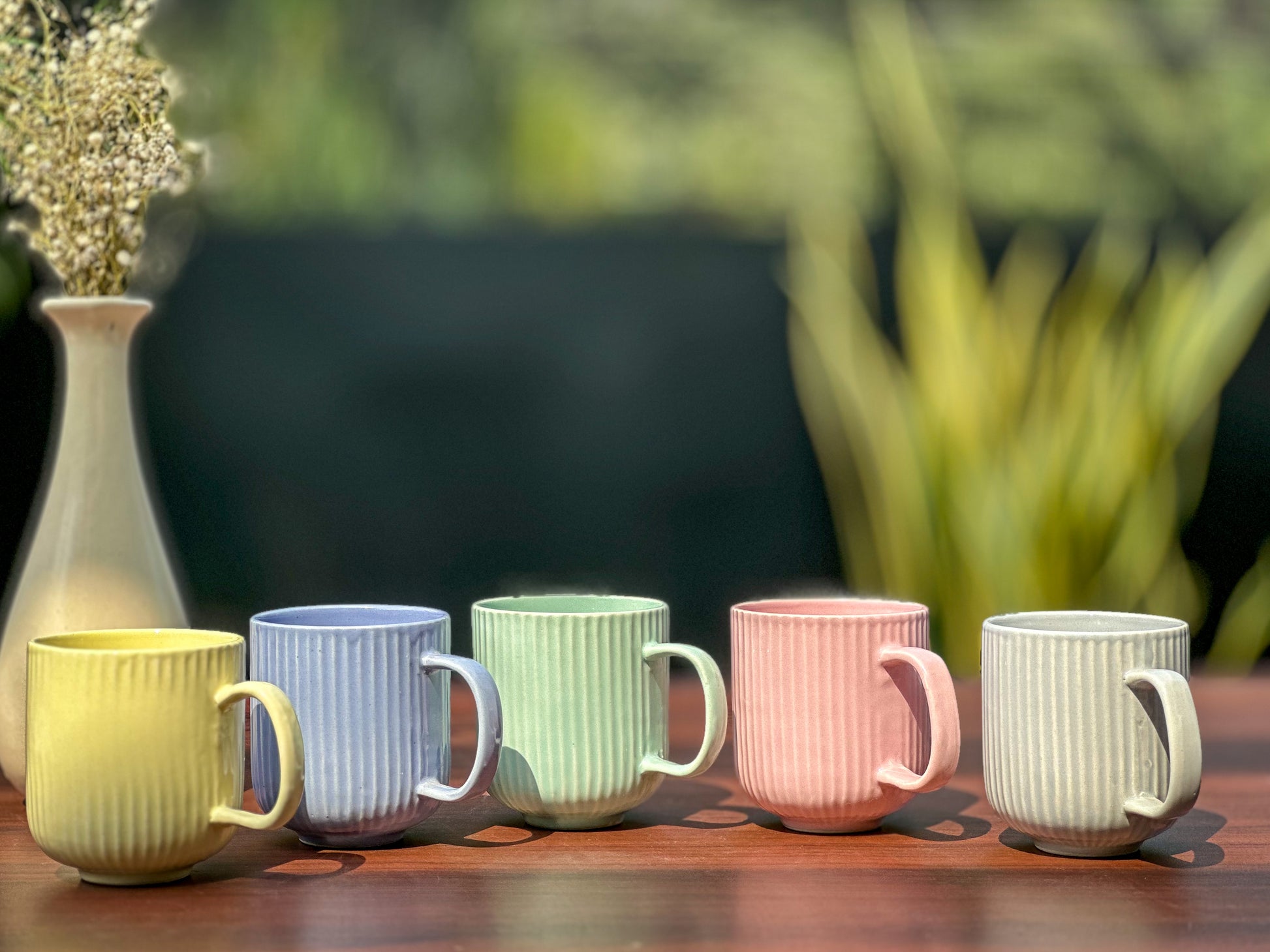 Pastel ceramic mugs are coffee or tea mugs made of ceramic material with a pastel-colored finish. These mugs are known for their soft, muted colors that are typically light and delicate in tone. They are often used for serving hot beverages such as coffee, tea, or hot chocolate.