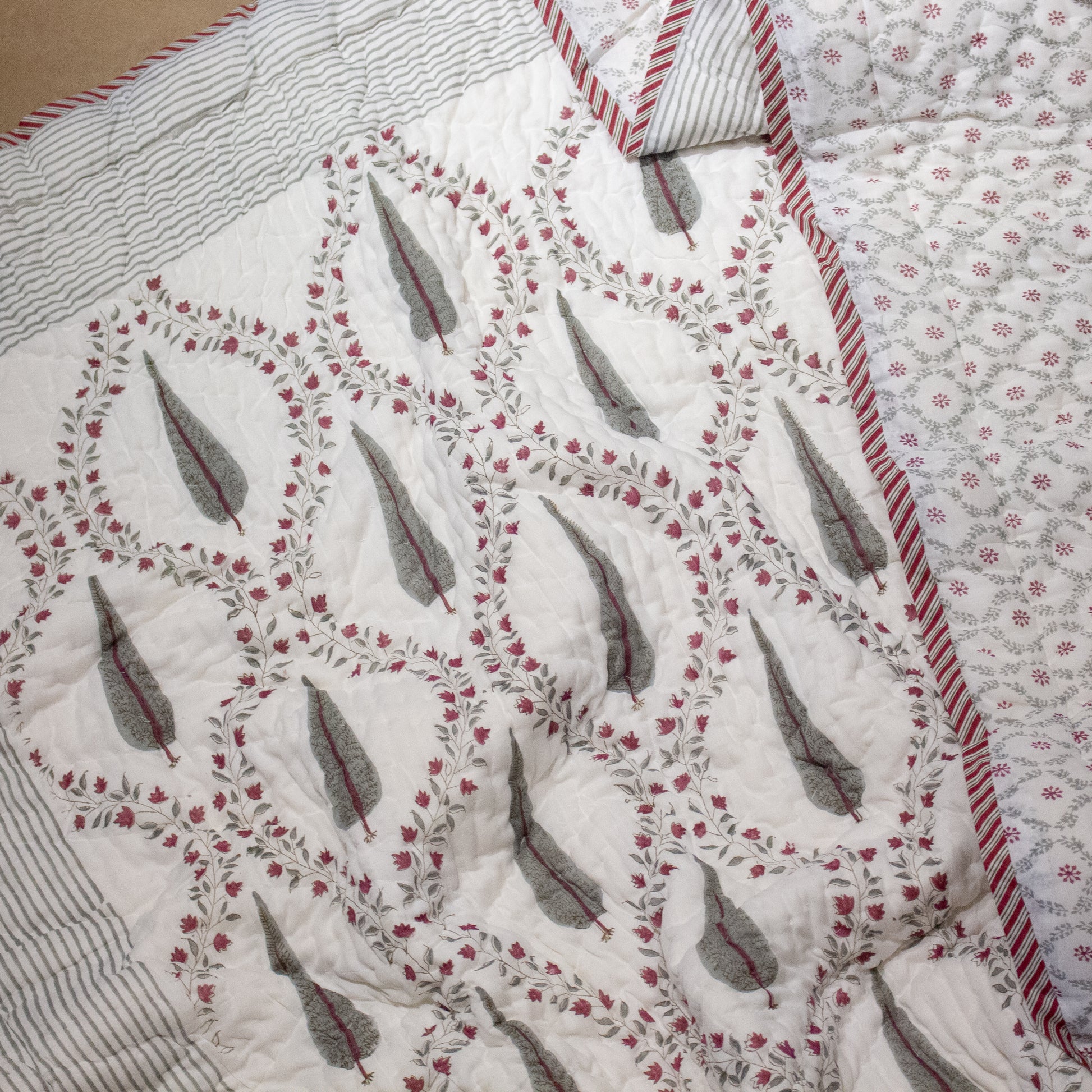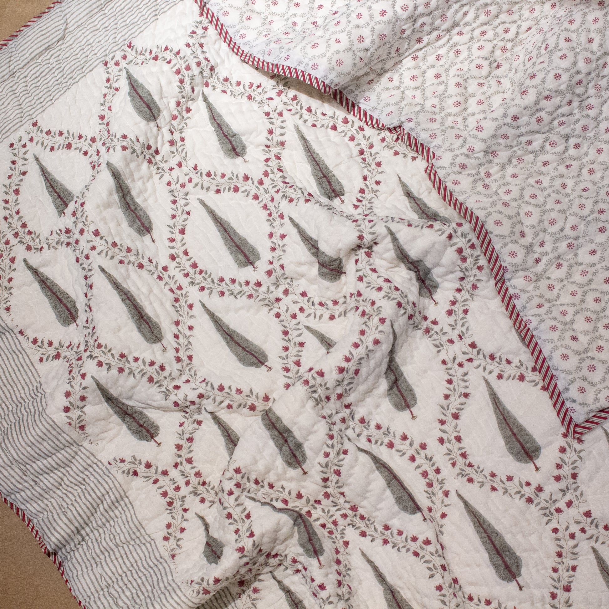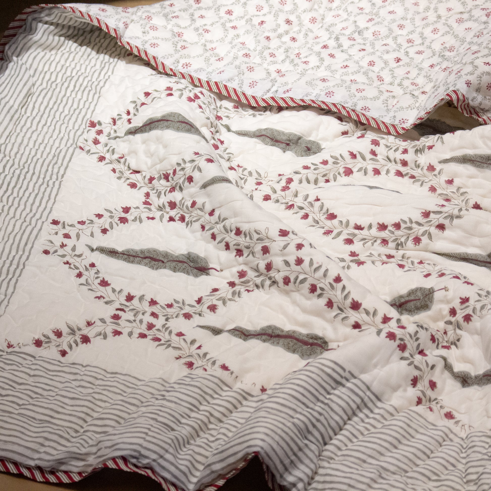Add a touch of warmth and charm to your space with this handcrafted quilt, featuring intricate handblock floral prints in soft yellows and blues. Finished with a peach-toned border and a playful reverse pattern, it brings effortless elegance and coziness to your bedroom.