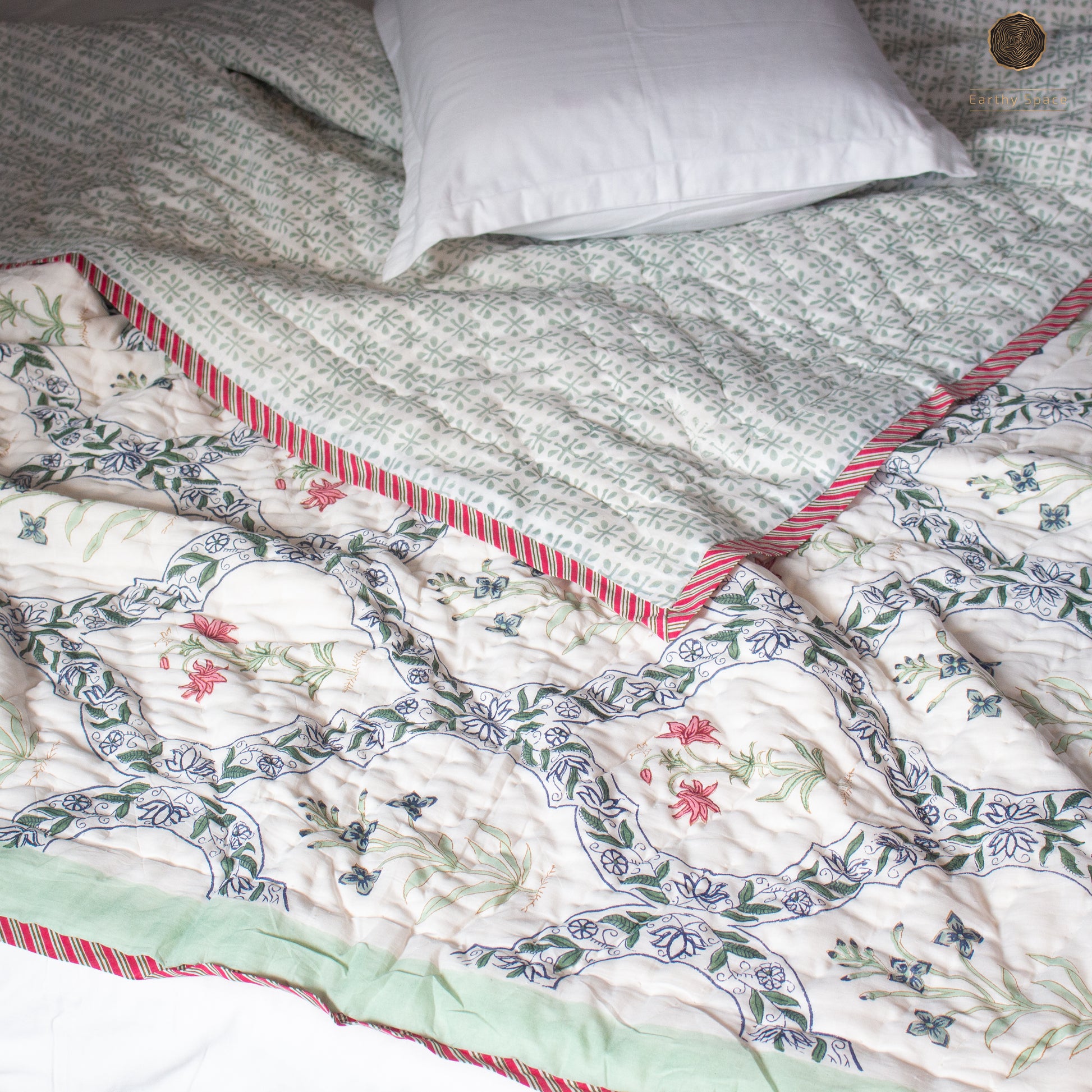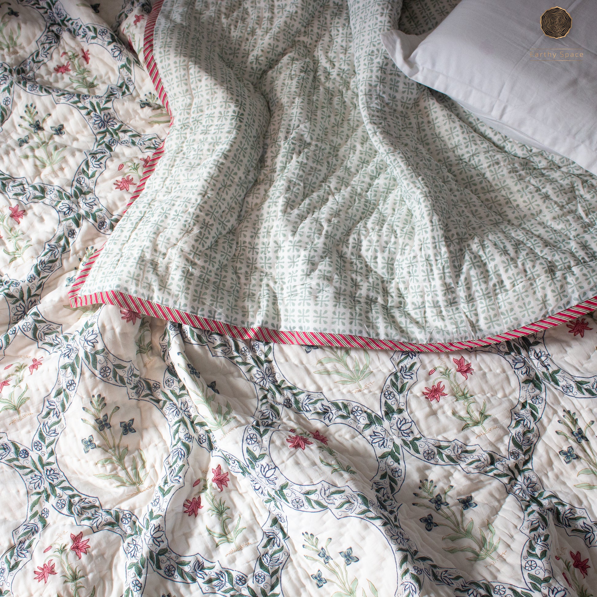 Add a touch of warmth and charm to your space with this handcrafted quilt, featuring intricate handblock floral prints in soft yellows and blues. Finished with a peach-toned border and a playful reverse pattern, it brings effortless elegance and coziness to your bedroom.
