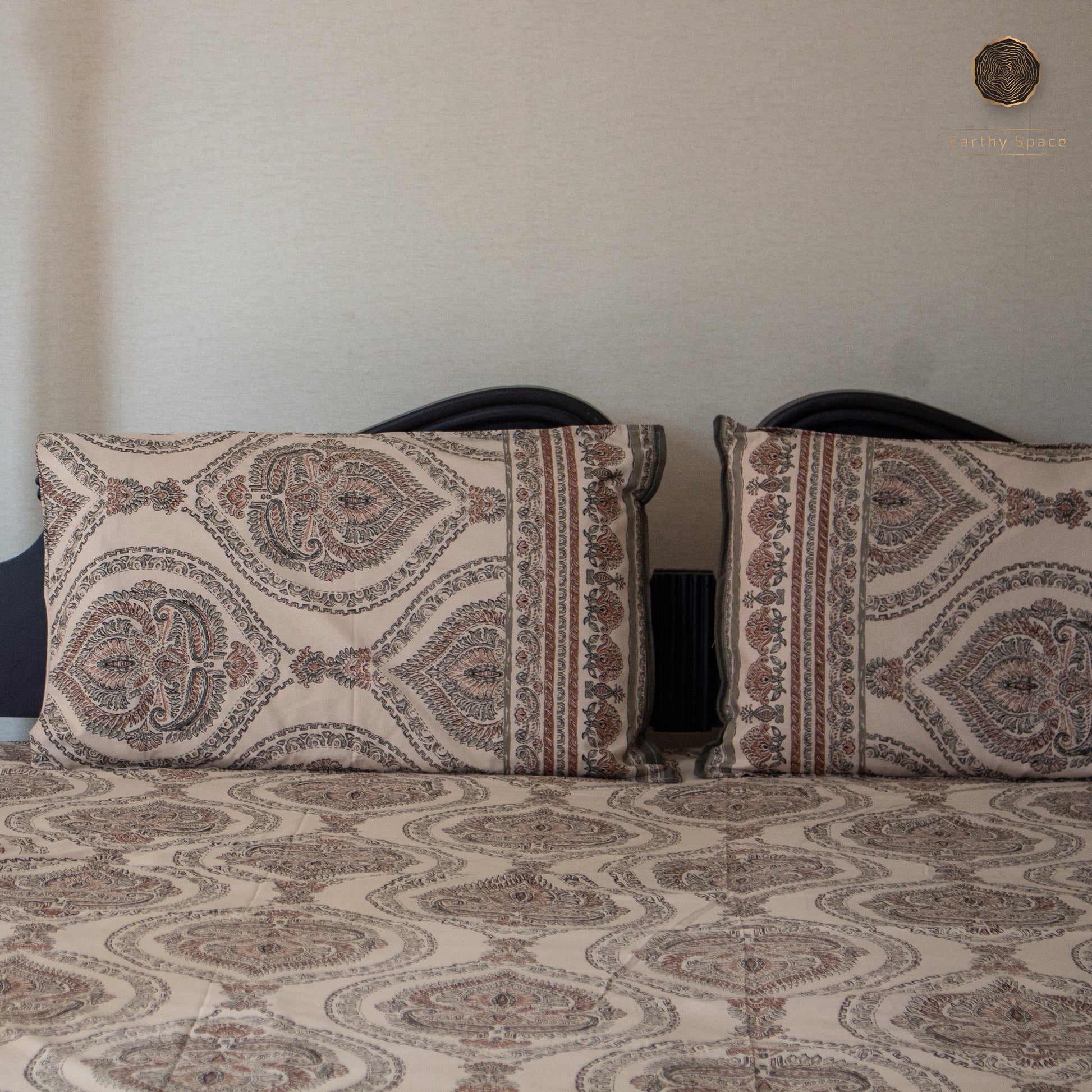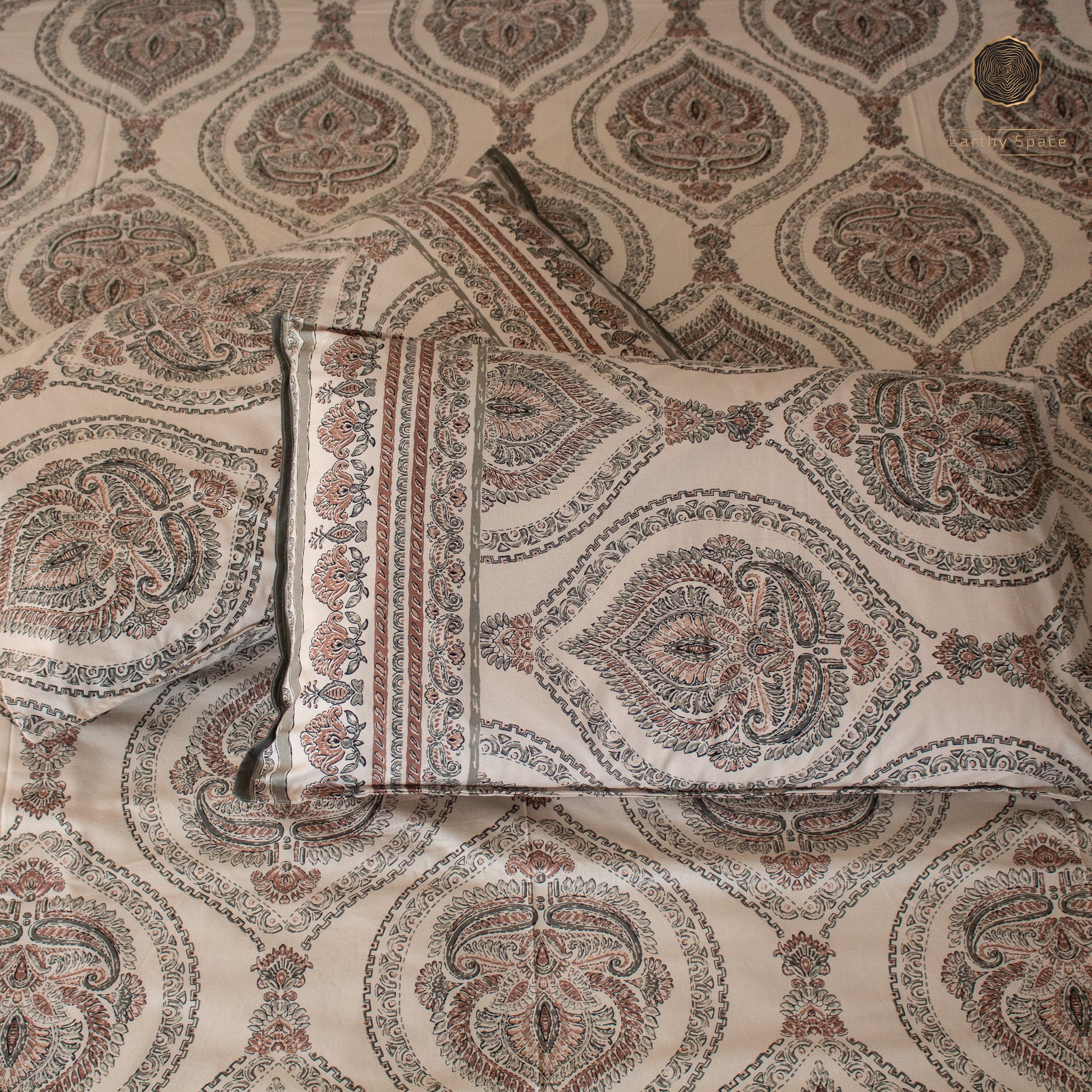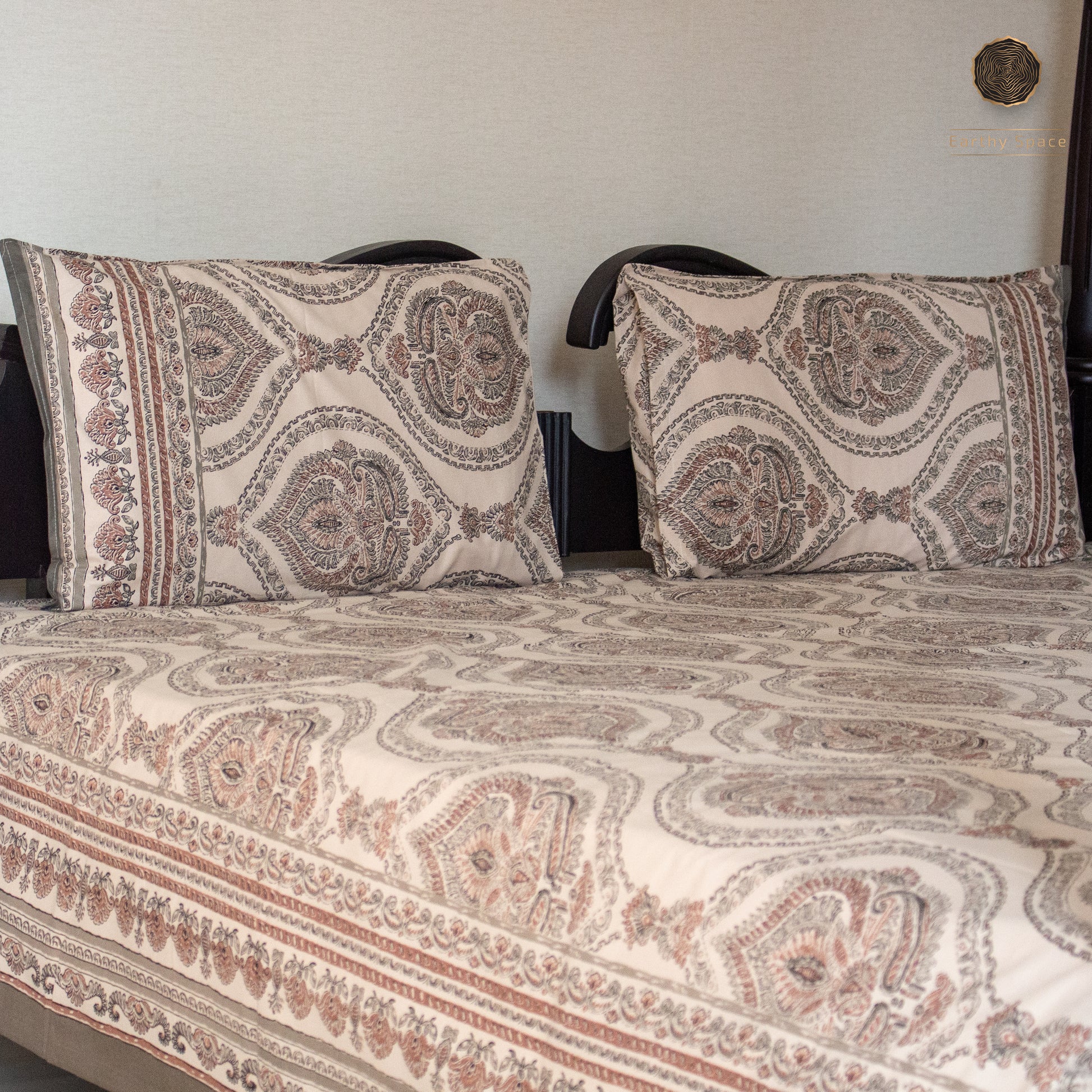 Bring home the timeless charm of Rajasthan with our Jaipuri-printed super king size bedsheet, designed for those who seek elegance without stretching their budget. Crafted from soft, breathable cotton and adorned with intricate paisley motifs in warm, earthy tones, this bedsheet blends everyday comfort with regal aesthetics.