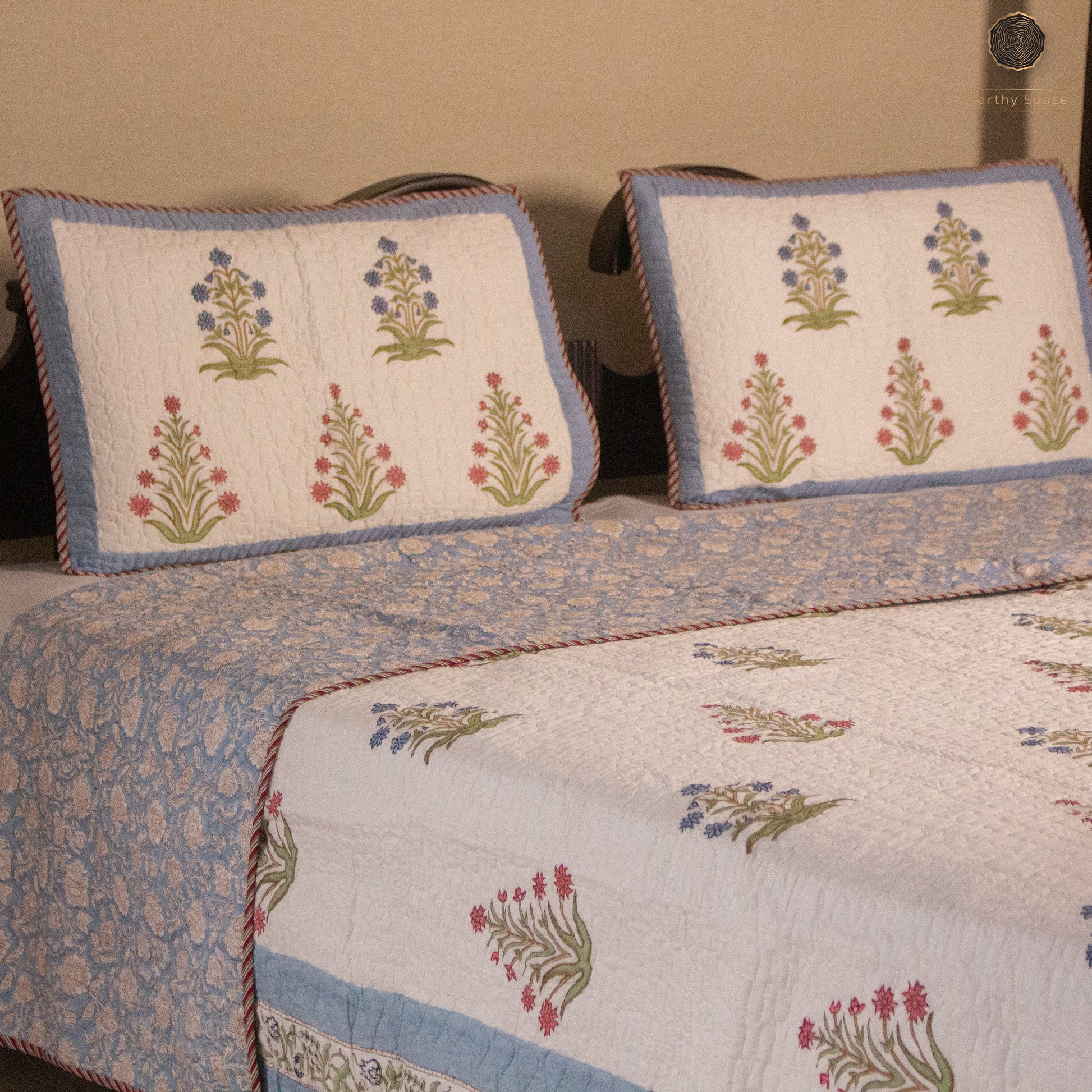 Reversible quilted bed covers are bedding accessories that are designed with a quilted construction, made by stitching together multiple layers of fabric to create a thick, warm cover that can be used to keep a bed cozy and comfortable. These bed covers have two different patterns or colours on each side, allowing you to switch up the look of your bedding depending on your mood or decor.