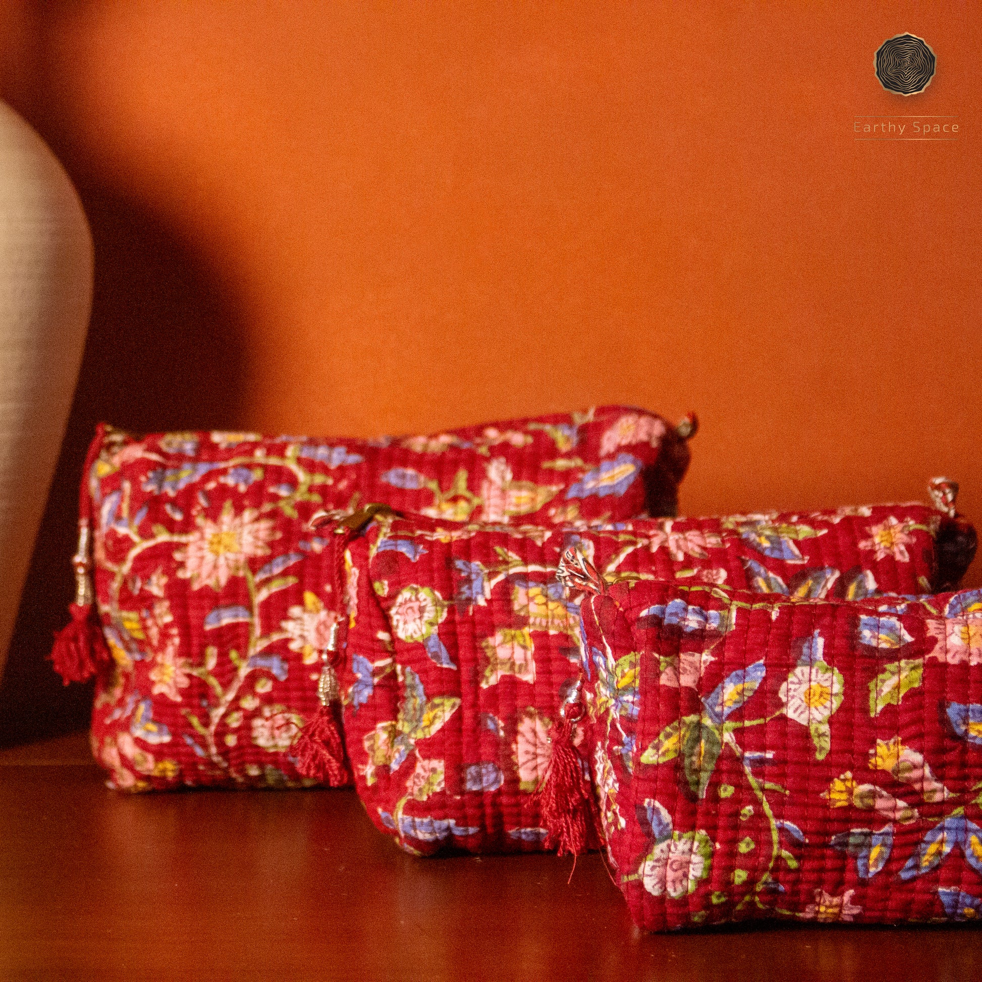 Hand-block printed toiletry pouches are cosmetic or travel bags that are decorated using a traditional block printing technique. These pouches have a waterproof lining, making them suitable for carrying toiletries, wet items, or other items that need to be protected from moisture. The combination of traditional block printing and modern materials make these pouches both stylish and practical, perfect for travel or everyday use.