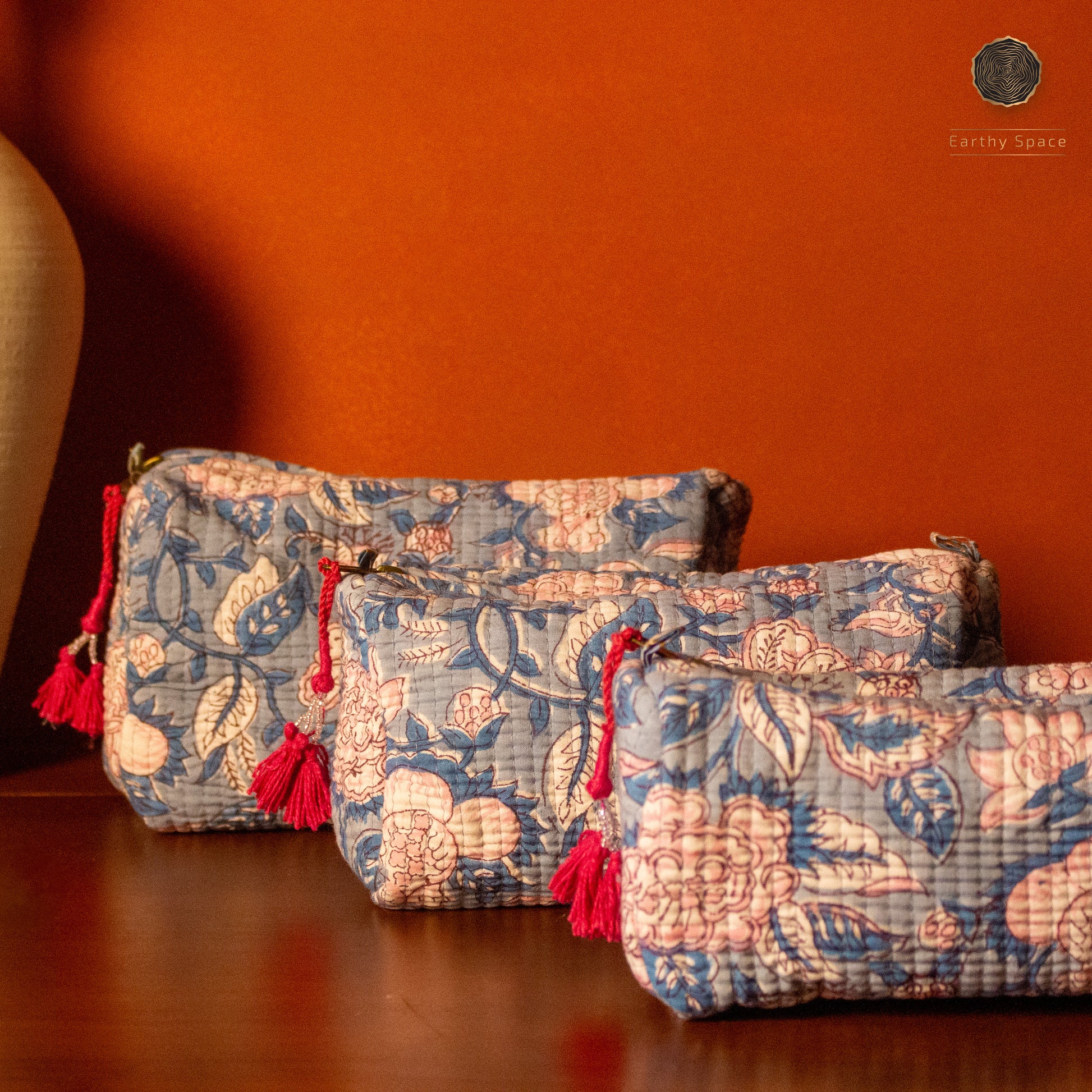 Hand-block printed toiletry pouches are cosmetic or travel bags that are decorated using a traditional block printing technique. These pouches have a waterproof lining, making them suitable for carrying toiletries, wet items, or other items that need to be protected from moisture. The combination of traditional block printing and modern materials make these pouches both stylish and practical, perfect for travel or everyday use.