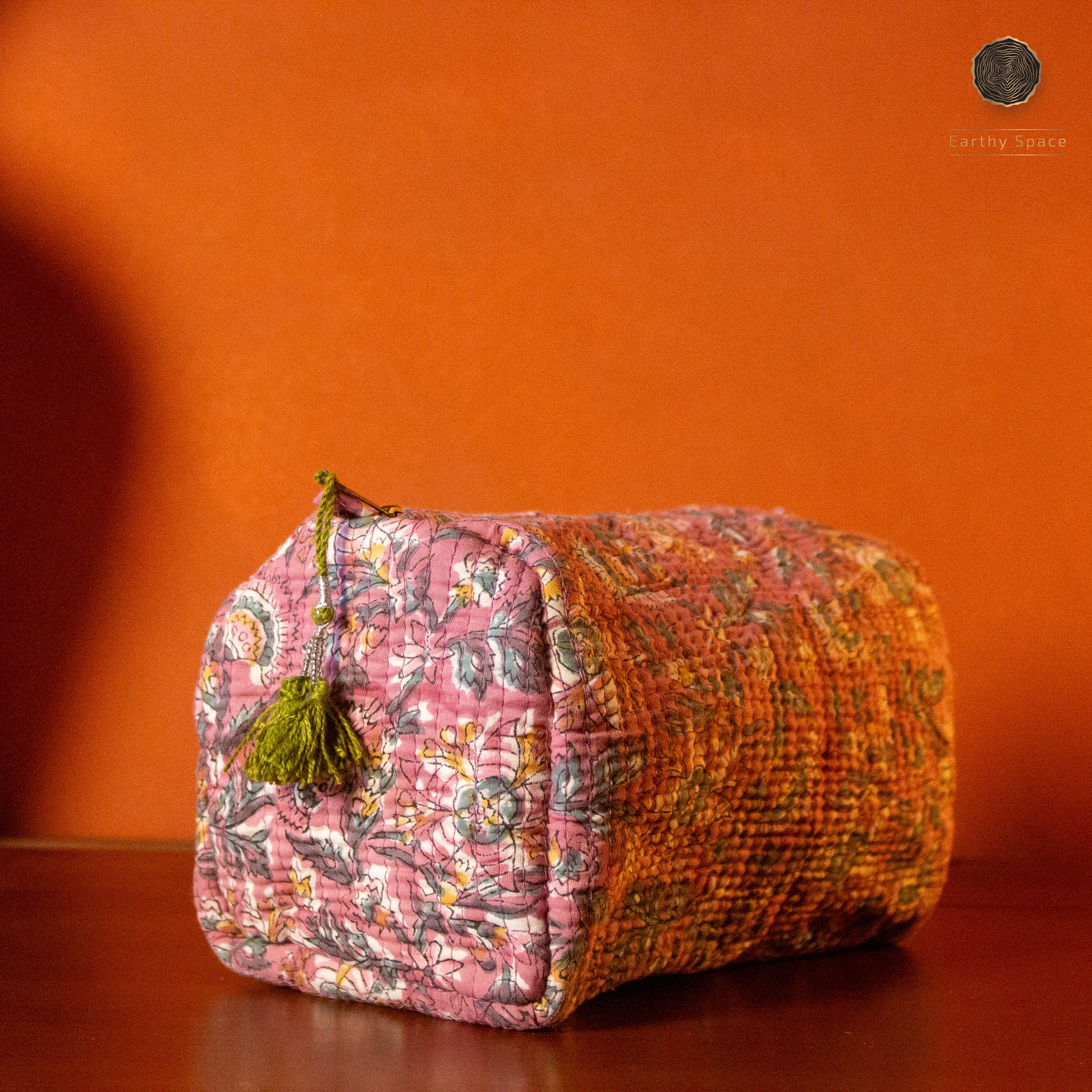 Hand-block printed toiletry pouches are cosmetic or travel bags that are decorated using a traditional block printing technique. These pouches have a waterproof lining, making them suitable for carrying toiletries, wet items, or other items that need to be protected from moisture. The combination of traditional block printing and modern materials make these pouches both stylish and practical, perfect for travel or everyday use.
