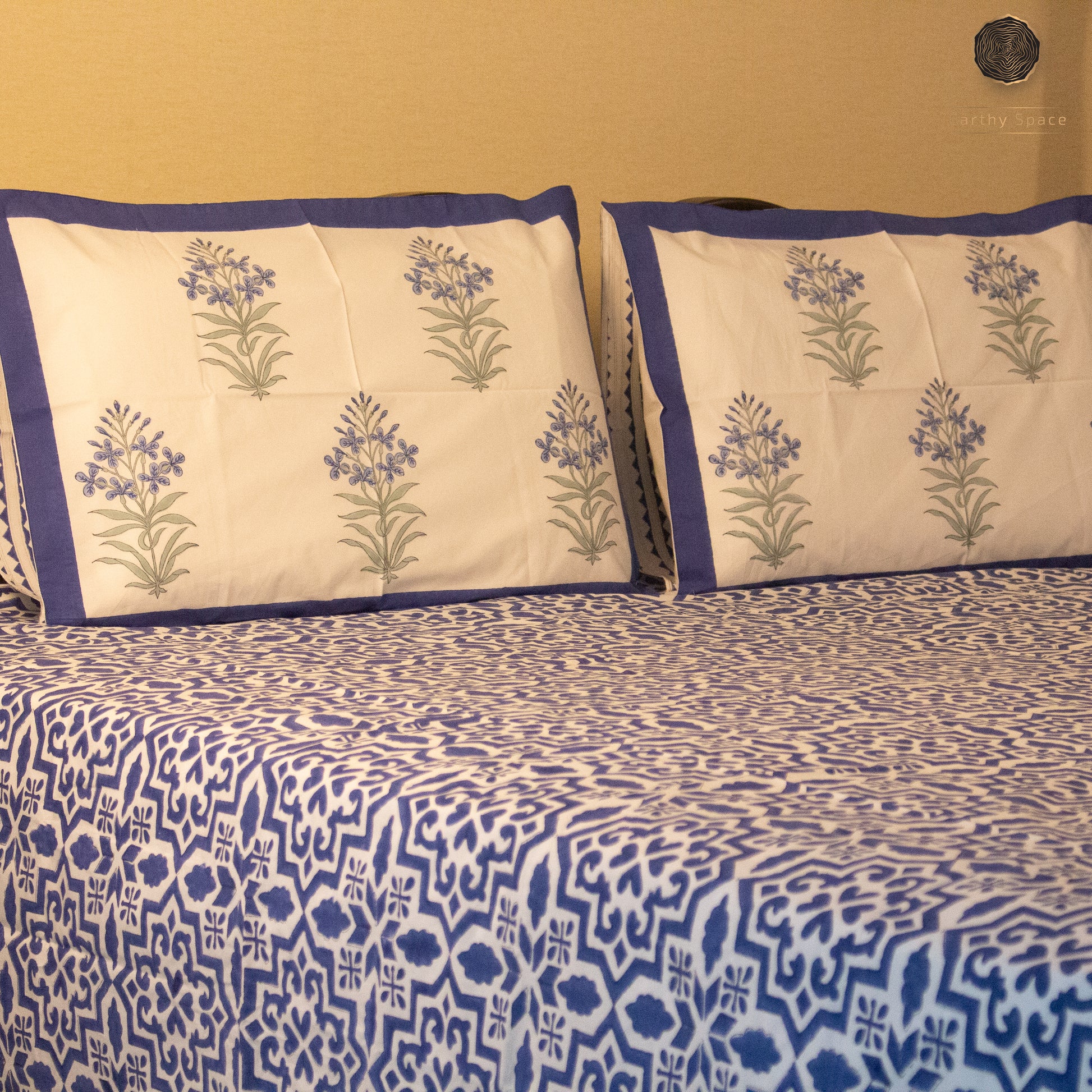 Hand block printed bedsheets are bed linens that are adorned with intricate designs created using a traditional printing method known as block printing. This process involves stamping a block made of wood or other materials with a design carved into it onto a piece of fabric, creating a pattern or motif that is repeated across the fabric.